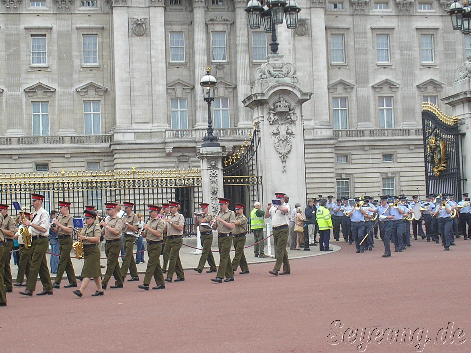 영국 왕실가족이 여기 산단 말이지?? 버킹엄 궁, 말을 탄 경비병, 노래연습하는 근위대, 낫을 들고 있는 여자 동상, 저 멀리 보이는 런던 아이, 아직도 내가 영국인게 실감이 안난다.