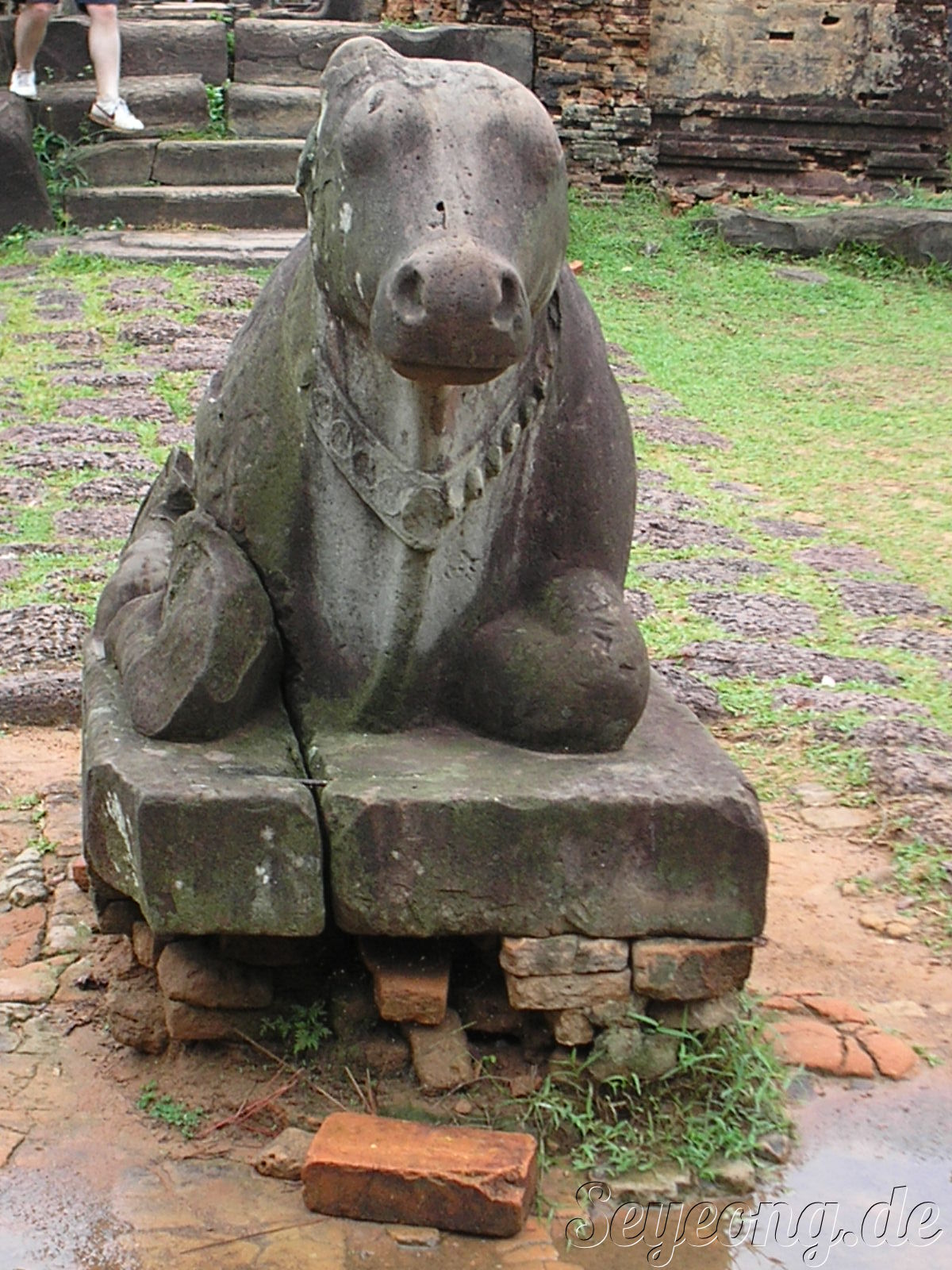 사원 앞에는 얼굴이 마모된 소 상이 절을 하듯 놓여 있다.