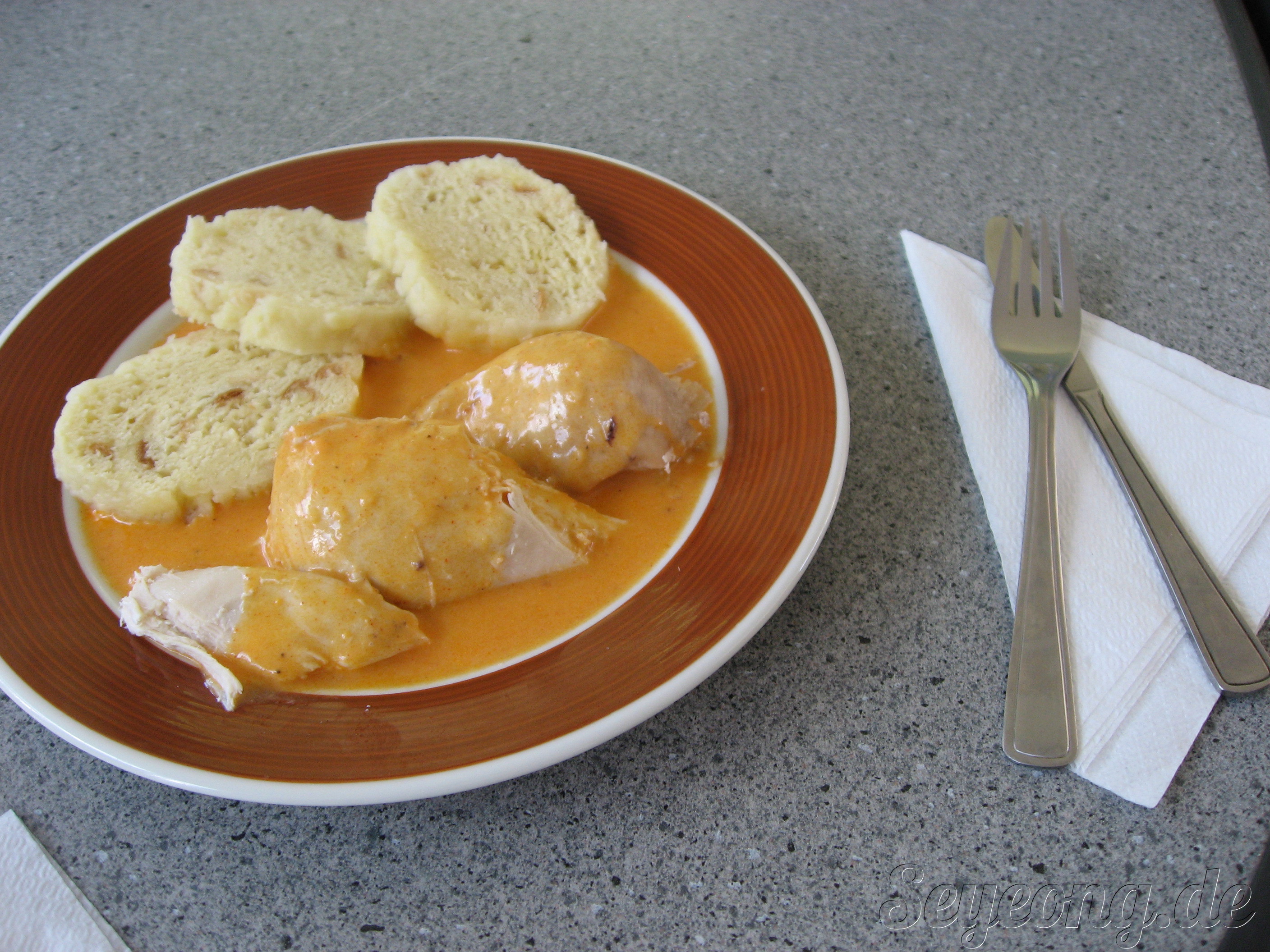 전통 체코식 요리. 감자로 만든 떡과 치킨 요리에 소스가 있다.