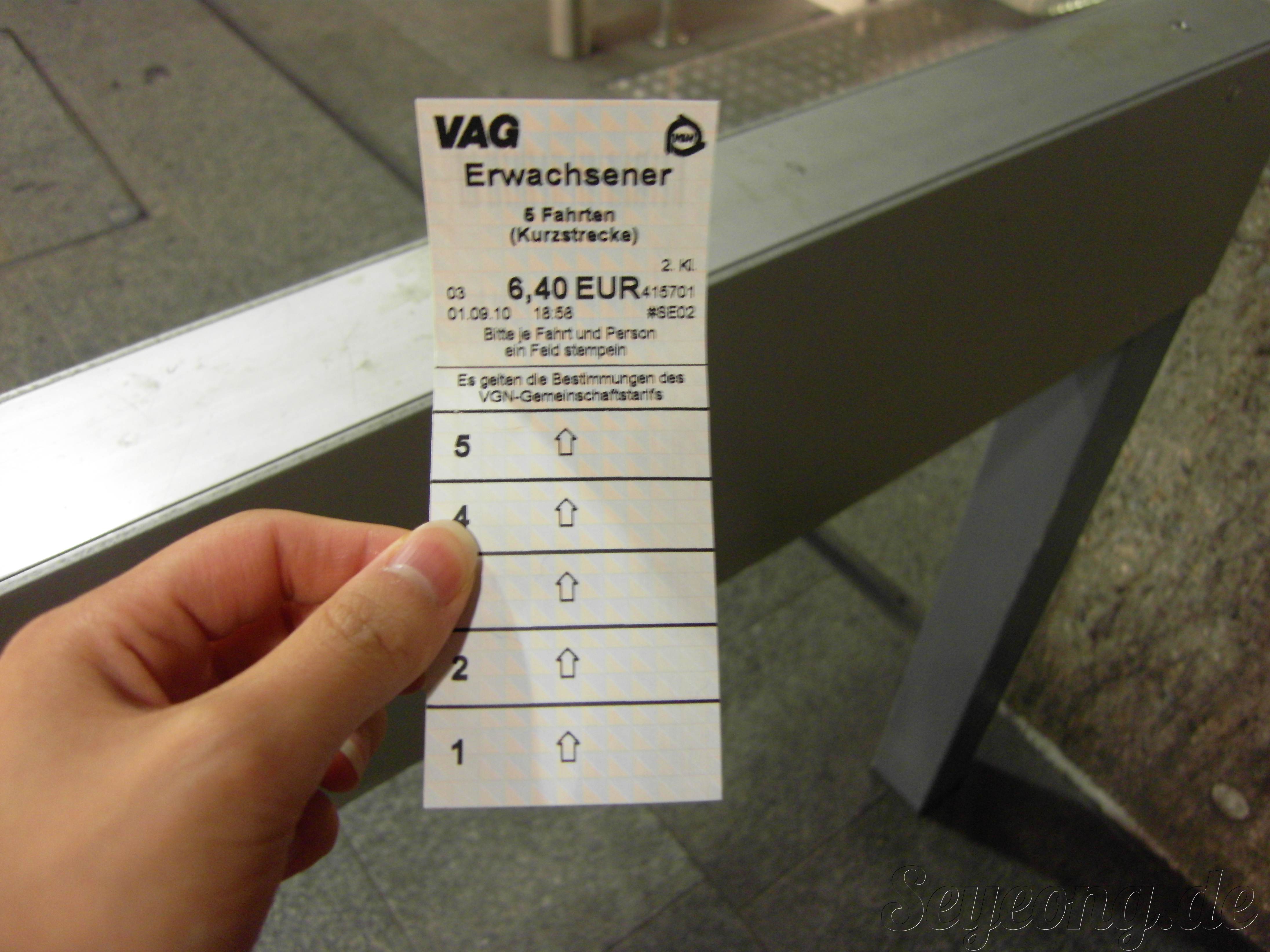뉘른 베르크에서 처음 산 5번 사용할 수 있는 티켓이다. 티켓의 종류에 따라 보다 작은 구간, 아님 더 넓은 구간을 사용할 수 있는 티켓을 머신을 통해 구입할 수 있다.