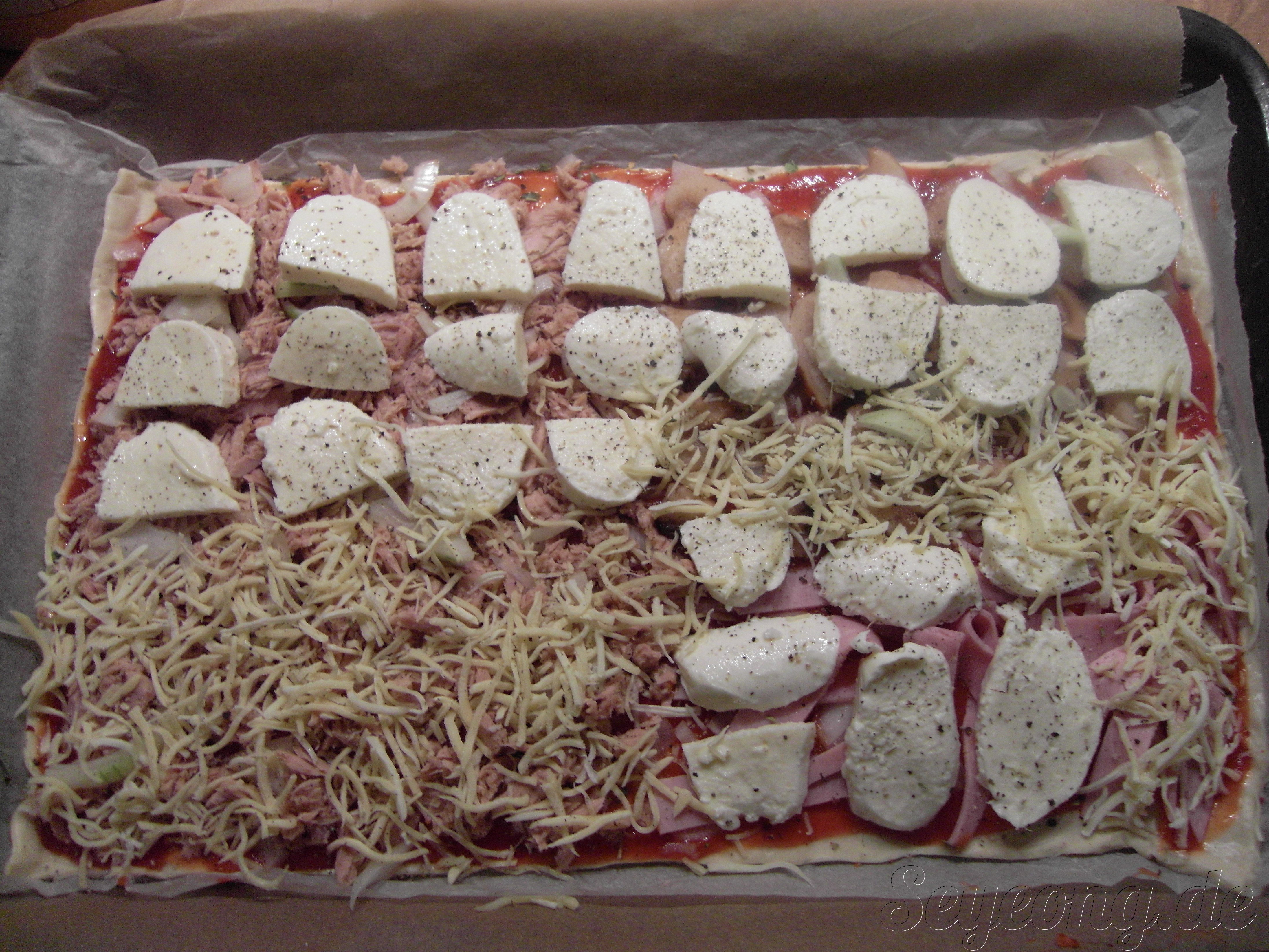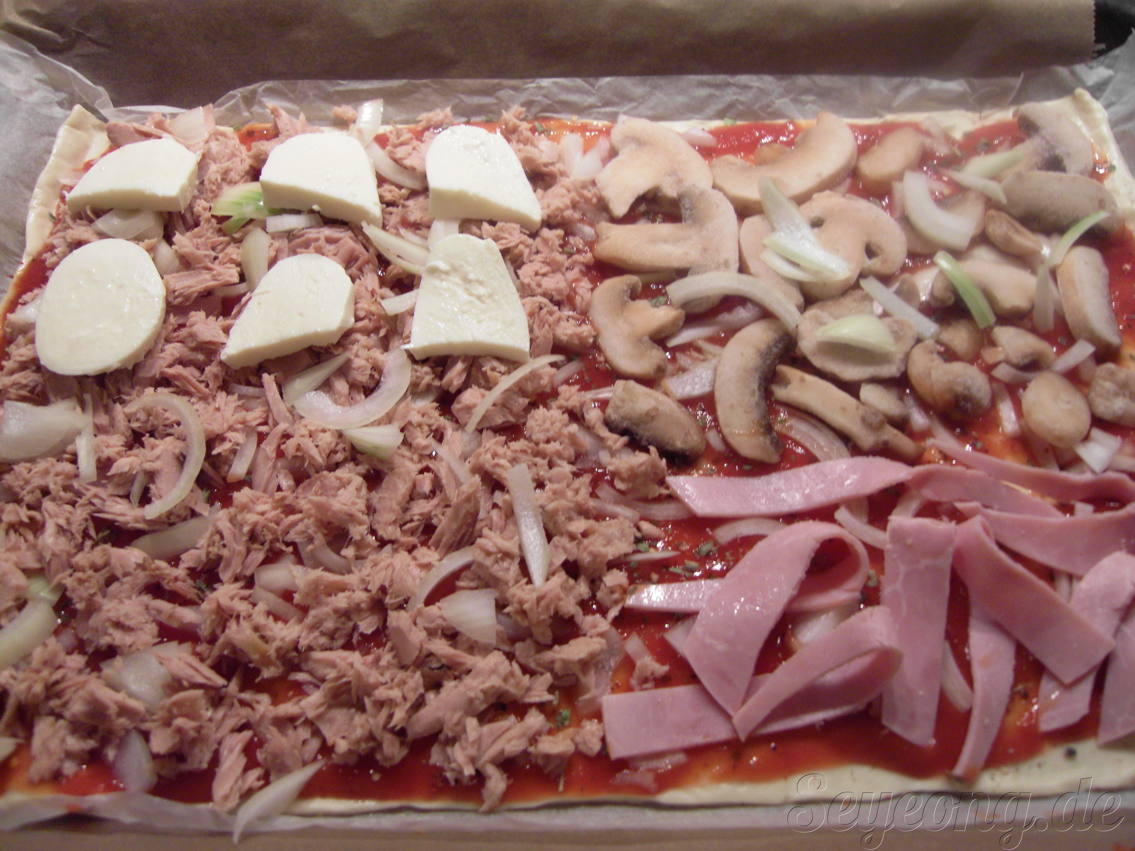 참치+양파, 치즈, 햄, 버섯 등의 토핑을 올리고