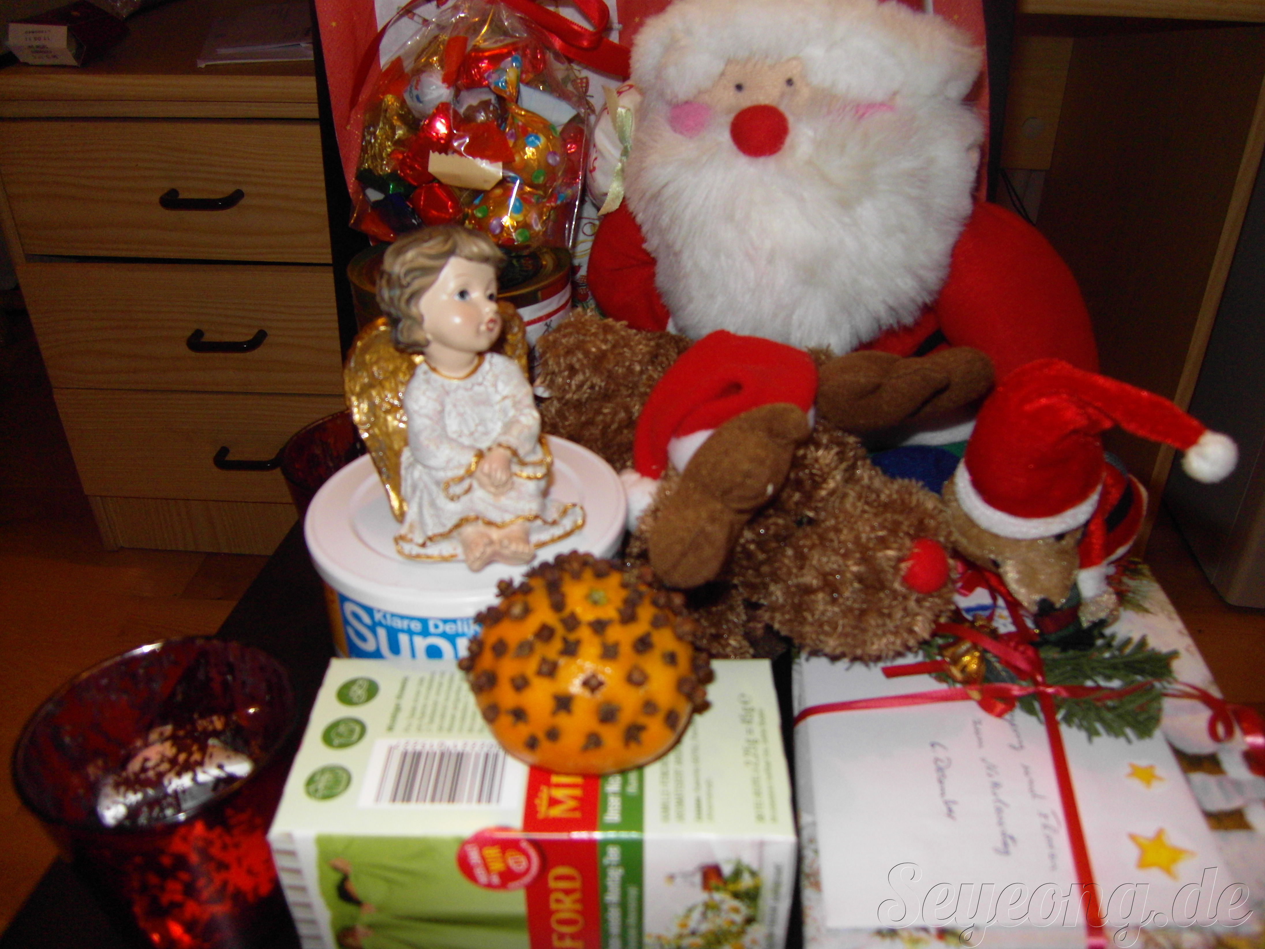여러 초콜렛이 담겨 있는 초콜렛 봉지와 천사 장식품, 수프에 넣어 먹으면 맛있는 독일식 요리 가루, 방향제로 쓰는 오렌지, 크리스마스 분위기의 초, Camile 차, 크리스마스 장식품 등 이었다.