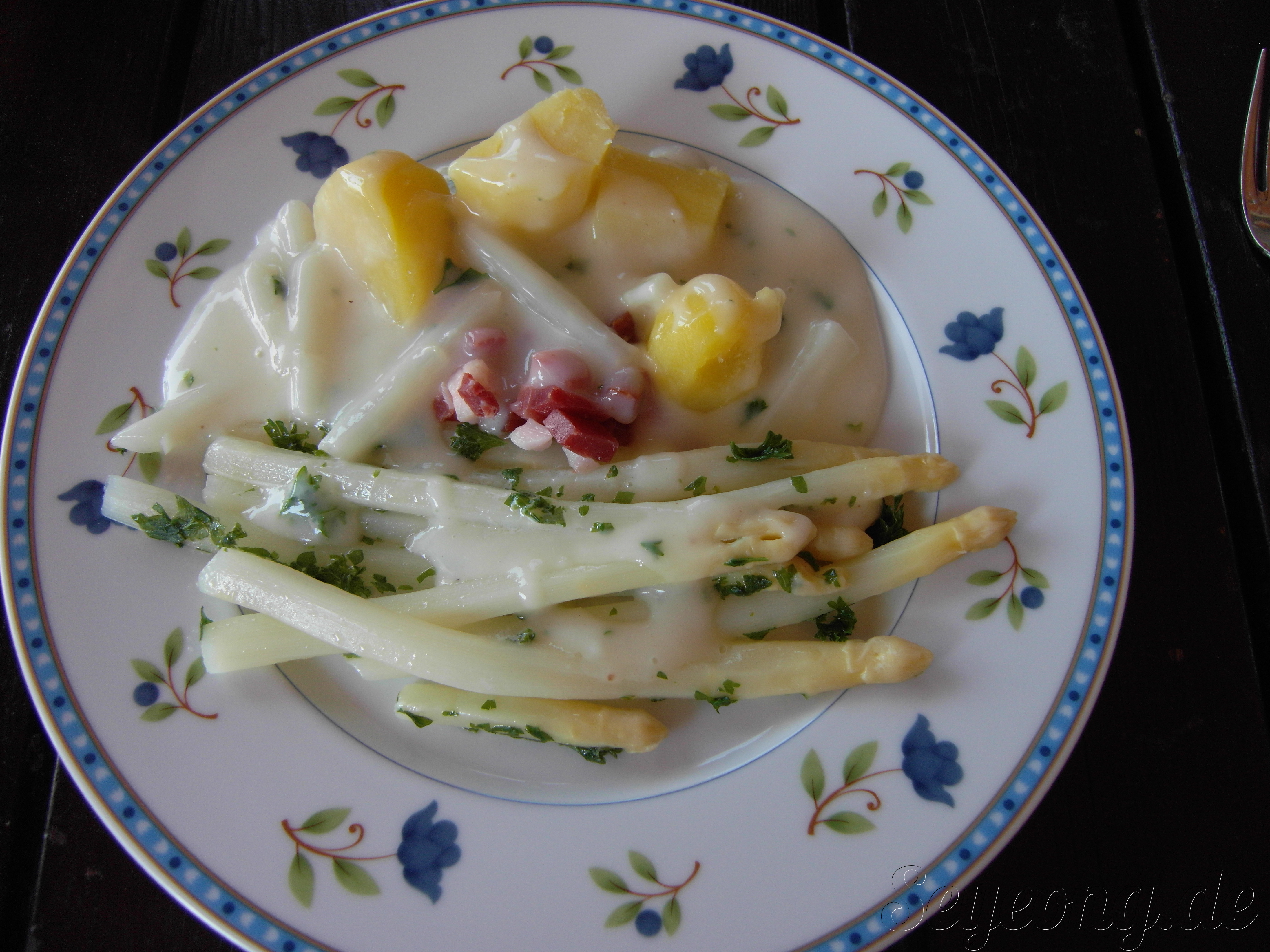 아스파라거스 크림 소스에 아스파라거스, 감자와 함께 베이컨을 얹어 같이 먹으면 된다.
