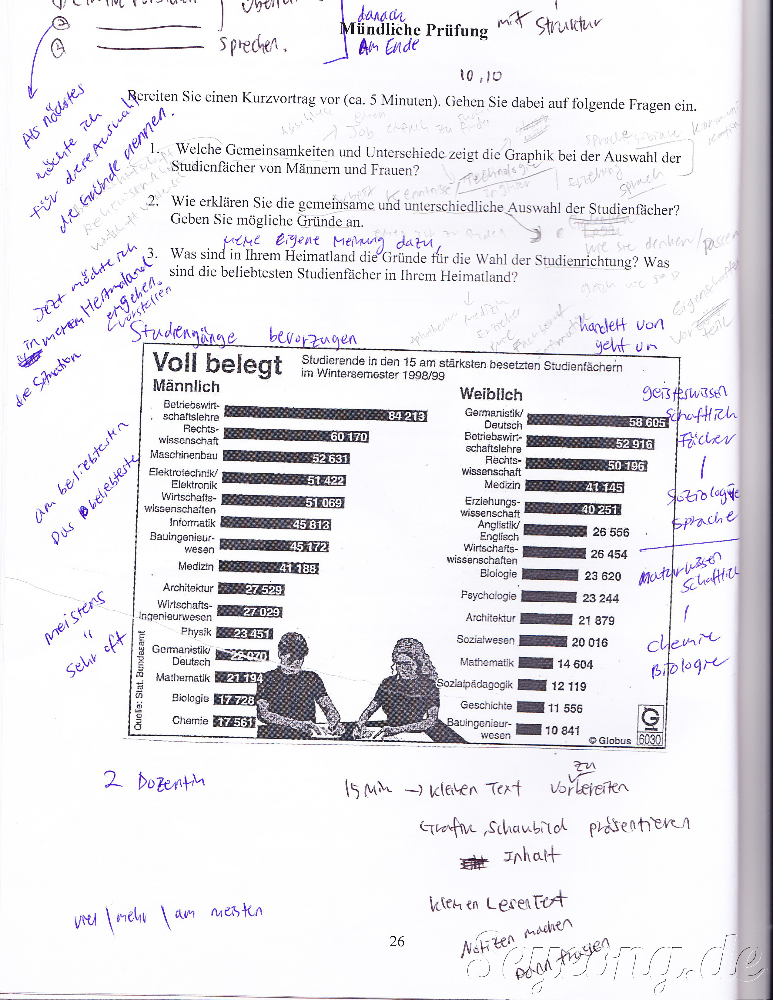 주로 시험에서는 2명의 언어 Dozentinen이 있고, 시험은 15-20분 동안 진행된다.