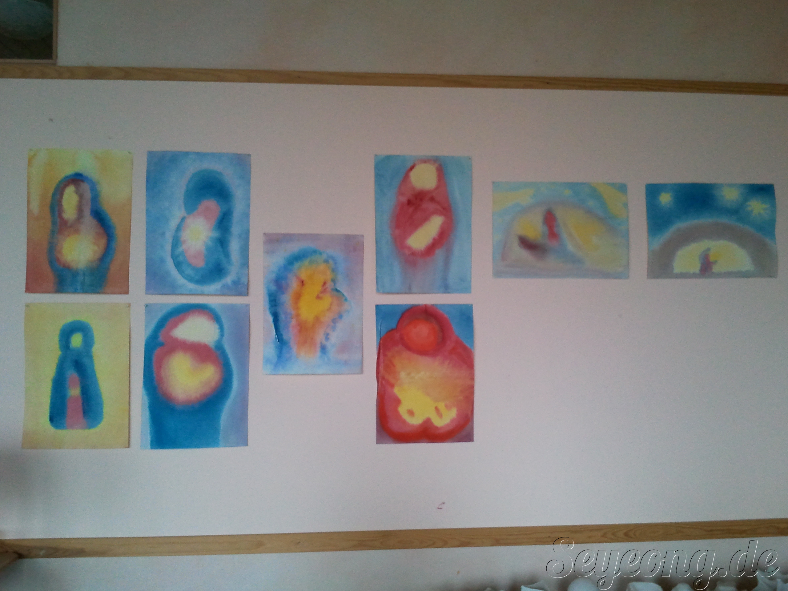 크리스마스라스 그런걸까. 성모 마리아와 아기 예수를 그렸다. 먼저 Frau Pirling은 작은 성탄 이야기를 이야기 했고, 이야기 속에 성모마리와 아기 예수가 있었다. 마리아의 얼굴과 아기 예수는 노랑색으로 빛나게 색칠하고, 마리아의 옷은 안은 빨강, 밖은 파랑으로 둘러싸인 외투를 입었다.