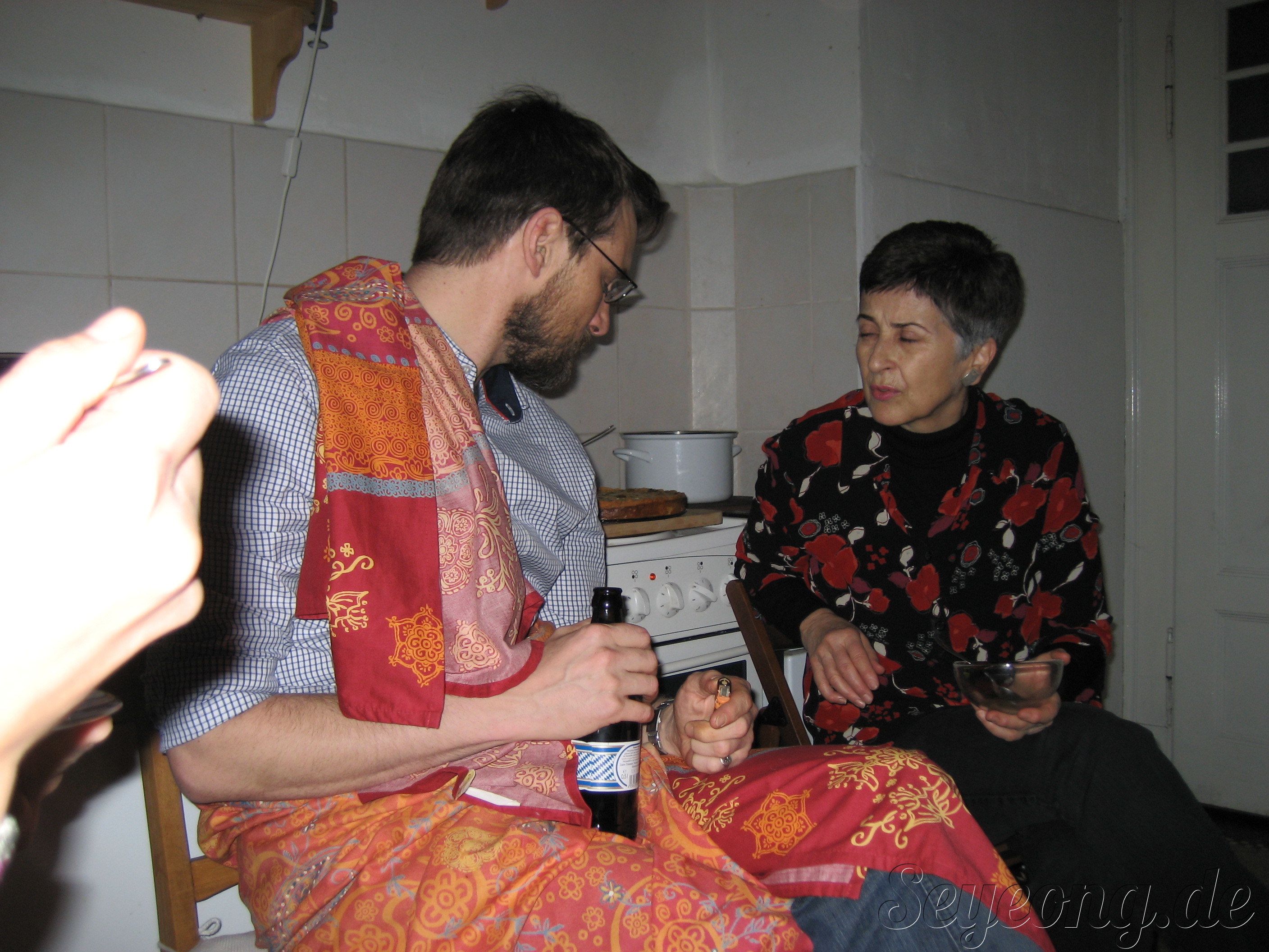 옷이 없다고 침대 커버를 둘르고 온 마틴과 꽃 무늬 자켓을 입은 Frau Schuerer.