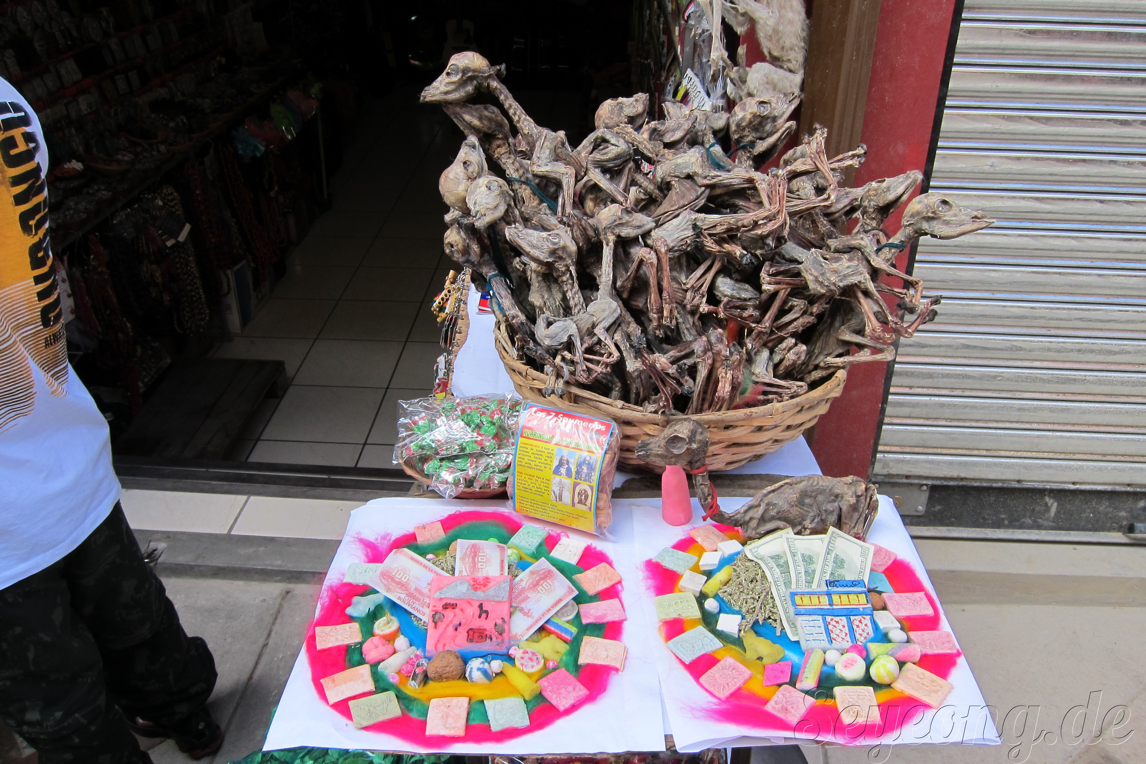 경악스러운 새끼 라마를 말린 것들. 우리의 황태 말린 것과 같은 원리로 볼리비아에서는 새끼 라마의 말린 시체(?)는 큰 복을 가져다 준다고 믿기에 그것을 판다.