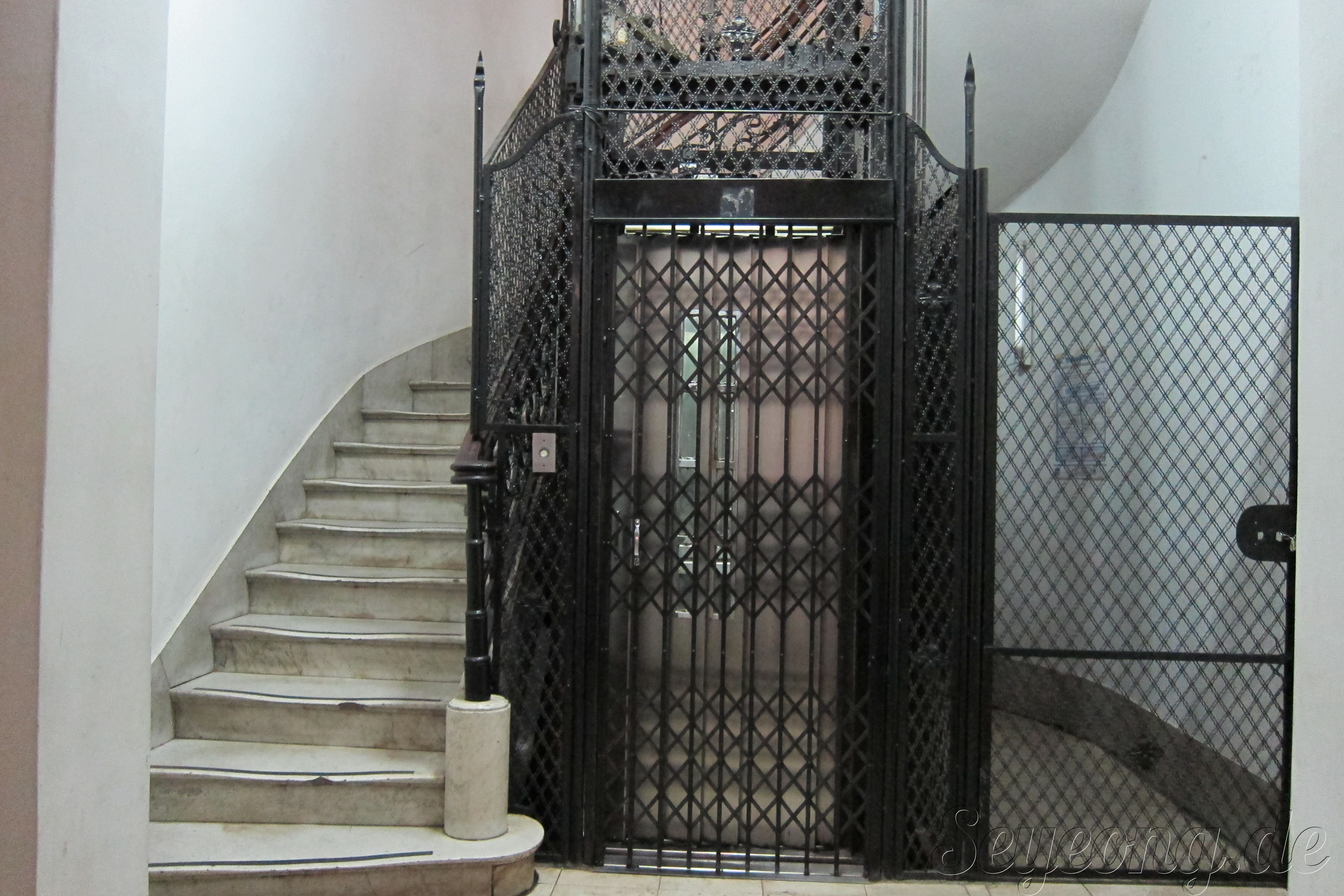 건물 6층에 위치한 곳에 가기 위해 타야 하는 오래된 엘리베이터.