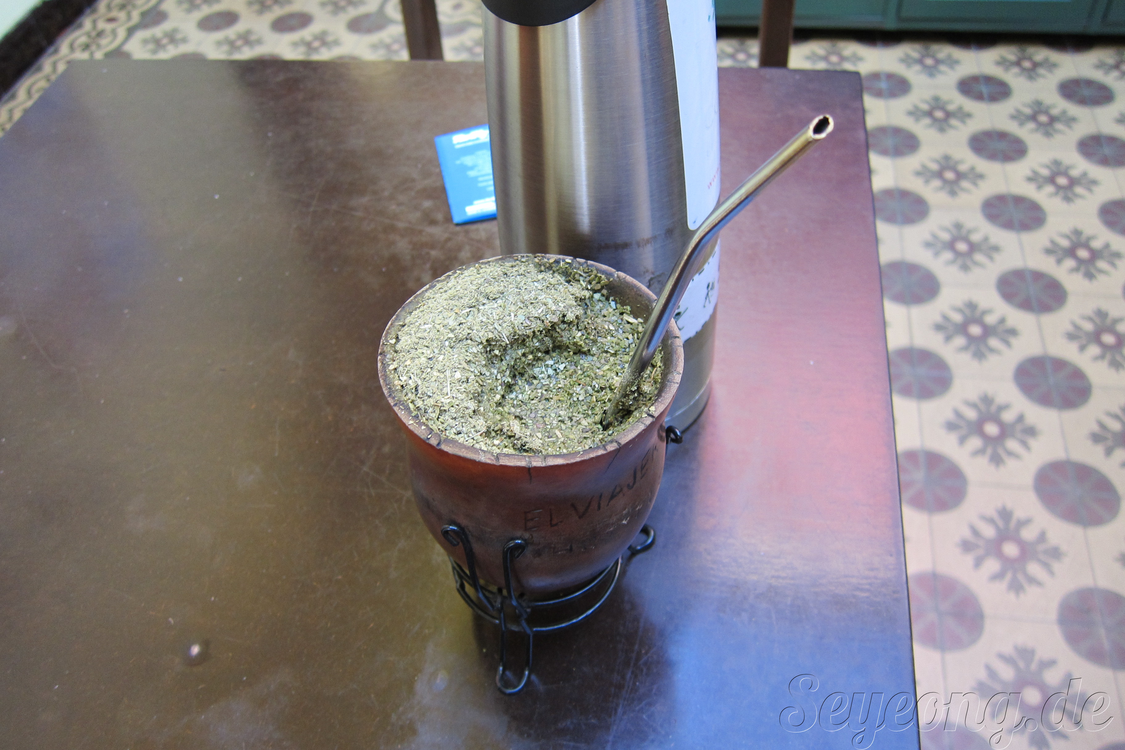 마테에 빨대처럼 꽂혀있는 Bombilla라고 불리는 은색 막대는, 뜨거운 물에 잠겨든 마떼차의 찻잎을 걸러주며 마실 수 있도록 도와준다.