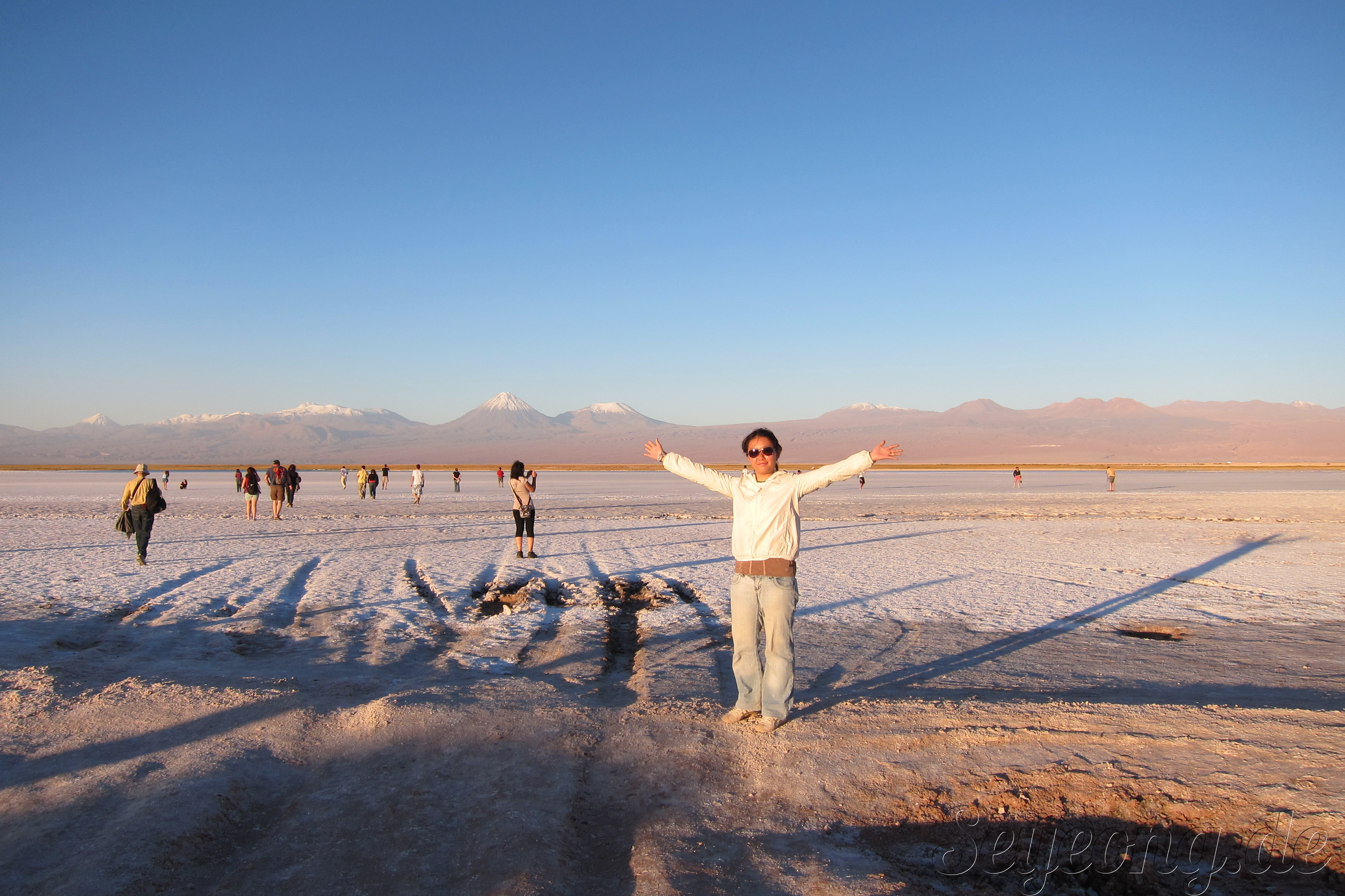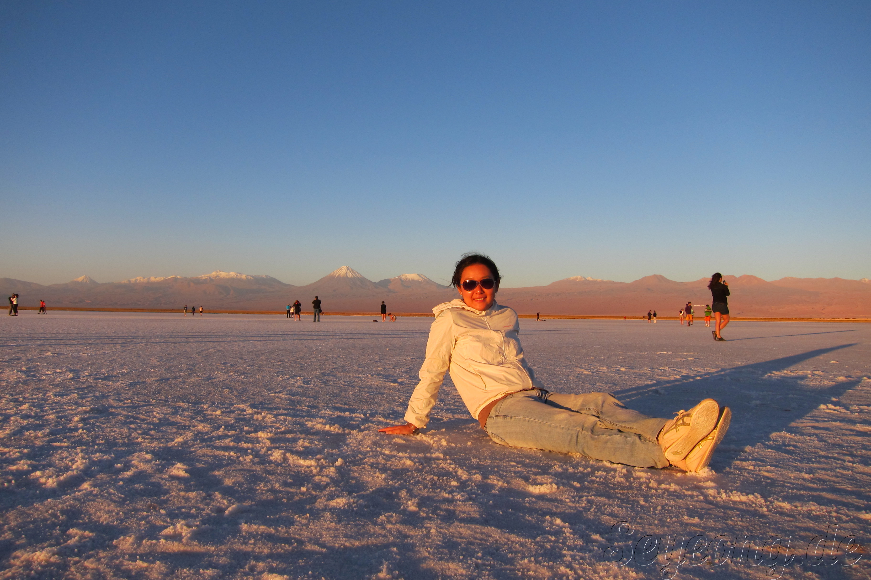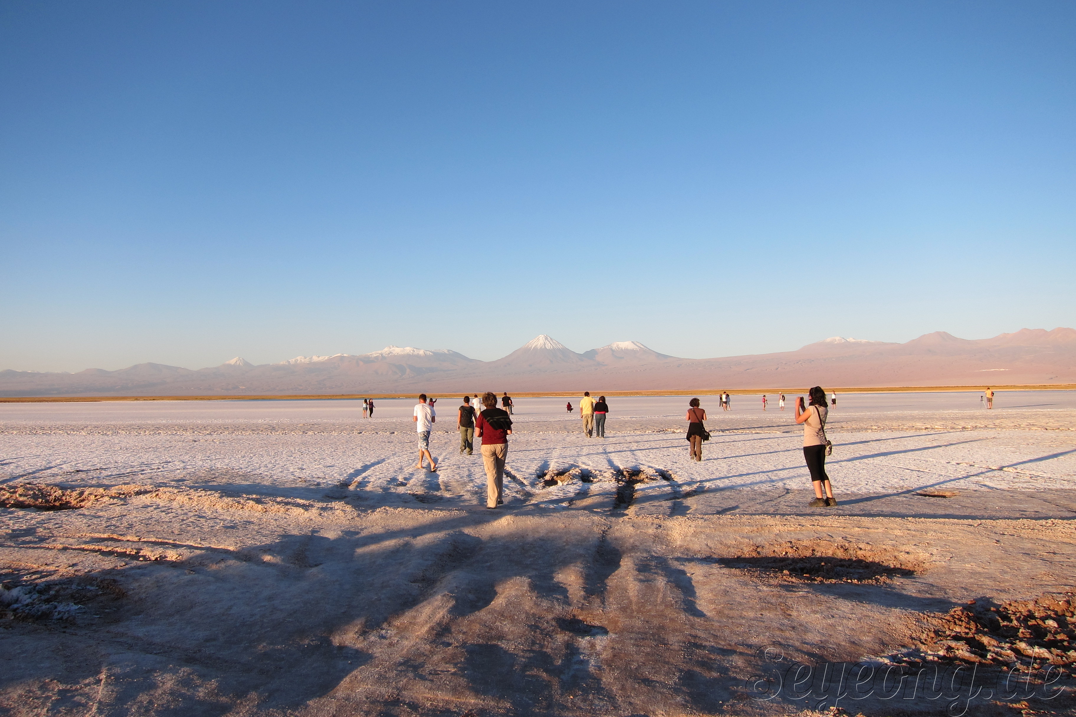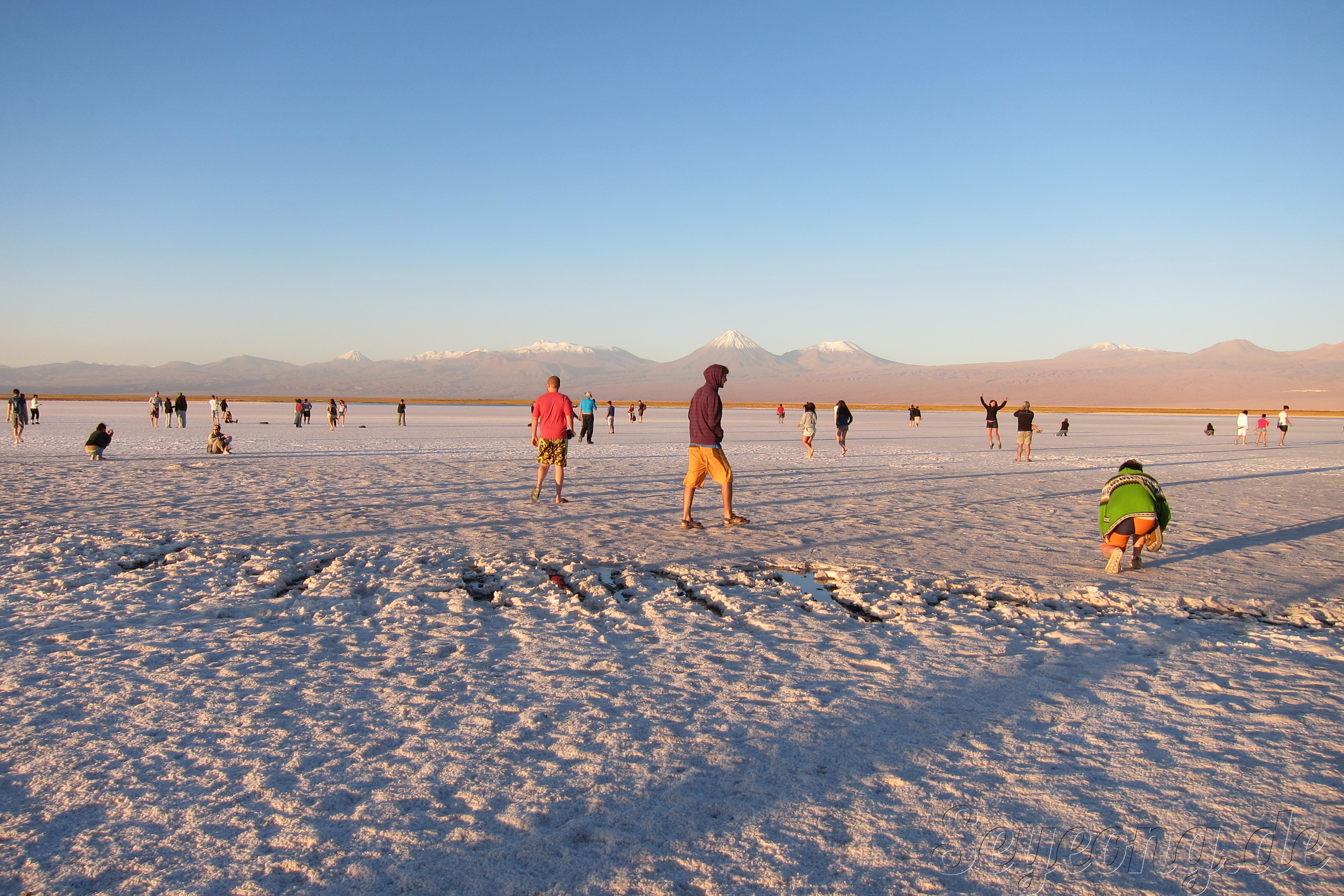 언뜻 사진을 보면 눈과 같이 보이지만, 사람들의 옷차림과 가까이 보면 보이는 소금 결정으로 소금 사막임을 알 수 있다.