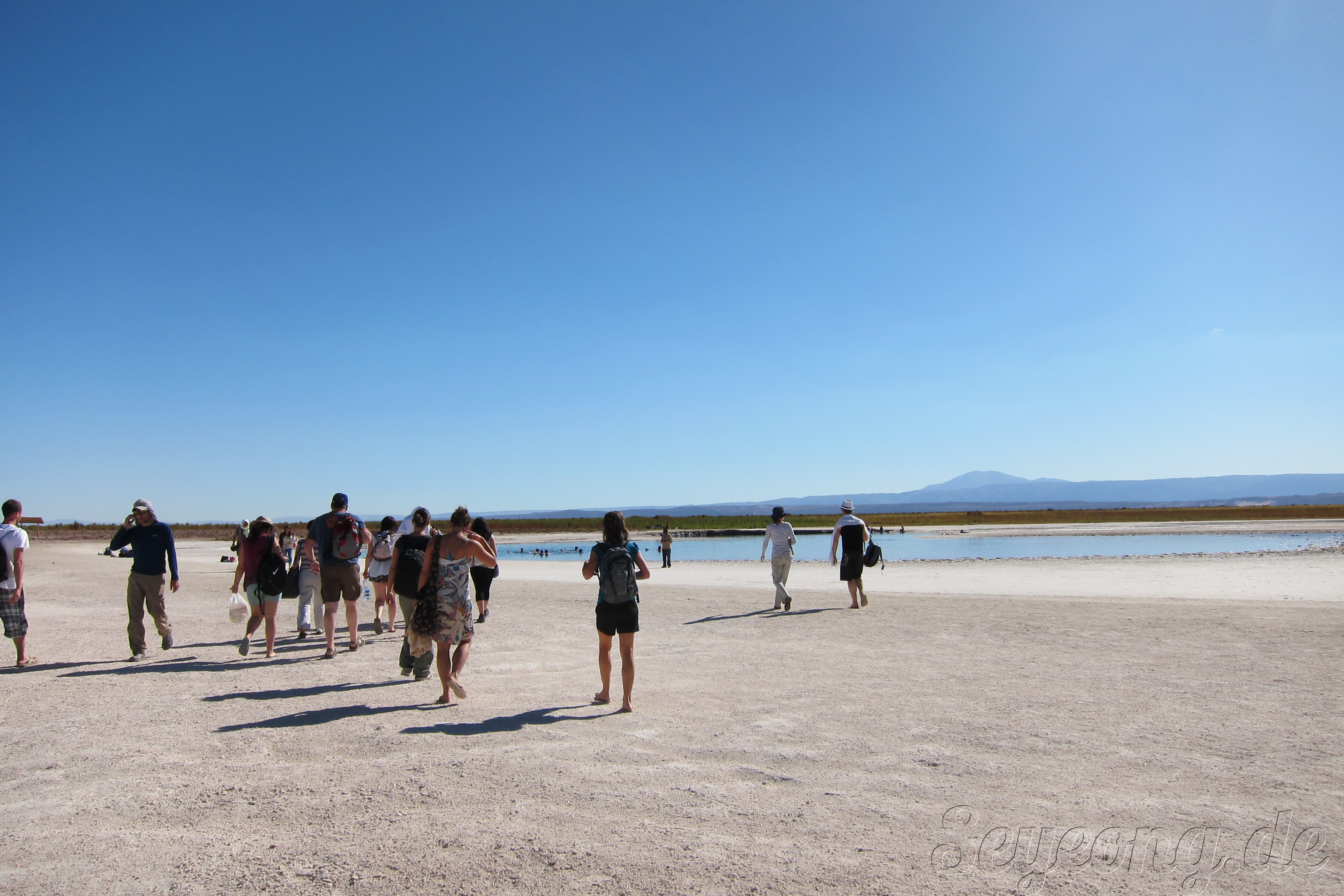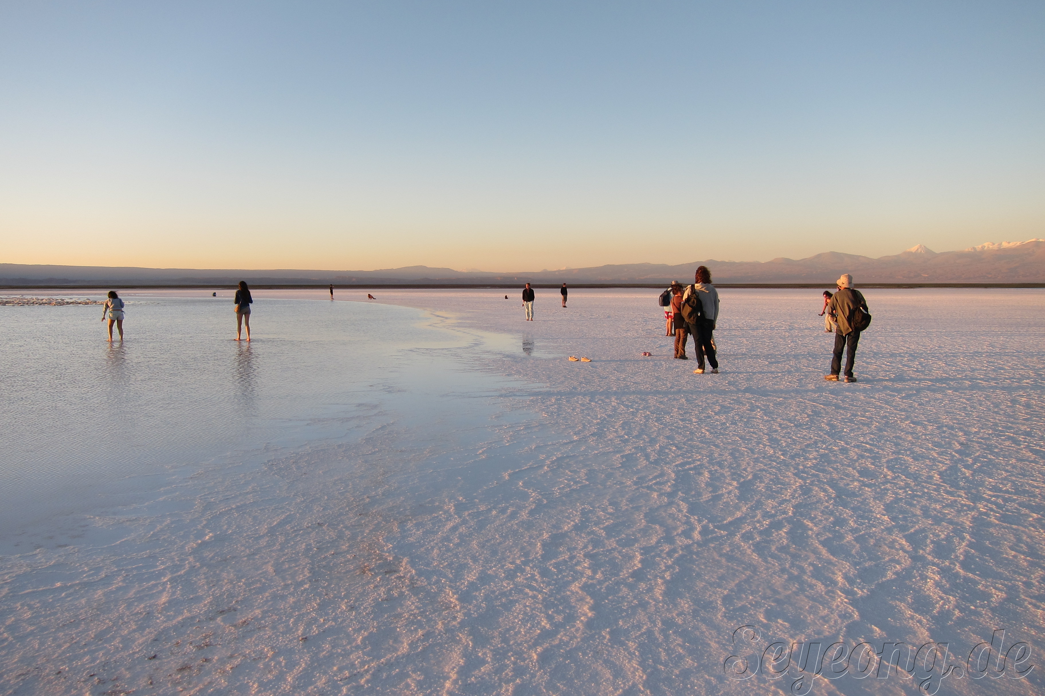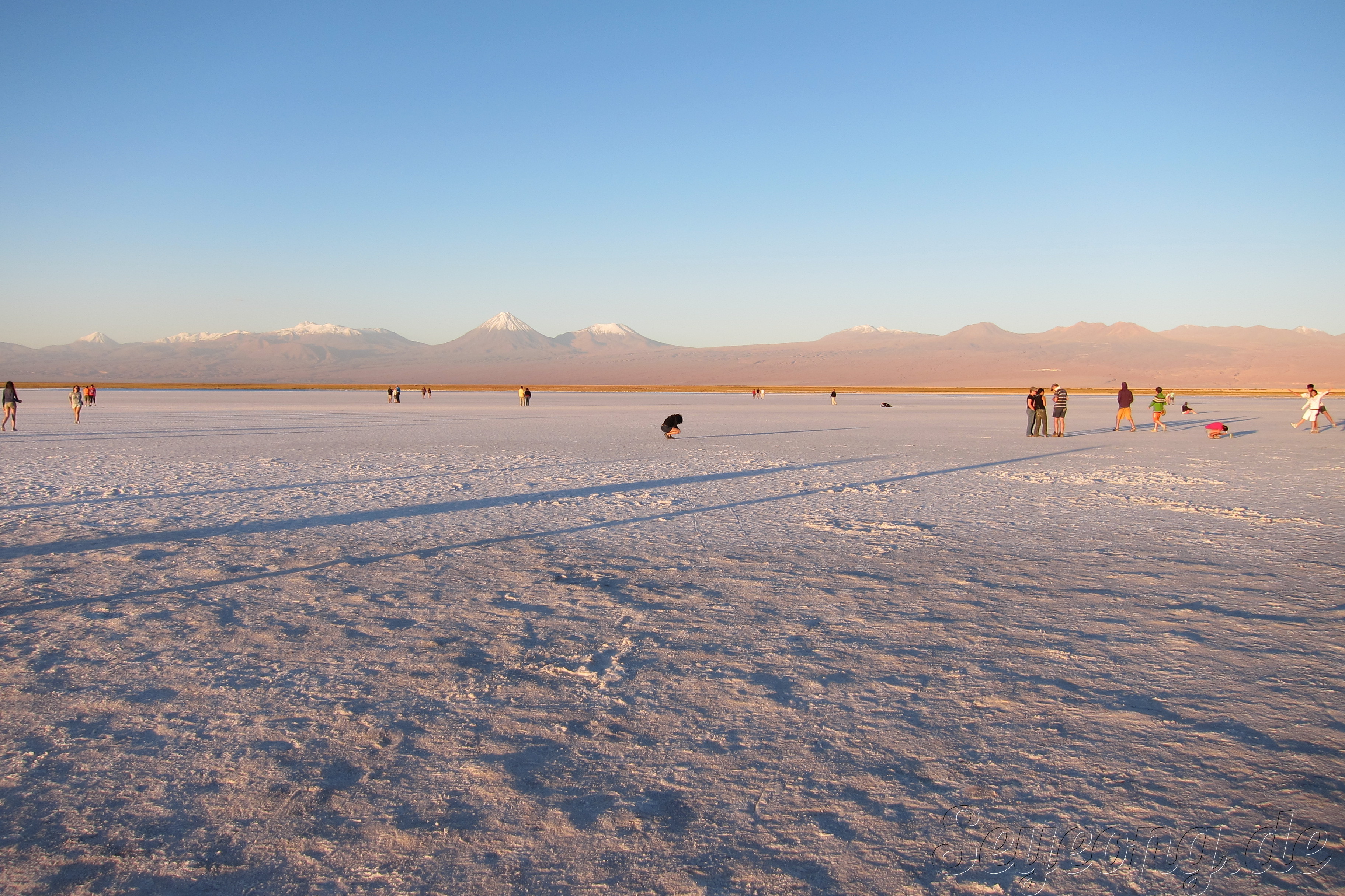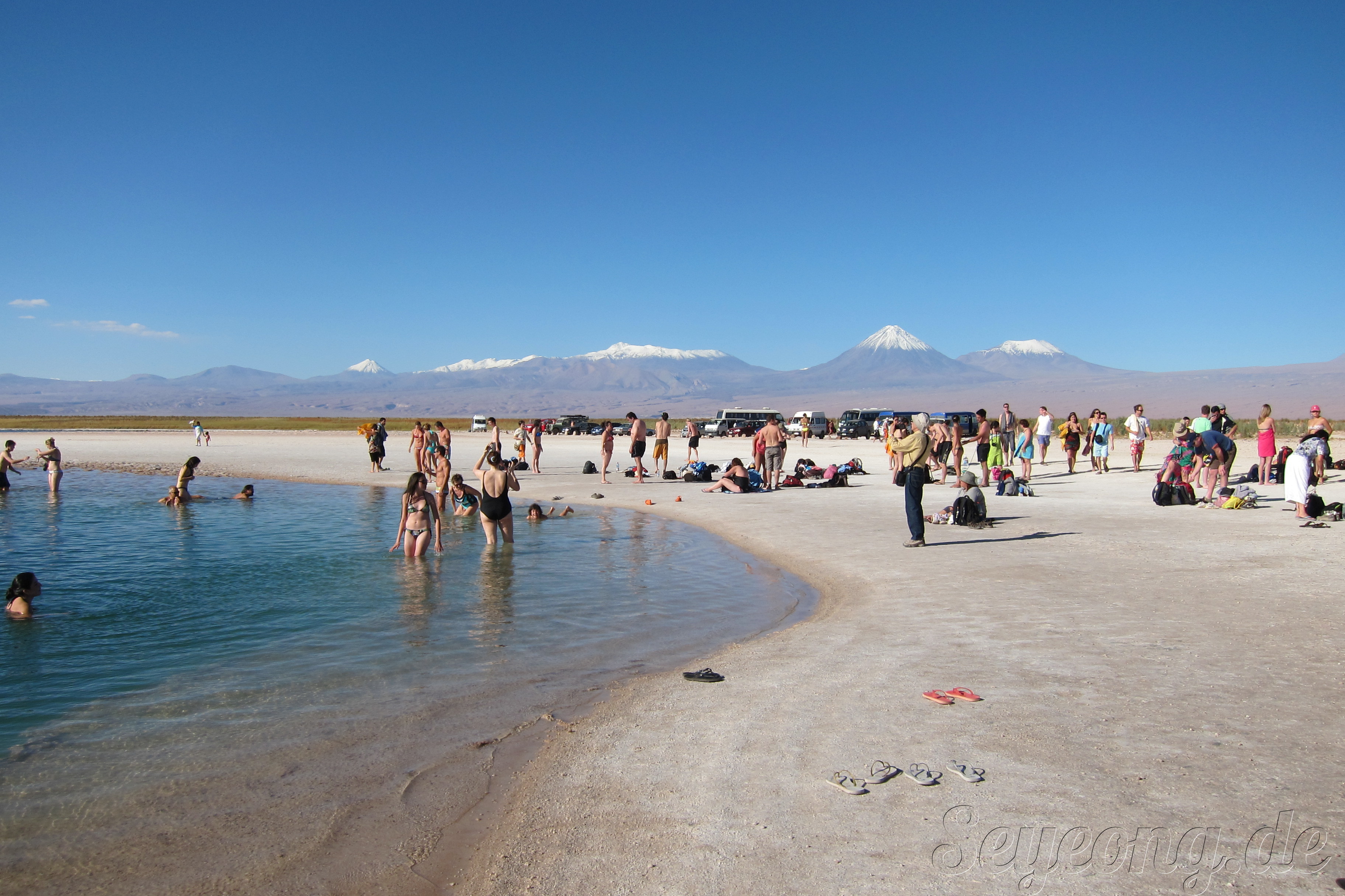 언뜻 사진을 보면 눈과 같이 보이지만, 사람들의 옷차림과 가까이 보면 보이는 소금 결정으로 소금 사막임을 알 수 있다.