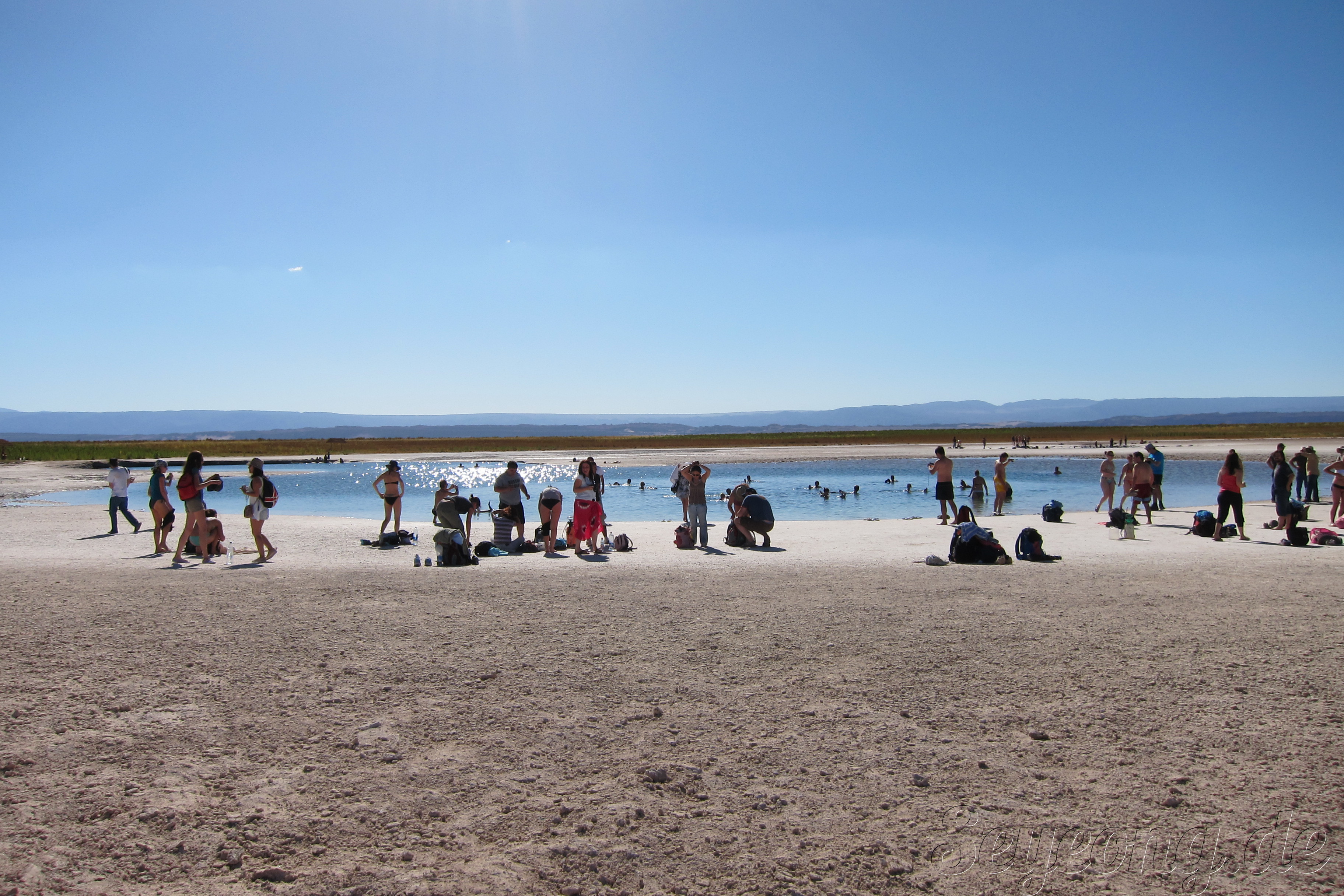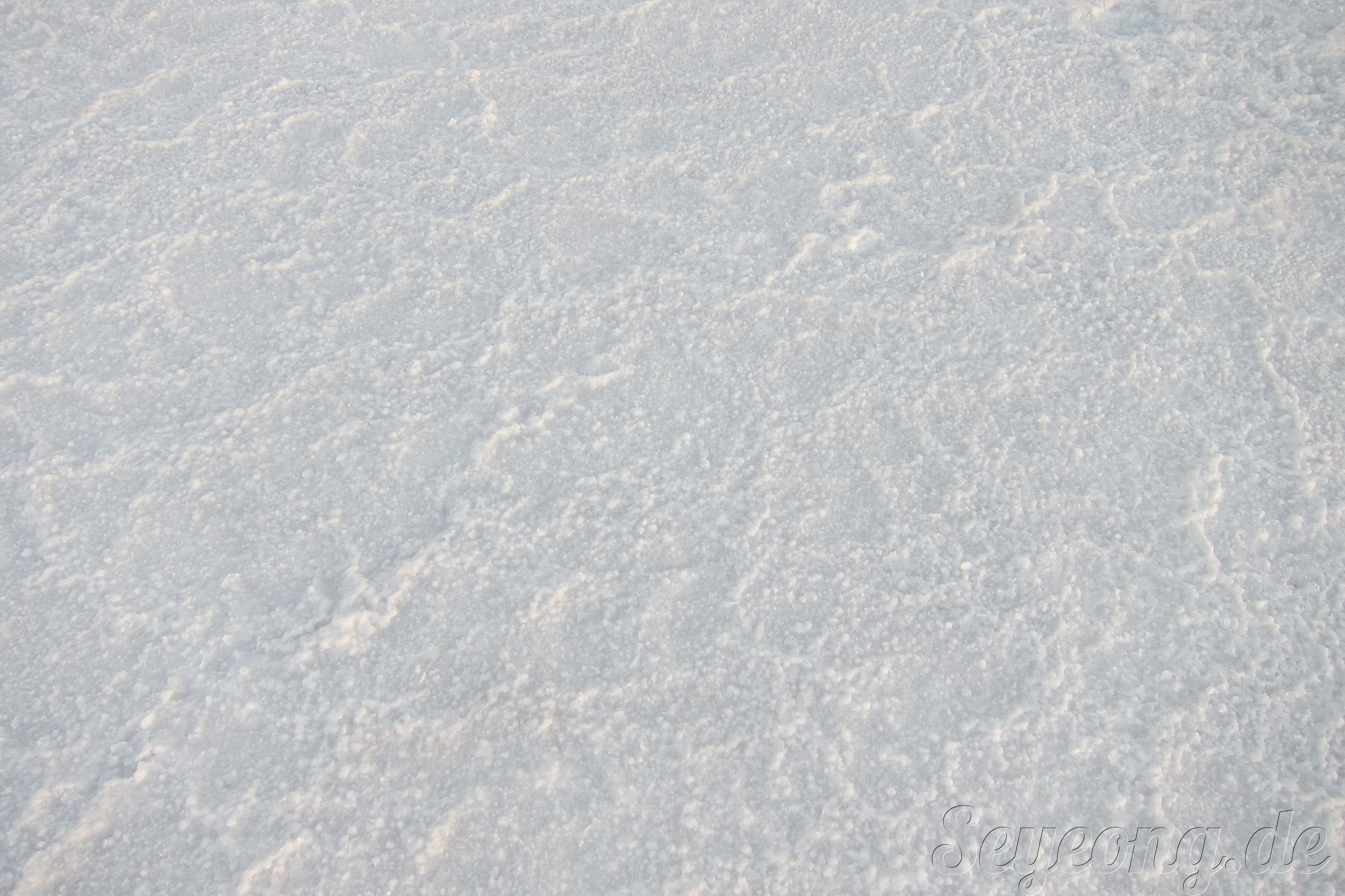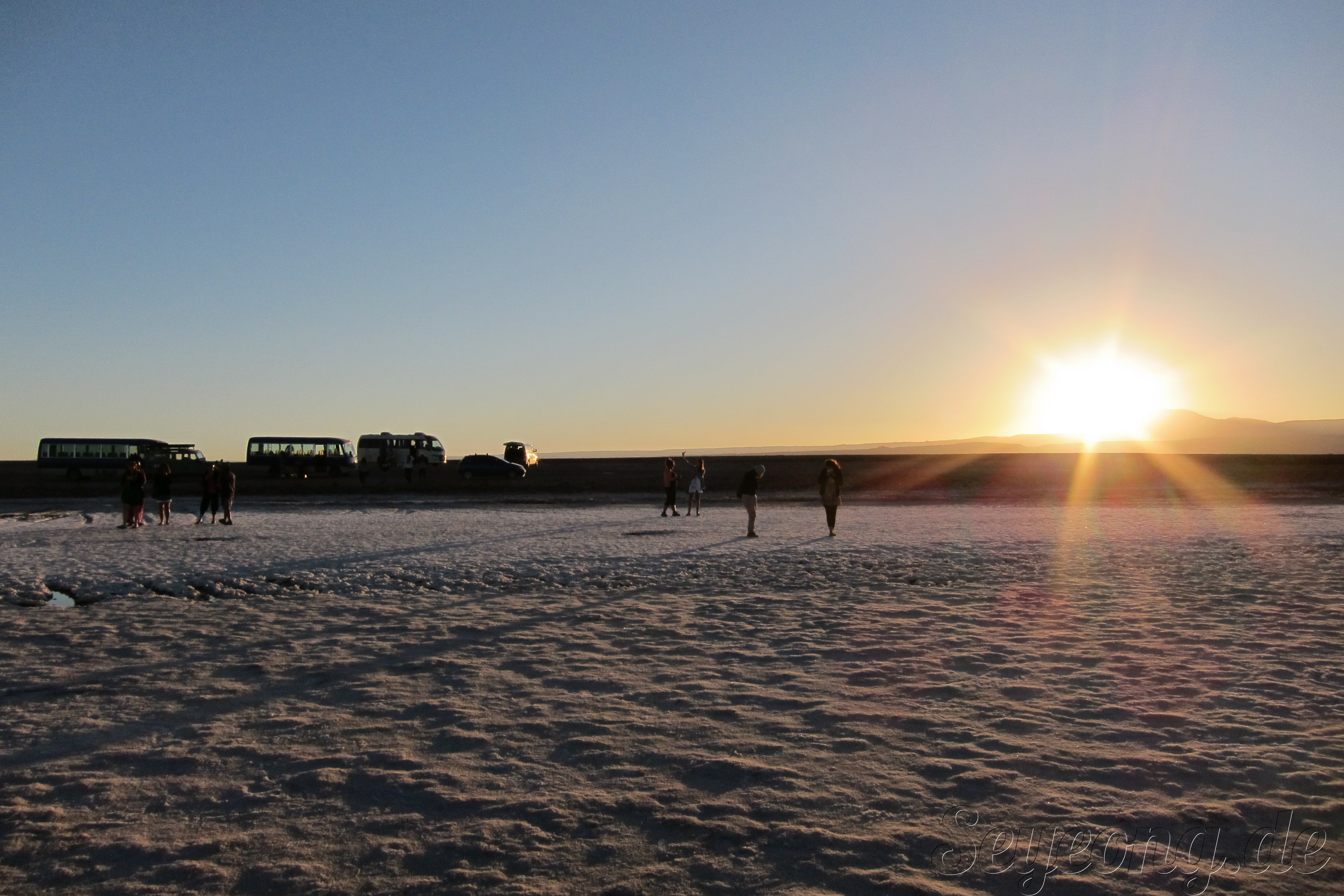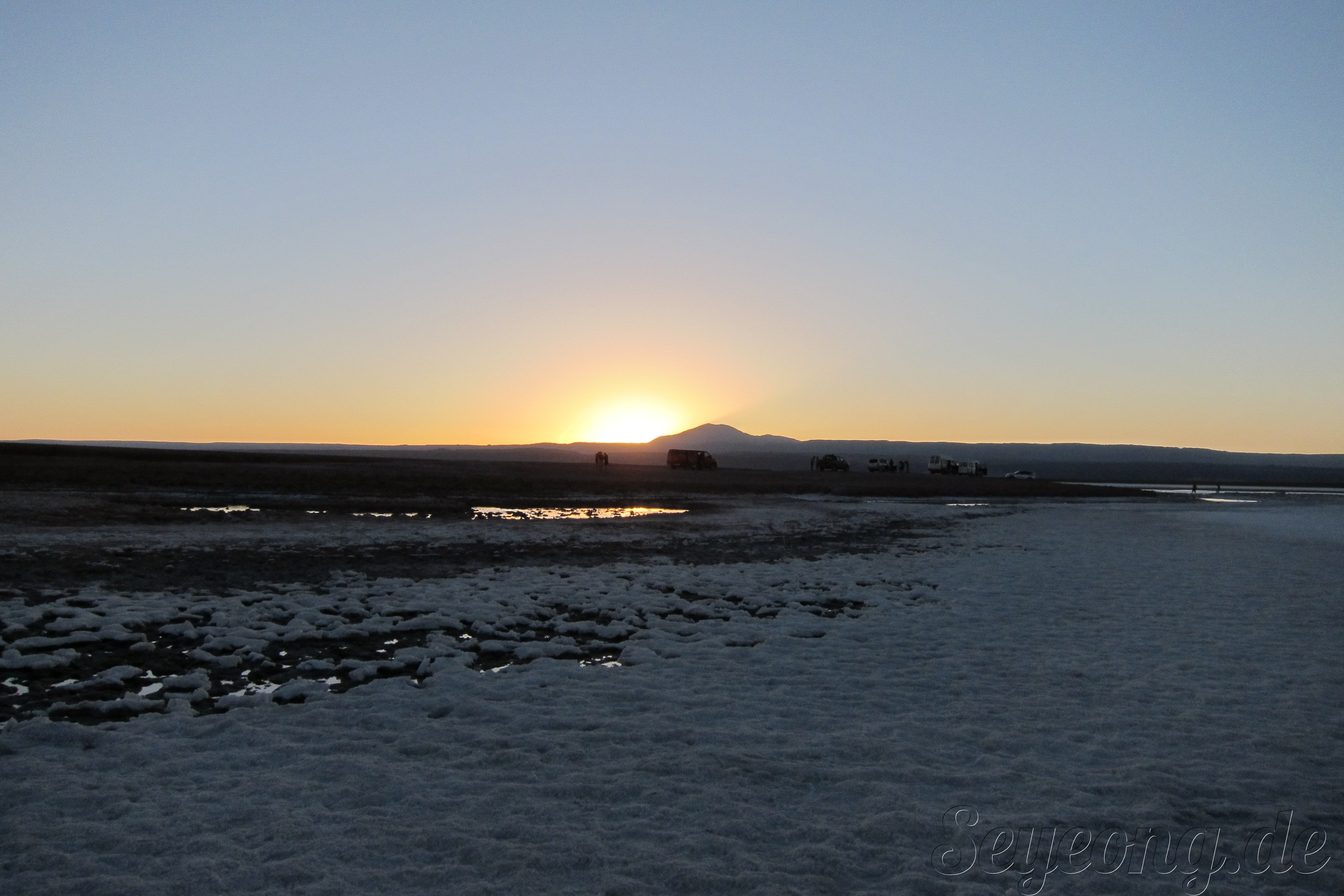 언뜻 사진을 보면 눈과 같이 보이지만, 사람들의 옷차림과 가까이 보면 보이는 소금 결정으로 소금 사막임을 알 수 있다.