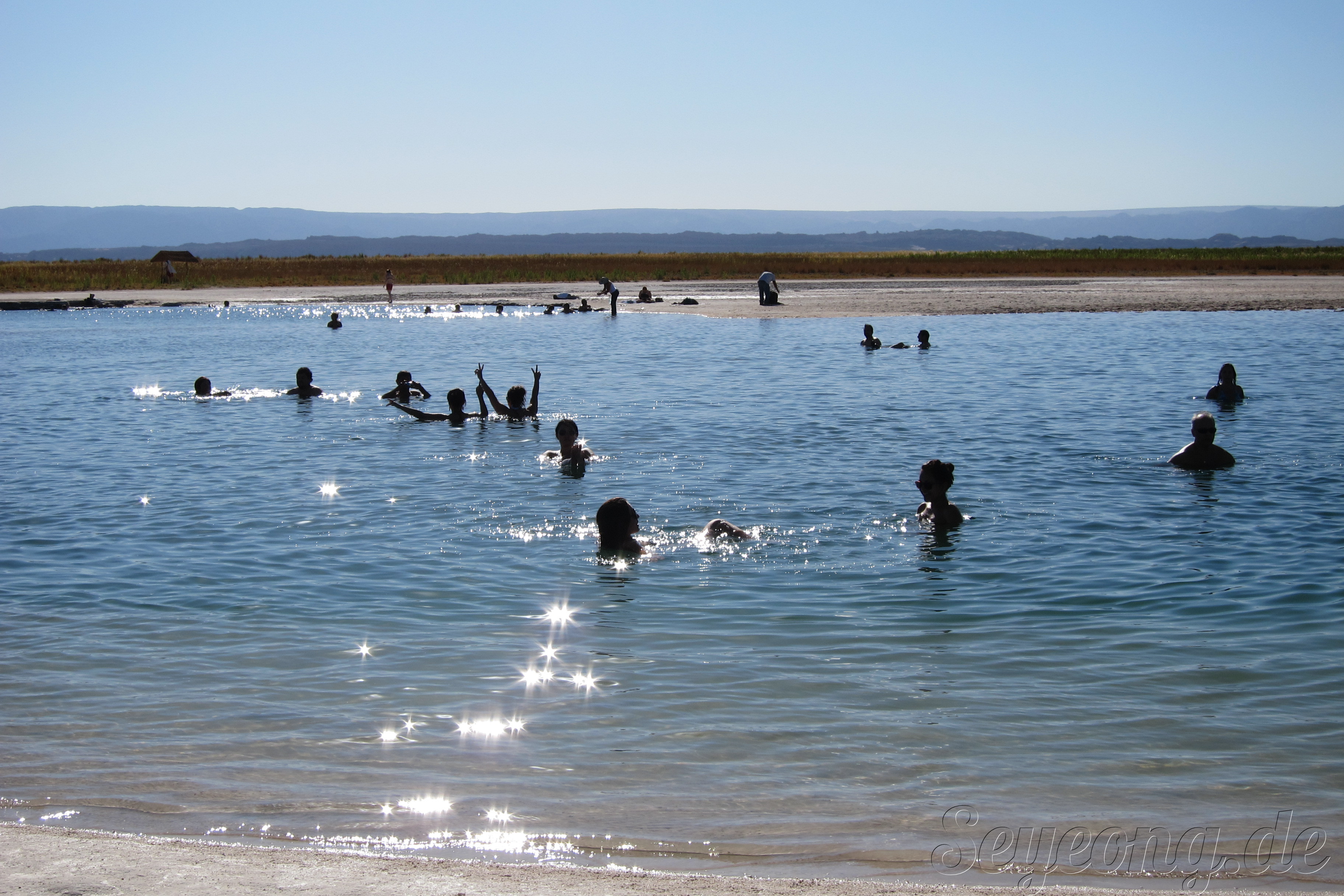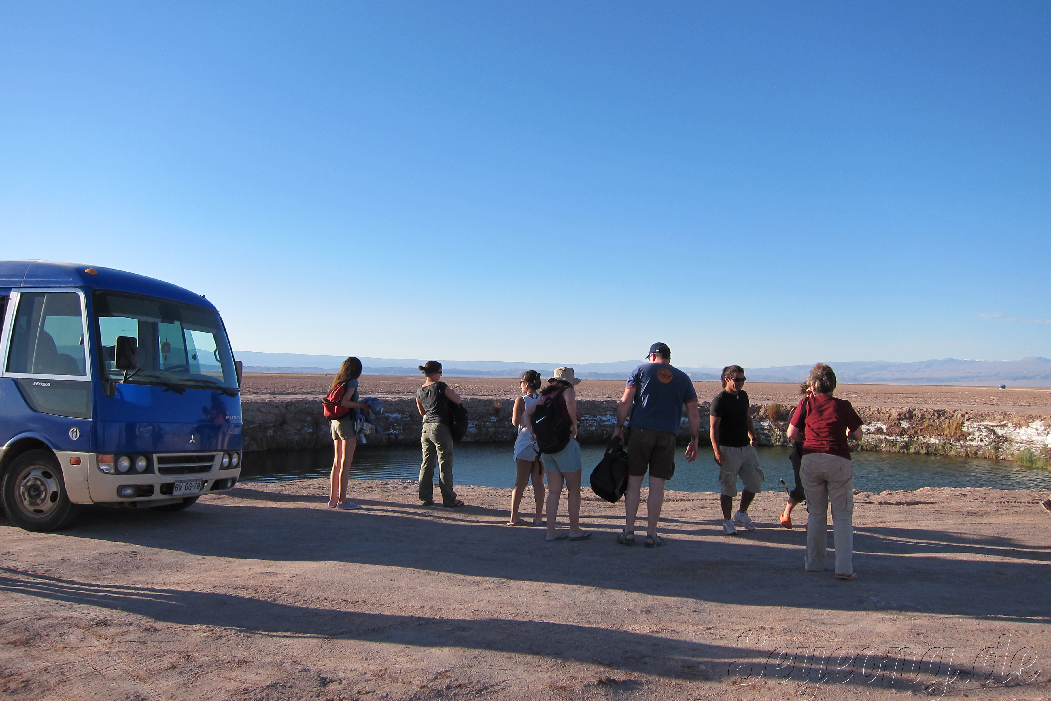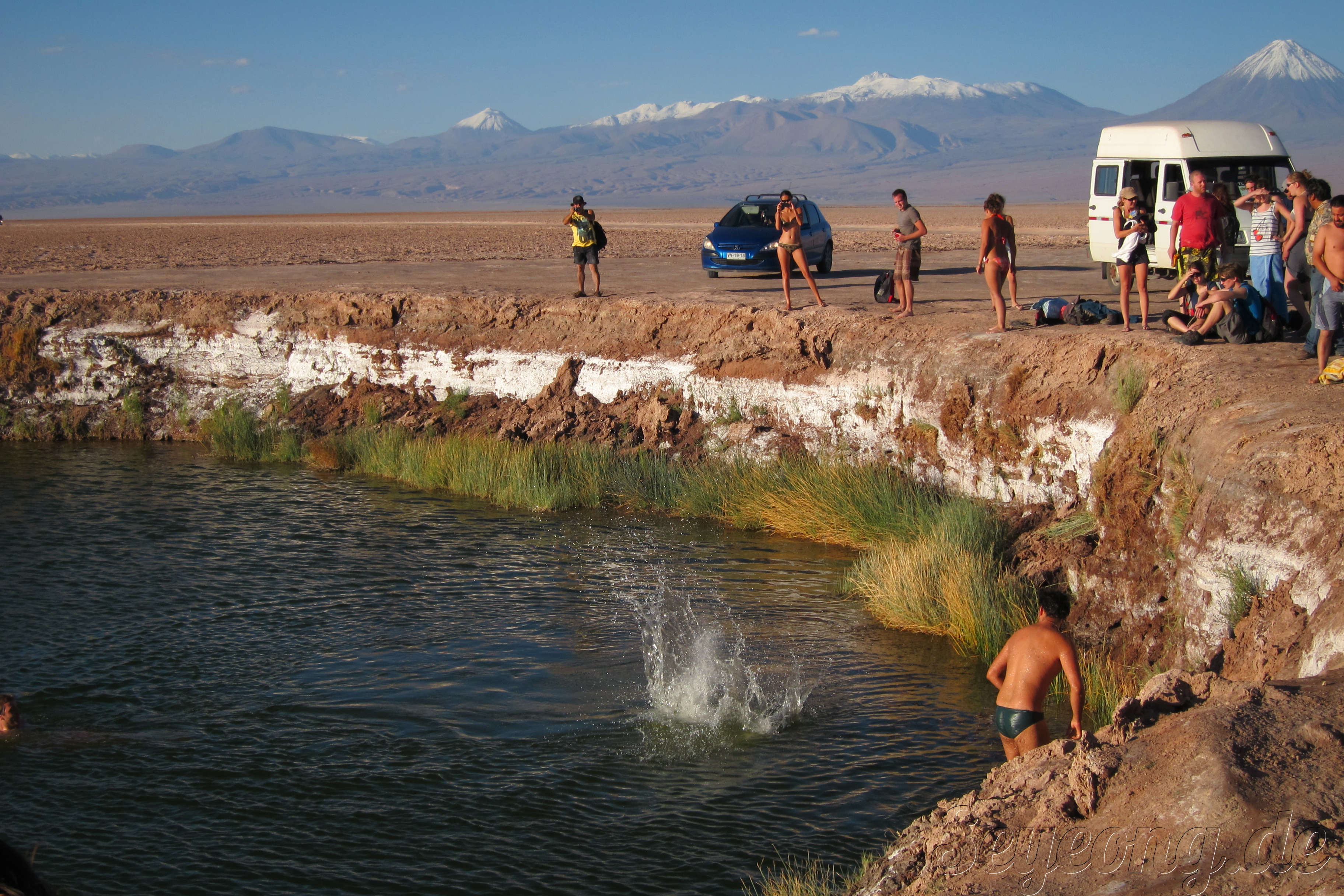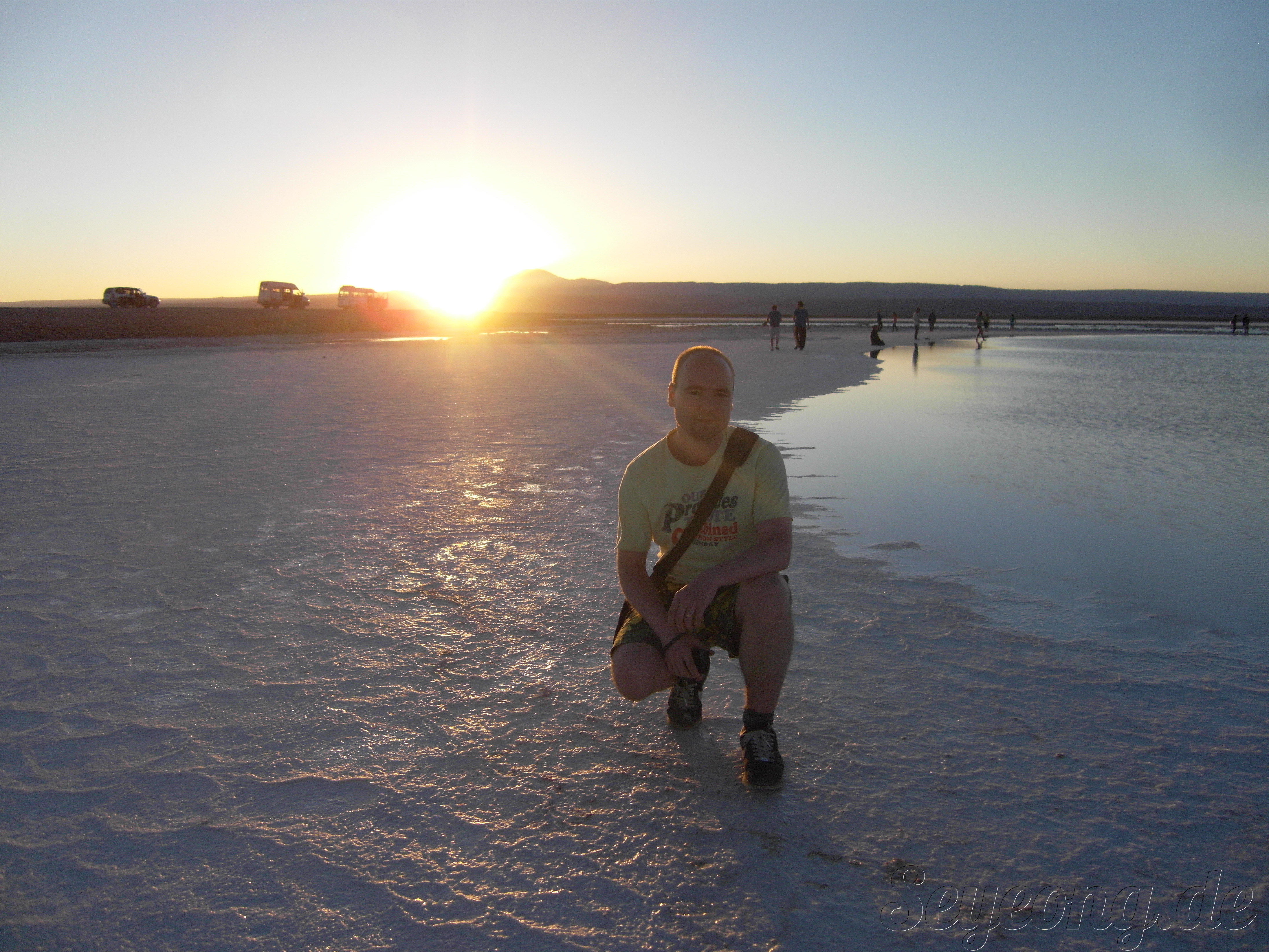언뜻 사진을 보면 눈과 같이 보이지만, 사람들의 옷차림과 가까이 보면 보이는 소금 결정으로 소금 사막임을 알 수 있다.