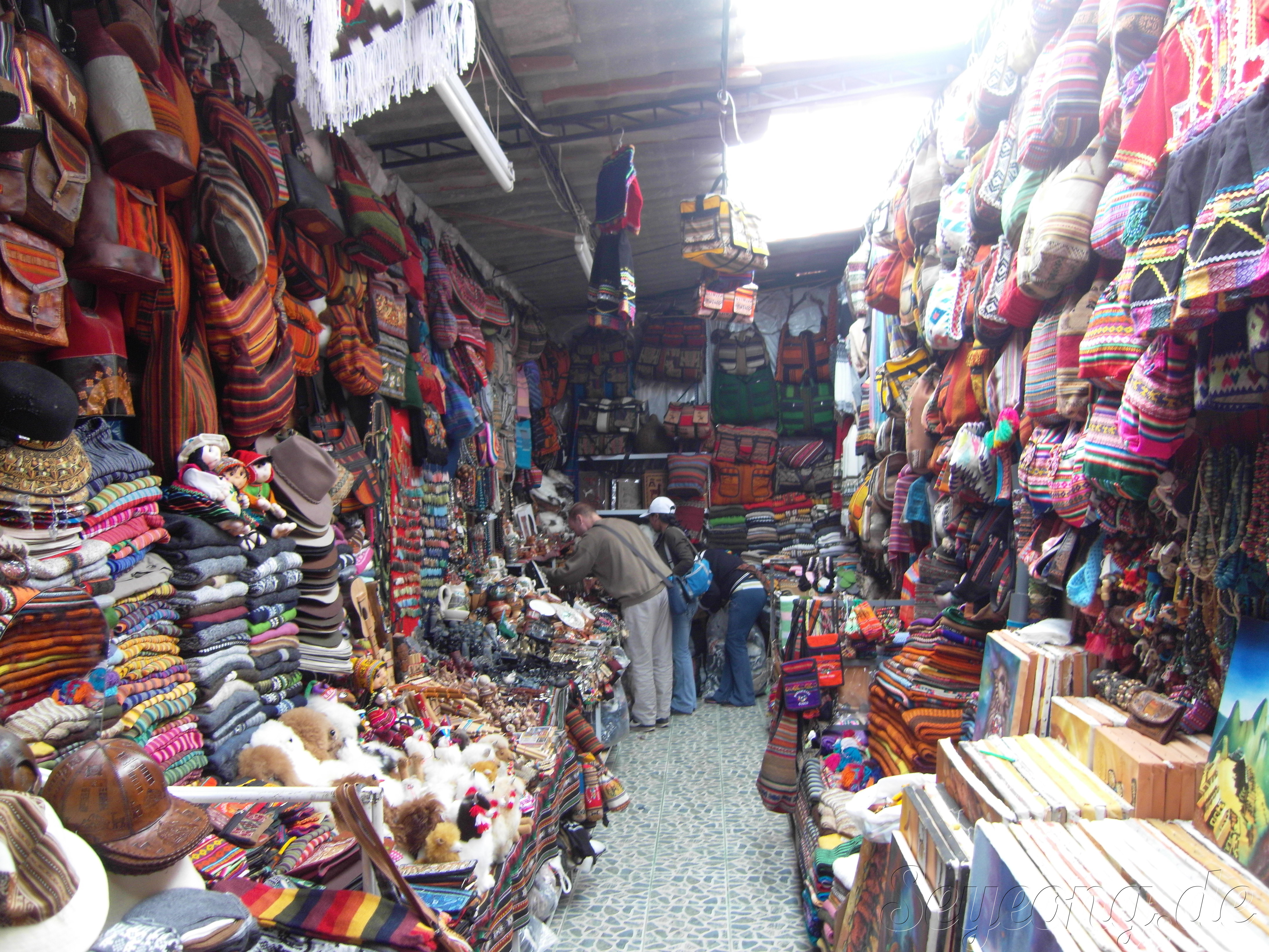 파는 물건의 대부분은 알파카로 만든 모자, 양탄자, 실래화.