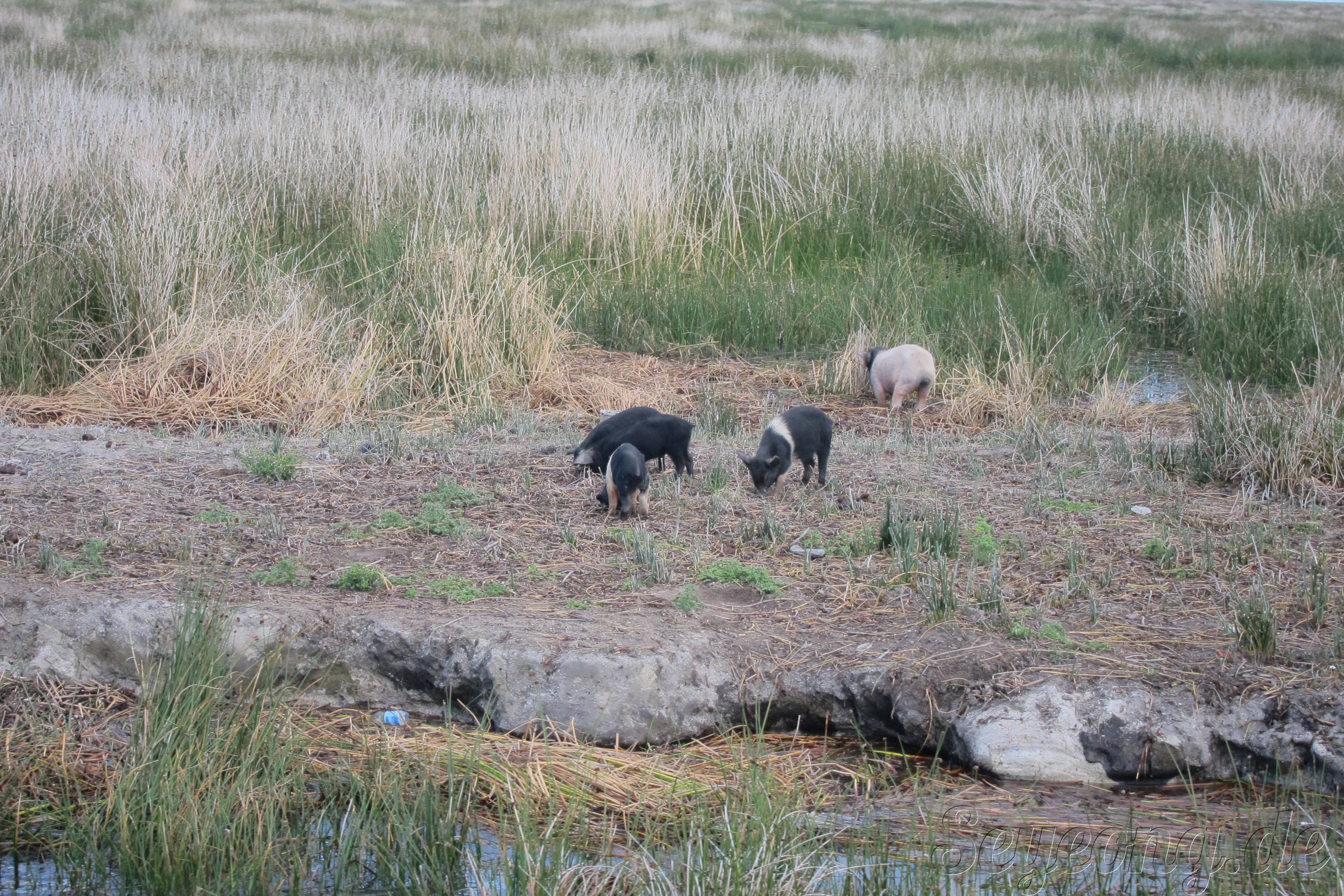 호수 근처의 작은 섬들에는 돼지들이 놀고 있다.