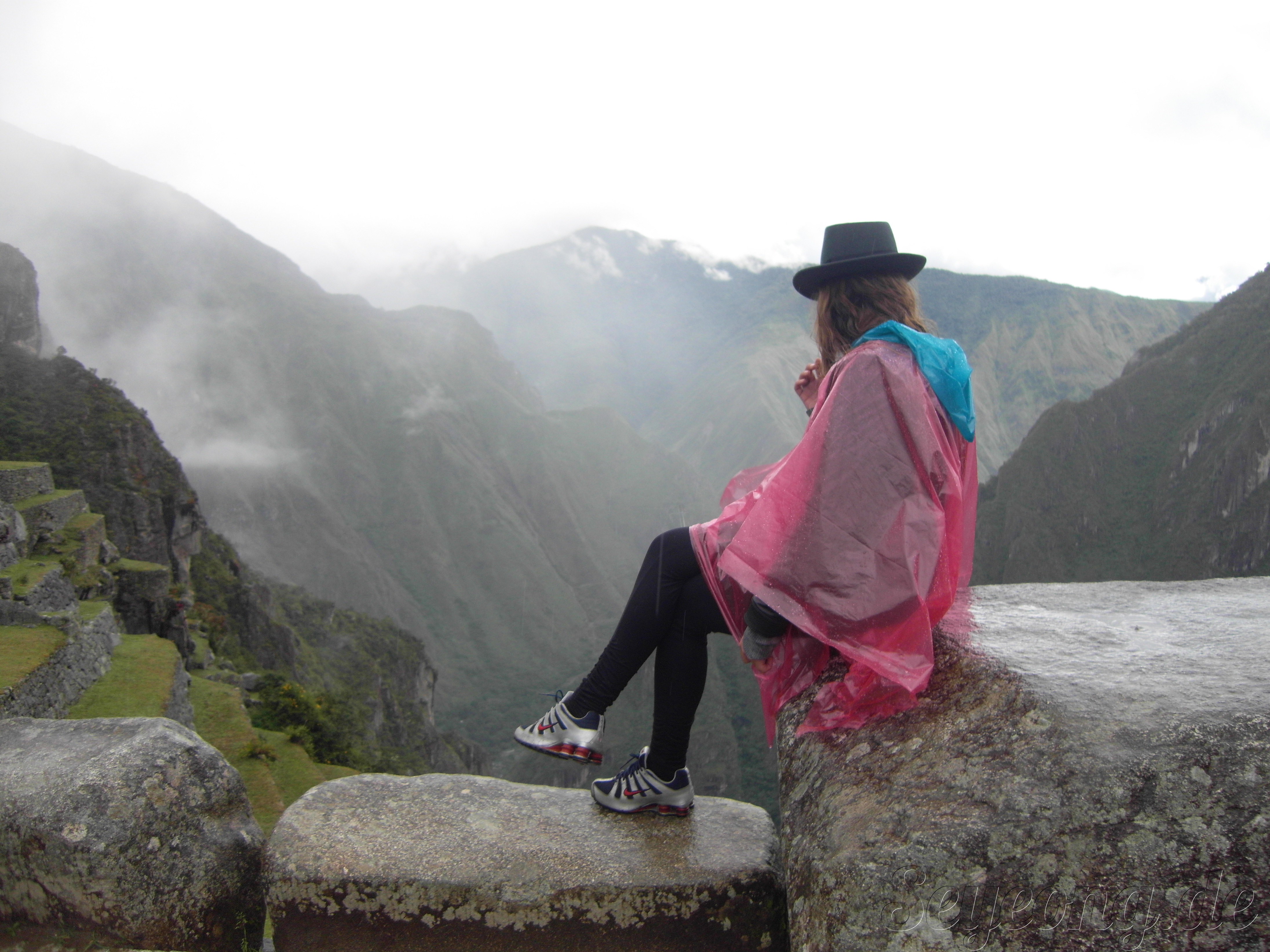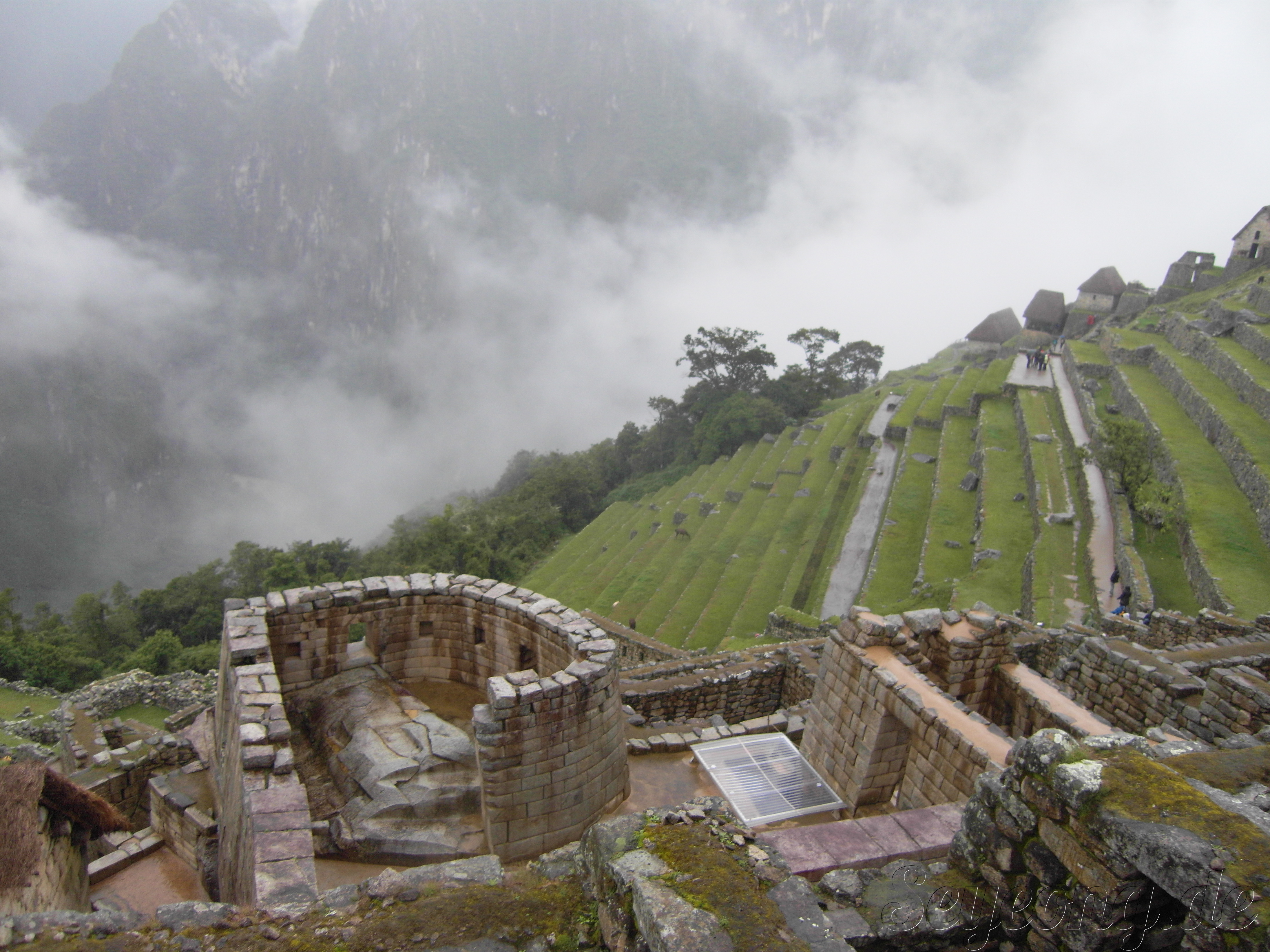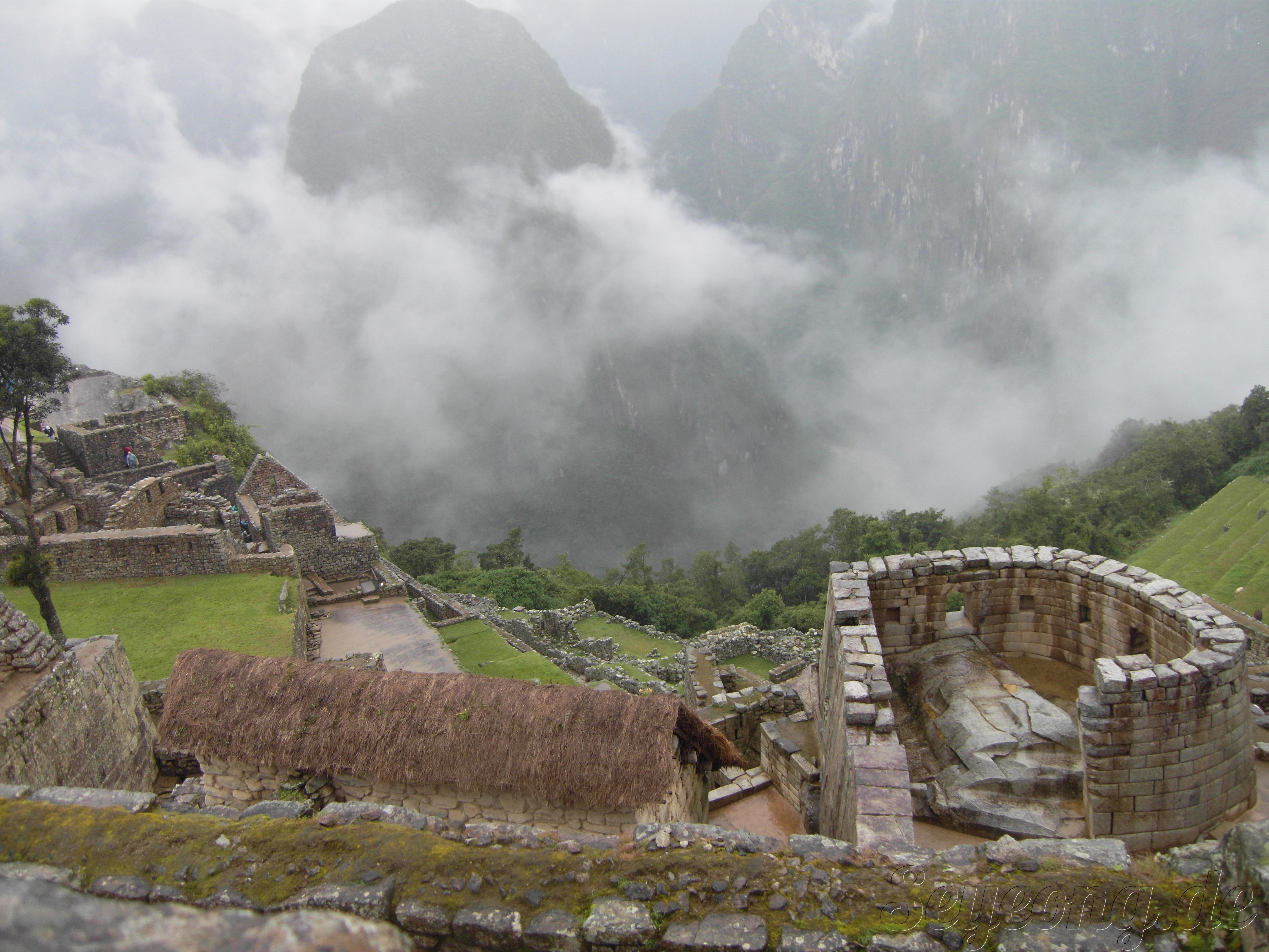 가파른 마추피추 사원 아래 깊이 보이는 계곡.