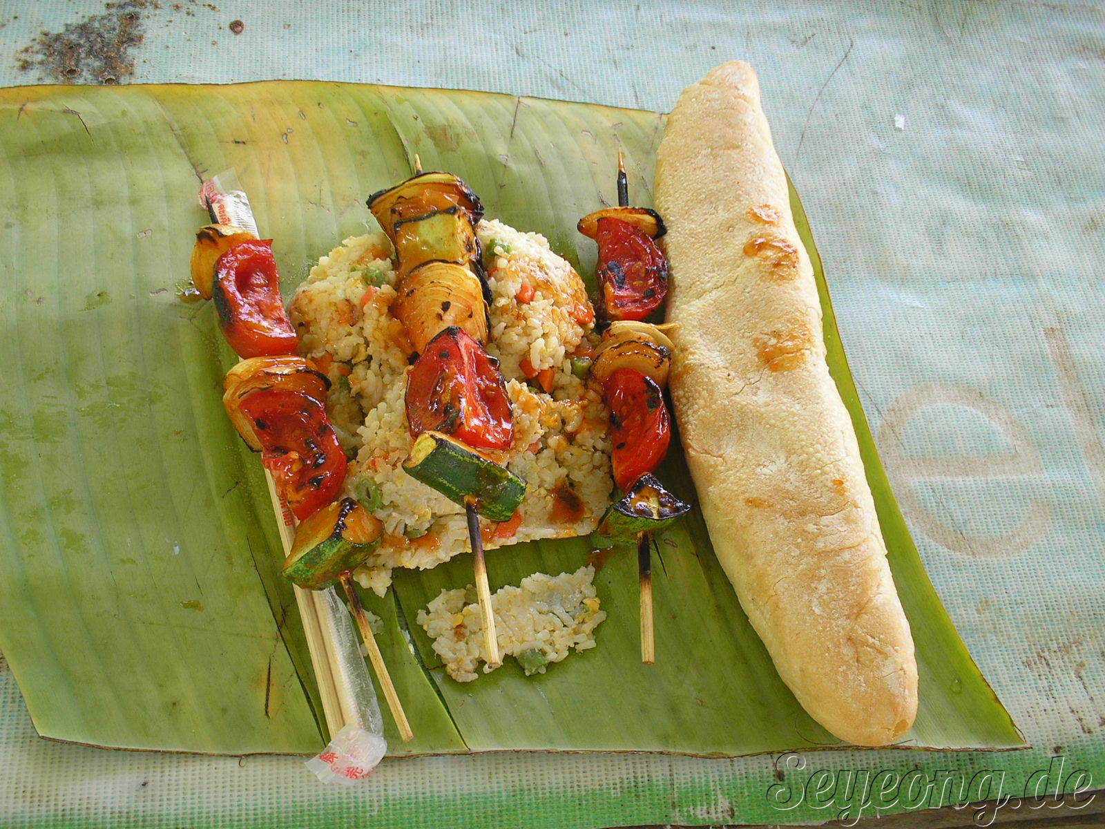 빵과 볶음밥과 같이 제공된 꼬치. 개인적으로 고기 꼬치가 더 맛있었다.