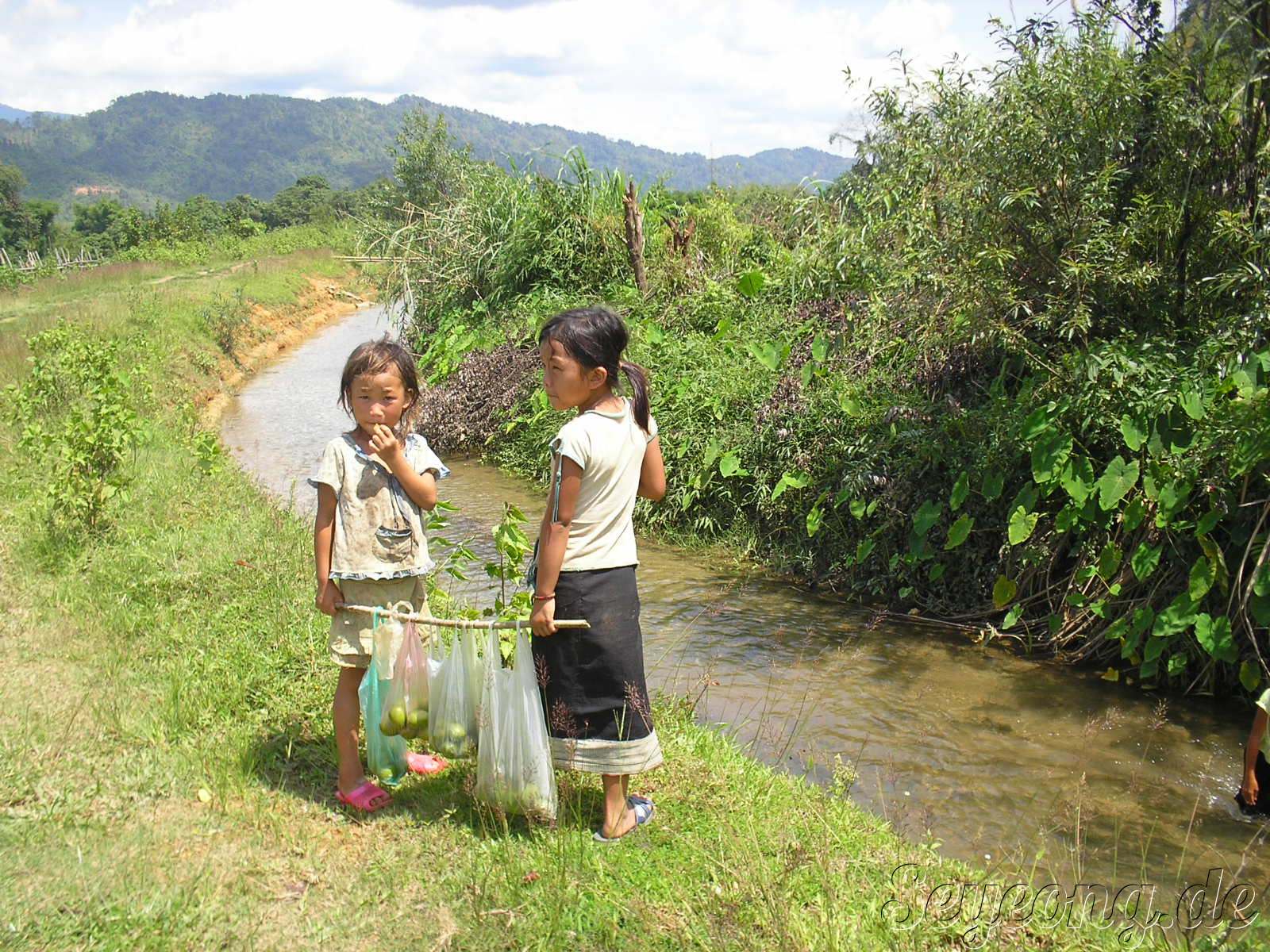 지나가는 길 만난 라오 꼬마들. 물건을 나르는 방식이 인상적이다.
