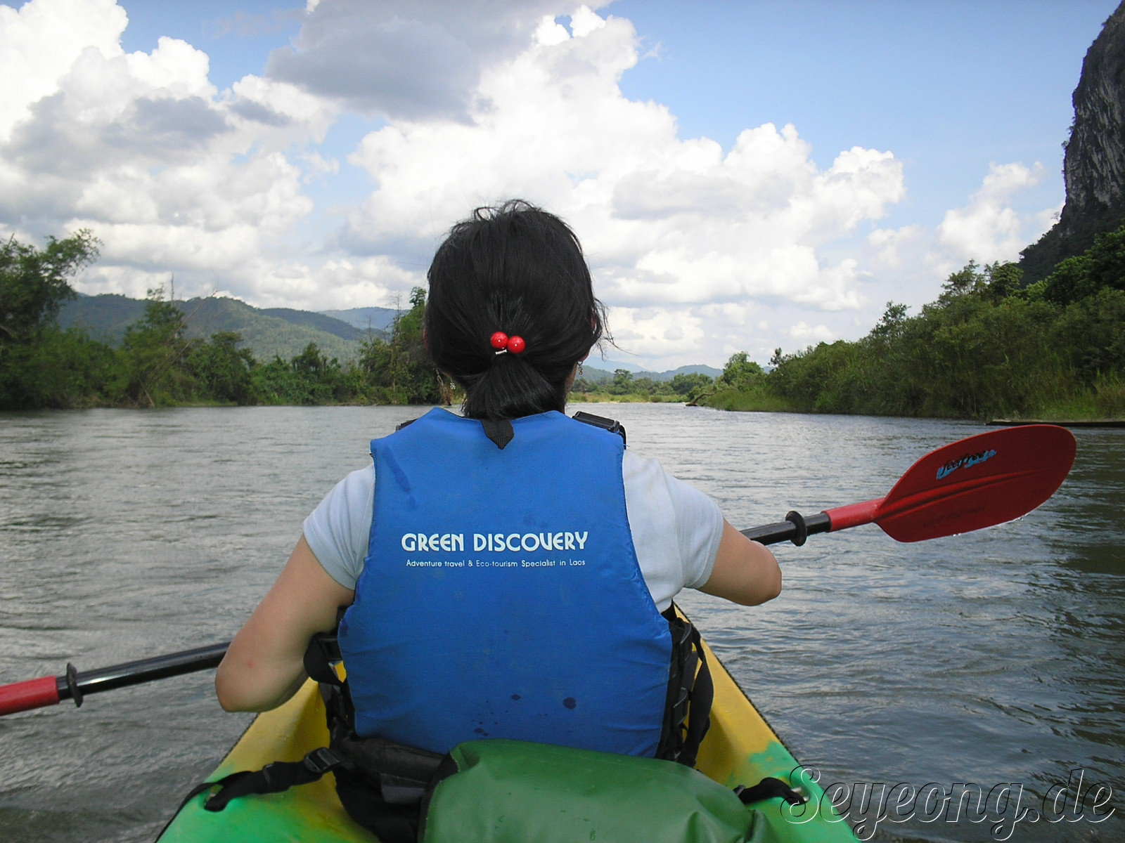 노를 앞뒤로 열심히 저으며 강을 따라갔다. 사실 강이 위험한 급류가 없기에 카약을 타며 경치를 보기에 가장 좋은 조건을 갖추었다.