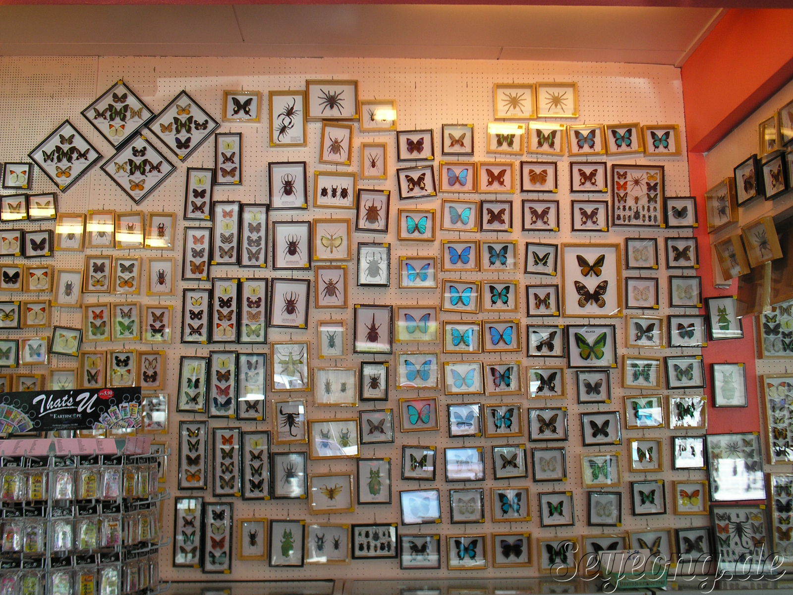 정원 밖의 관광품 가게에서는 다양한 나비 표본을 살 수 있다.