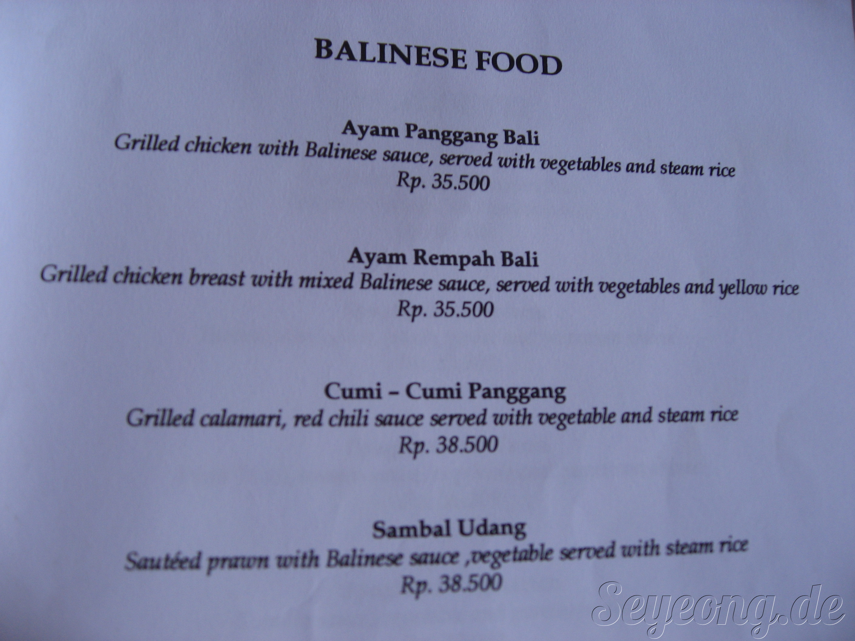 빌라 안의 레스토랑의 발리 음식 메뉴.