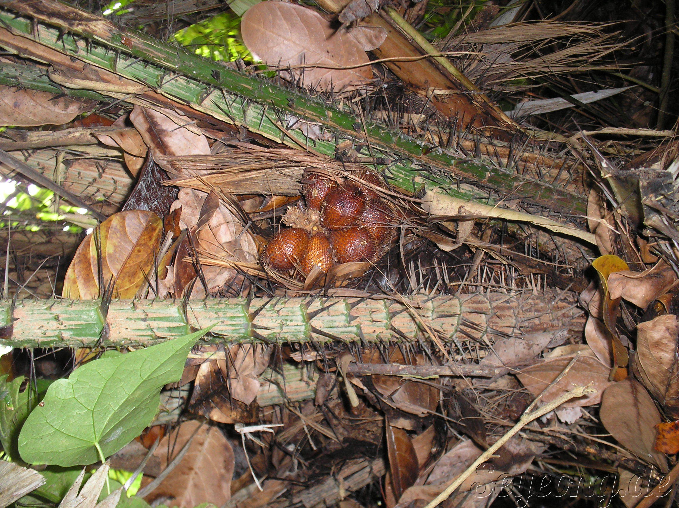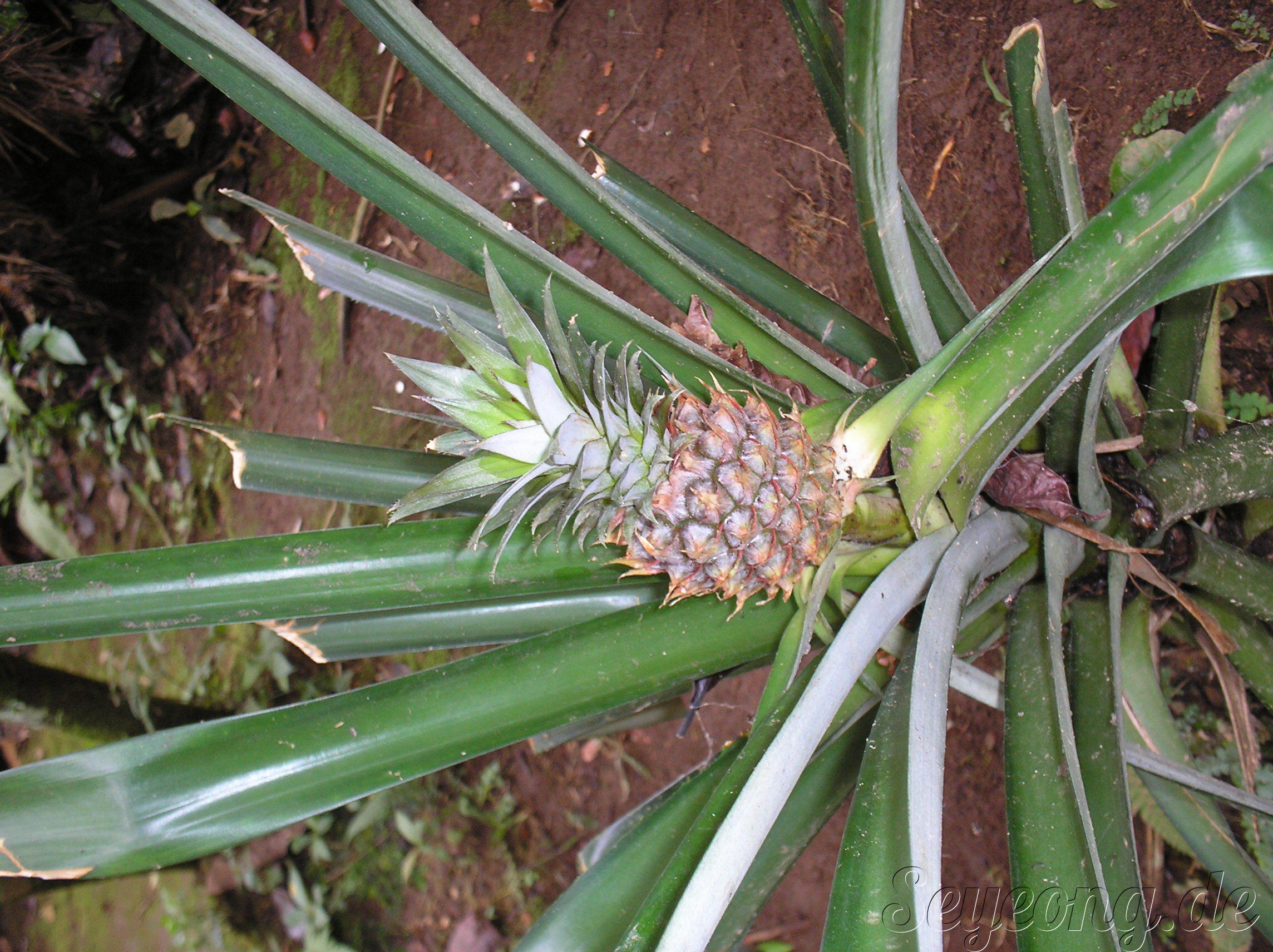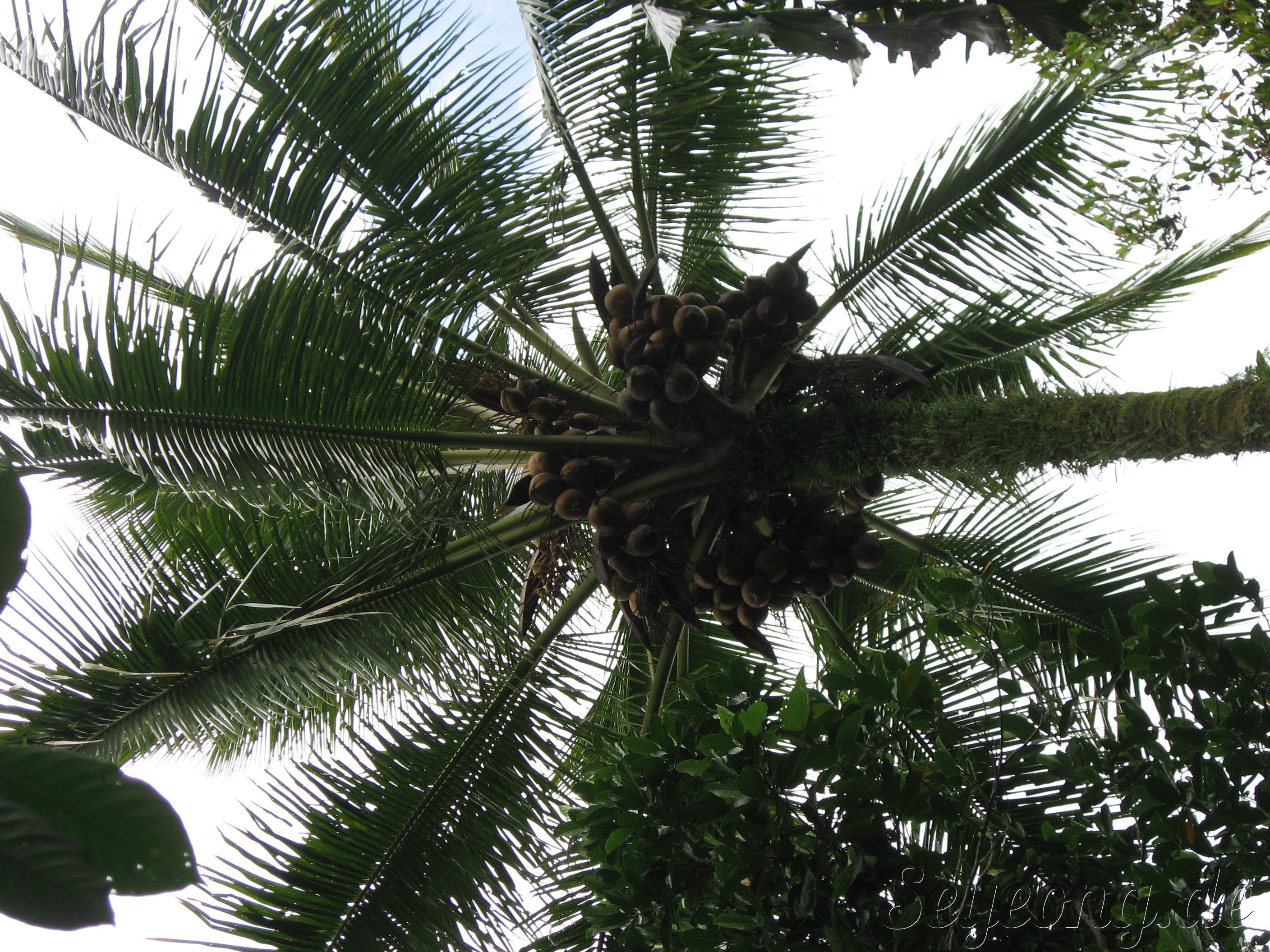 농장 여러 쪽에는 코코넛이 달린 야자수 나무가 이곳 저곳 있다.