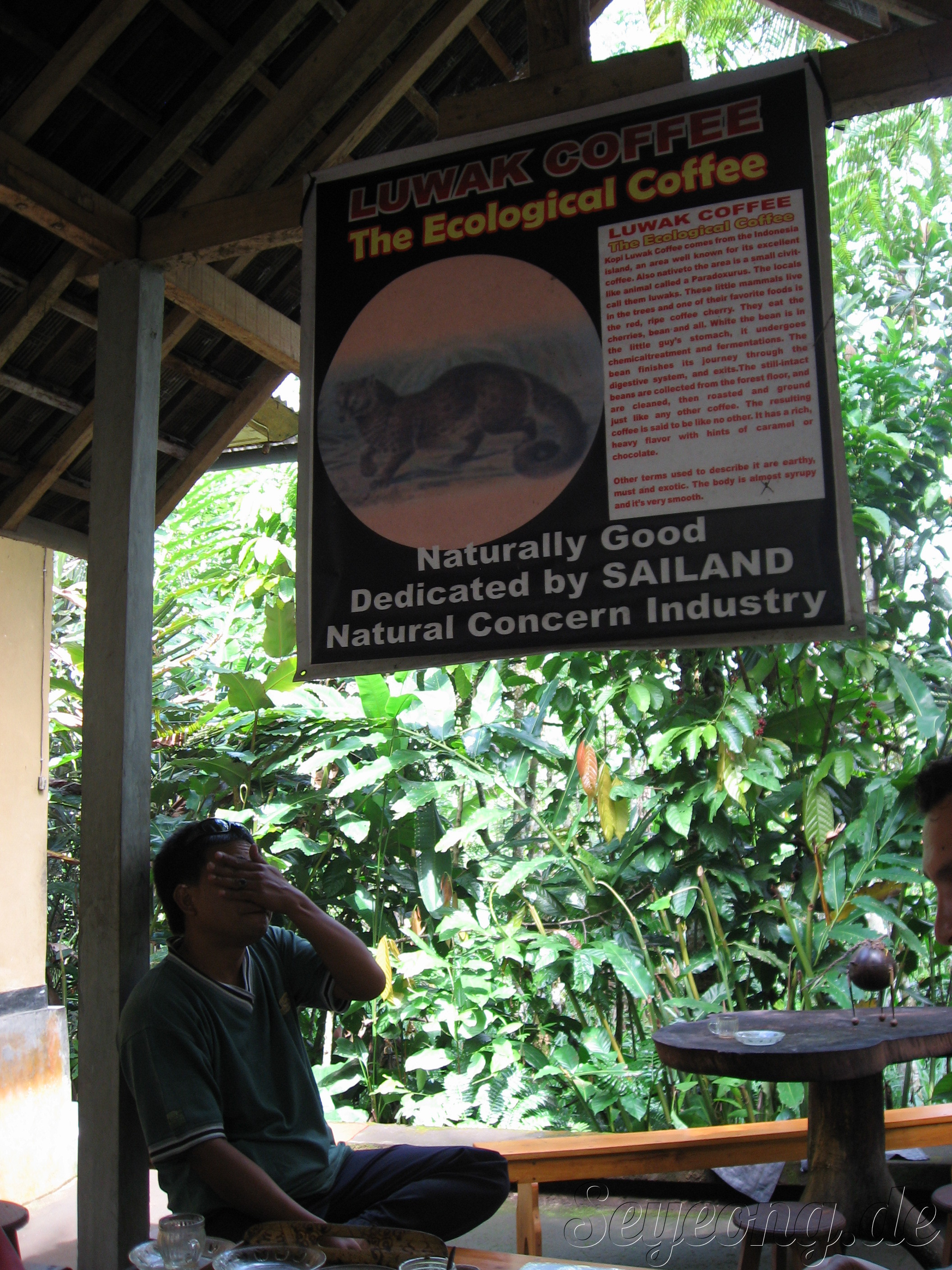 특히 이곳에 나는 Luwak Coffee가 유명하다. 다 익혀져 떨어진 커피 콩만 먹는 고양이과 맹수 인데, 그들의 대변으로 나오는 커피 콩은 이미 소화되고 숙성되어 최고의 맛을 자랑한다고 한다. 사기도 맛보기도 좀 그렇지만 세계 최고의 커피로 알려져 있다.