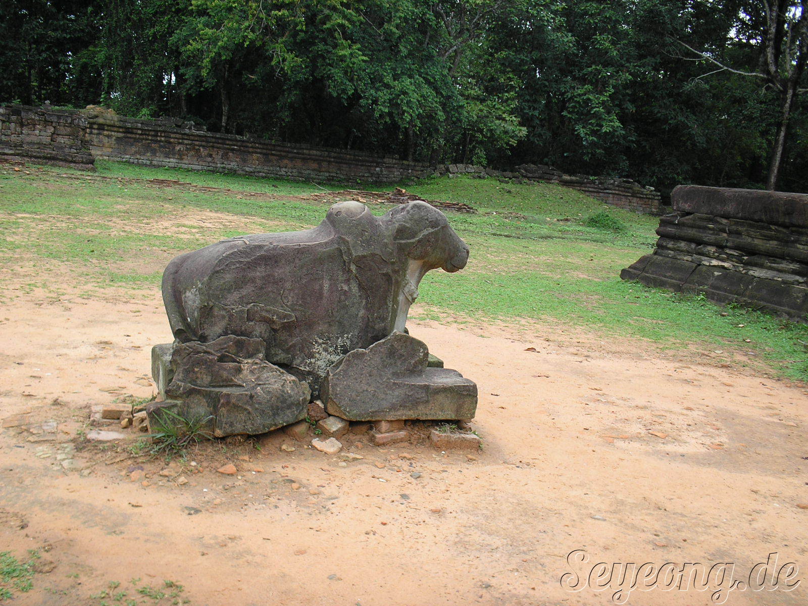 사원 앞에는 얼굴이 마모된 소 상이 절을 하듯 놓여 있다.