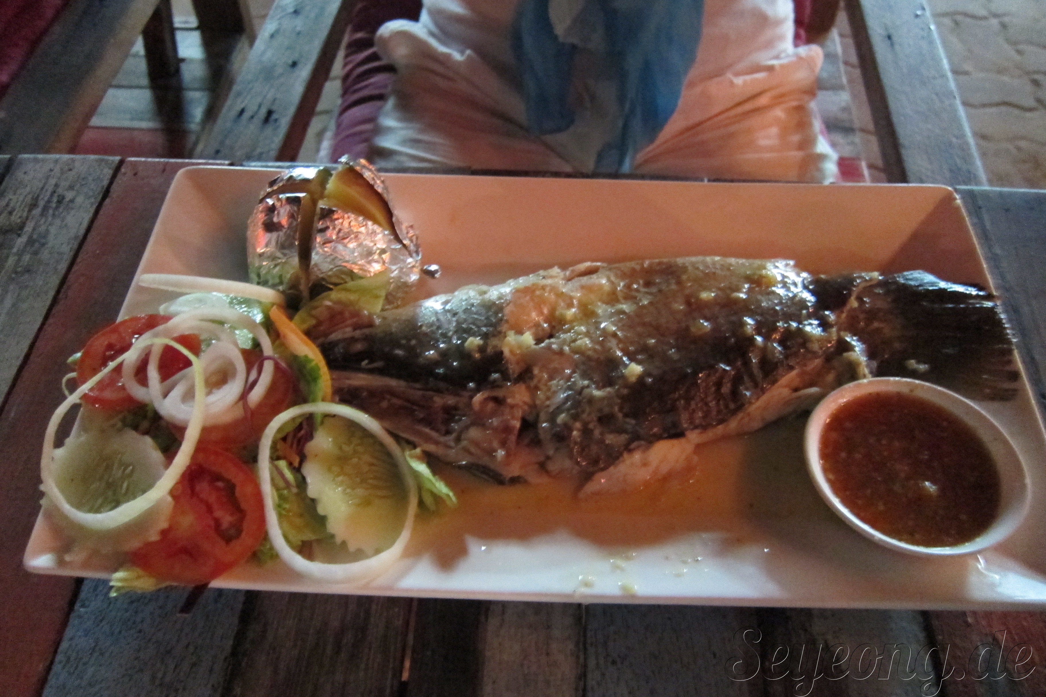 해변에서 직접 구워주는 생선. 마늘 소스에 찍어 먹을 수 있다.