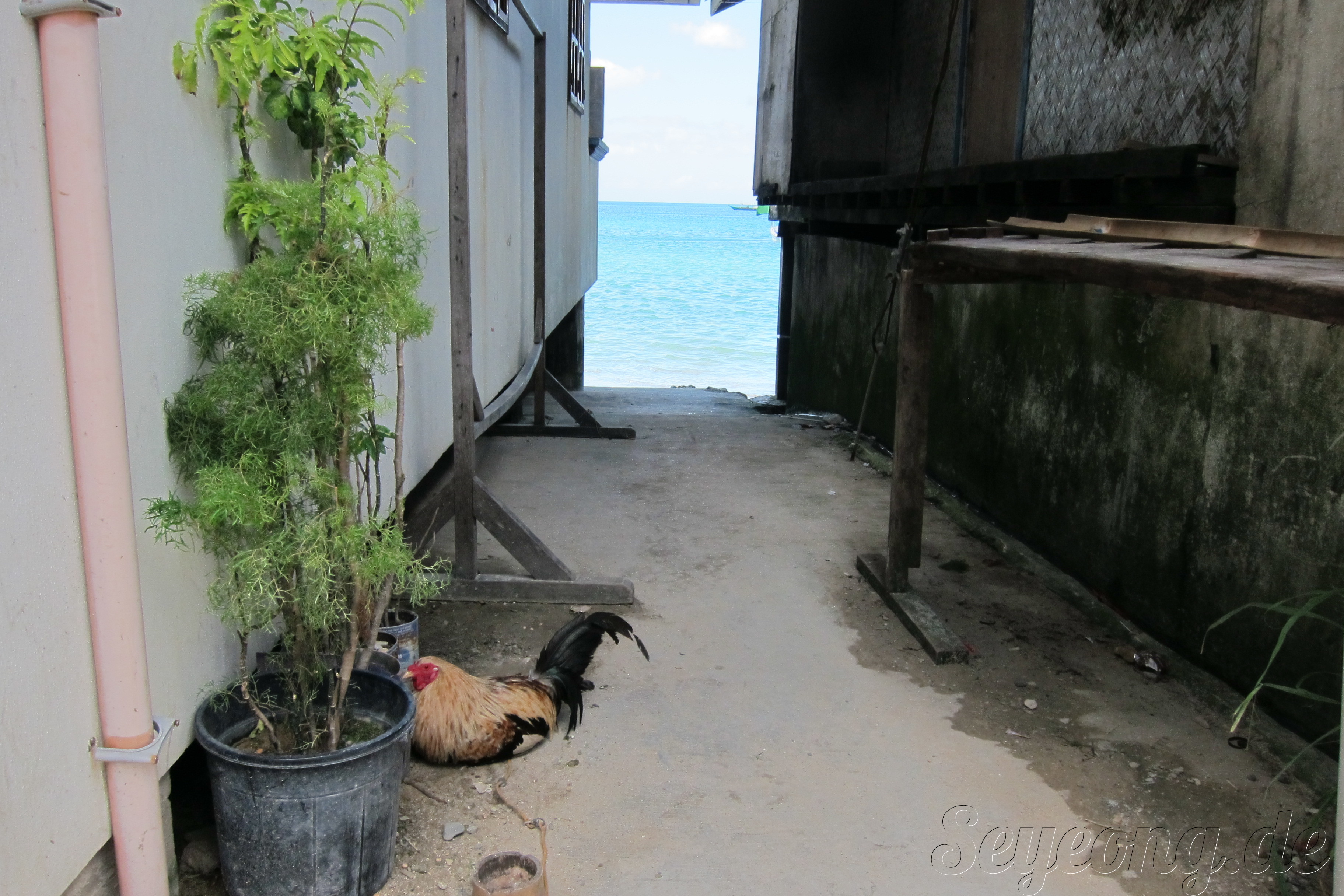 해변을 따라 쭉 들어선 집들에는 아직도 유기농 닭들이 이동한다.