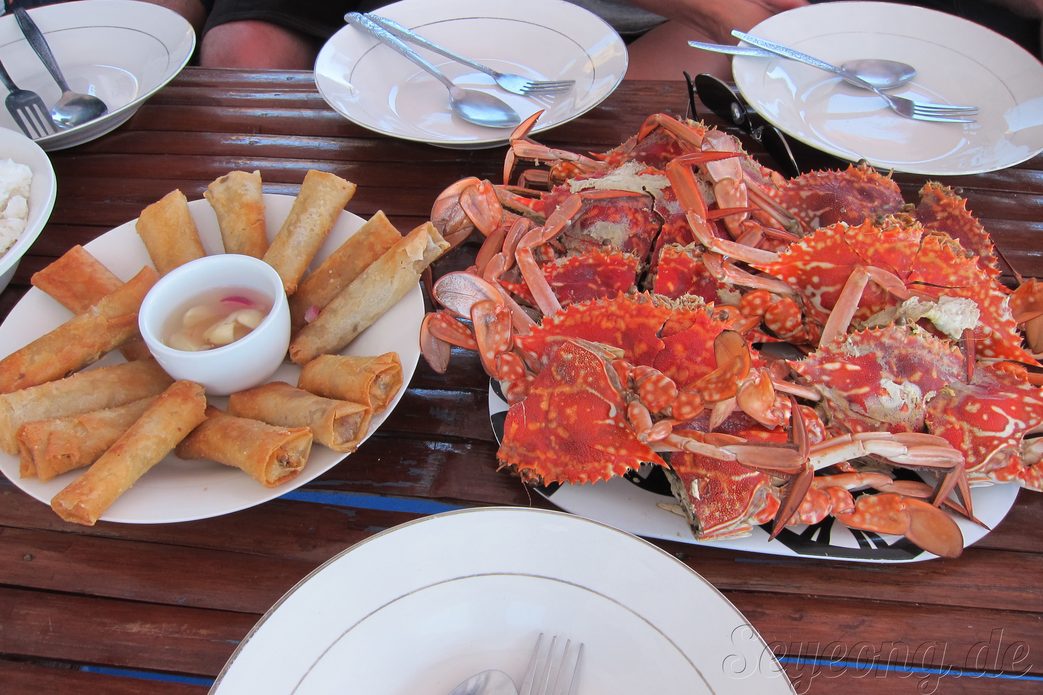 두가지 종류의 꽃게와 야채 카레 그리고 생선 스프링 롤이다.
