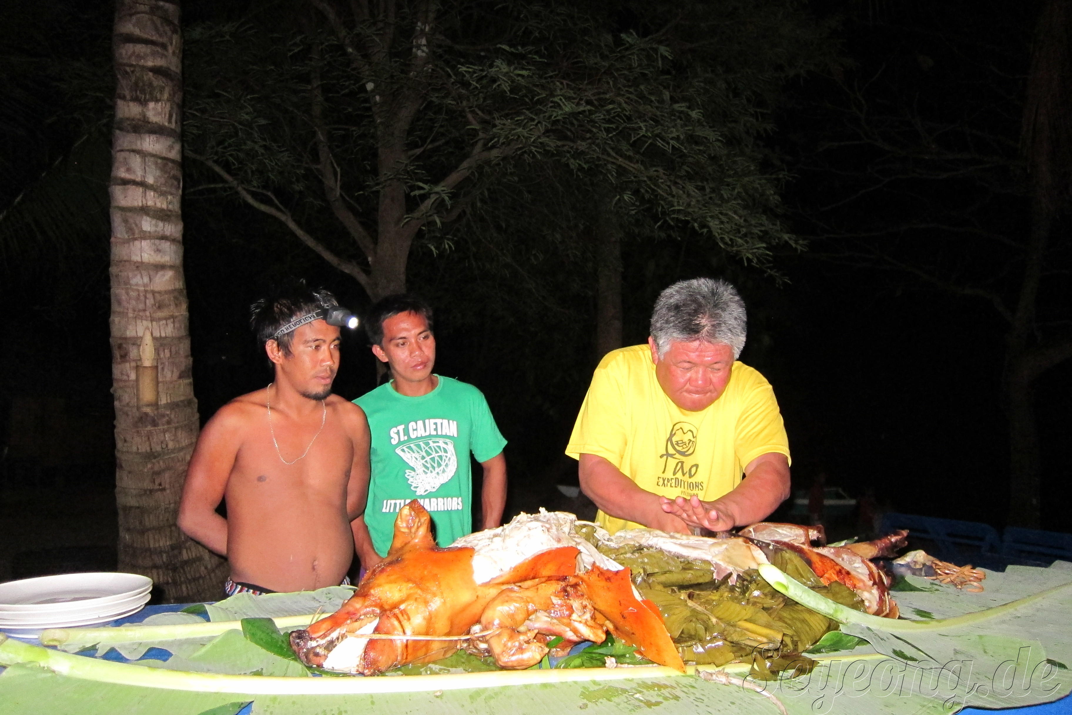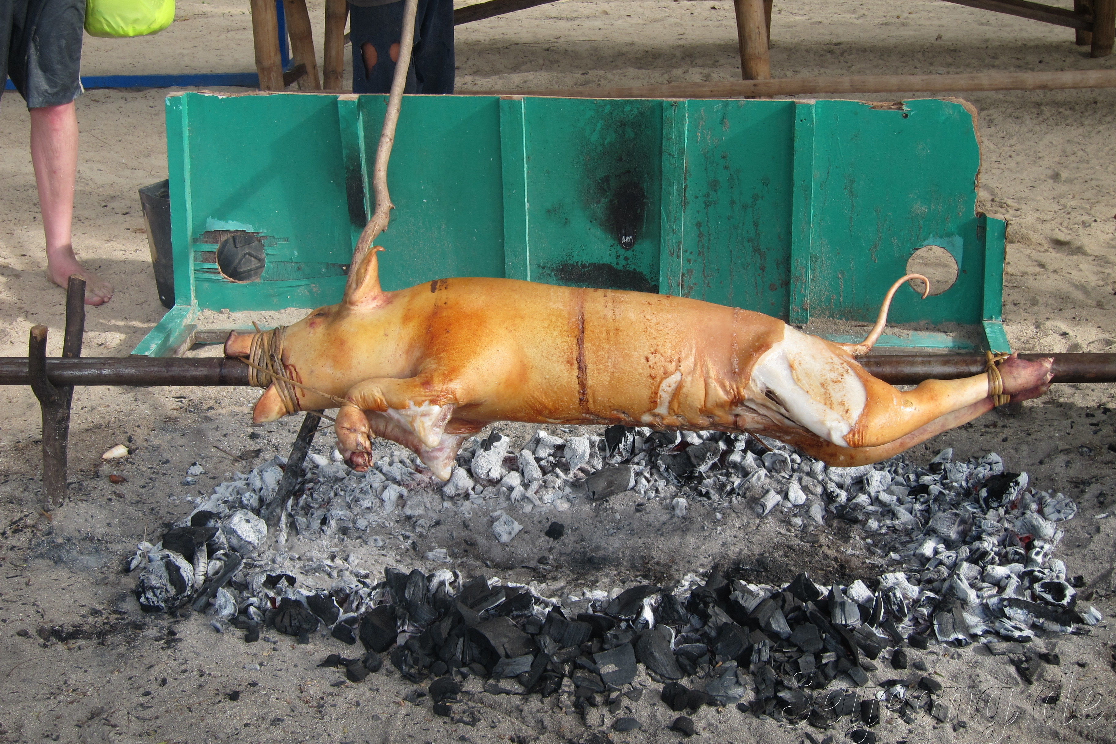 필리핀 섬에서 먹는 수동식 통돼지 구이. 우리가 오기 전 부터 이미 섬 사람은 손으로 통 돼지를 구으면서 익히고 있었다.