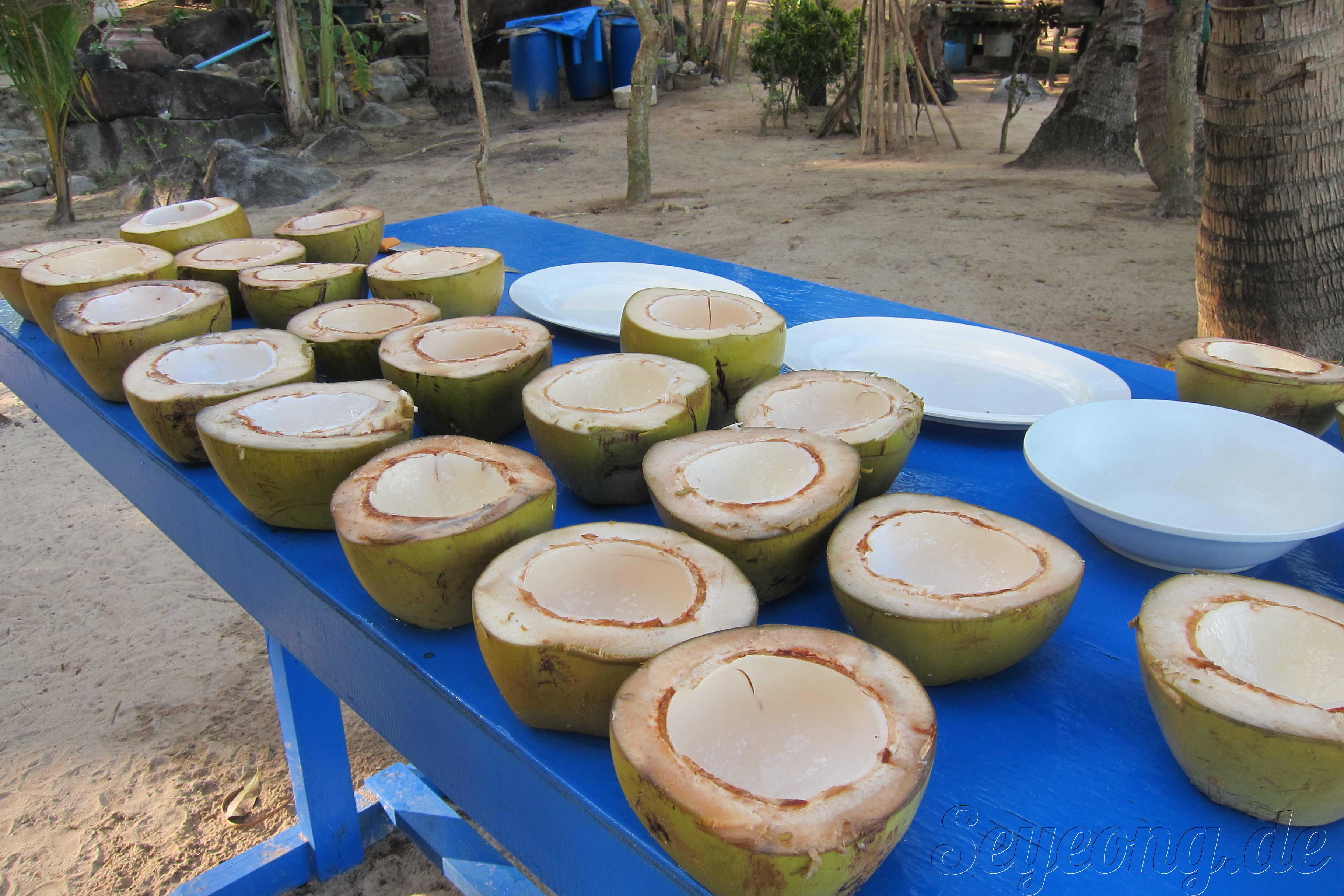 야자수 나무에 둘러싸인 이곳. 코코넛을 따기 위해, 올라갈 발판을 마련하느라 야자수 나무를 도끼로 찍어놓았다.