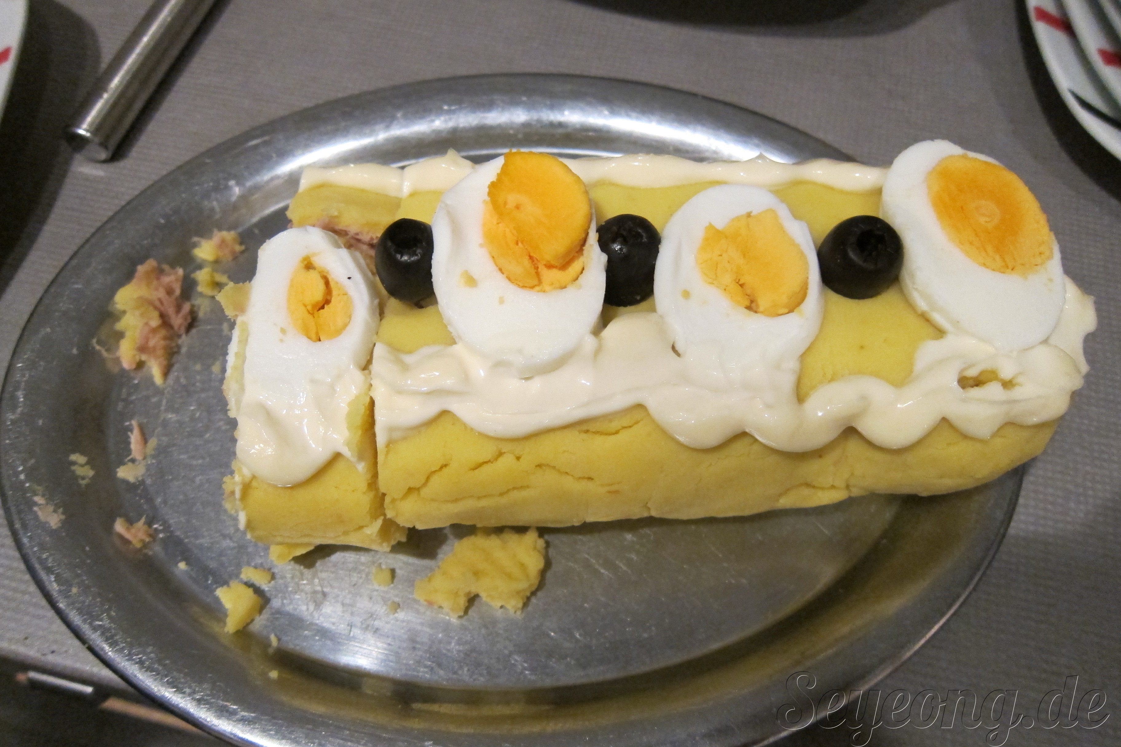 페루의 전채음식. 이름은 까먹었다. 감자로 만든 빵안에 닭고기나 참치가 들어 있고 그위에 달걀과 올리브가 올려져 있다.