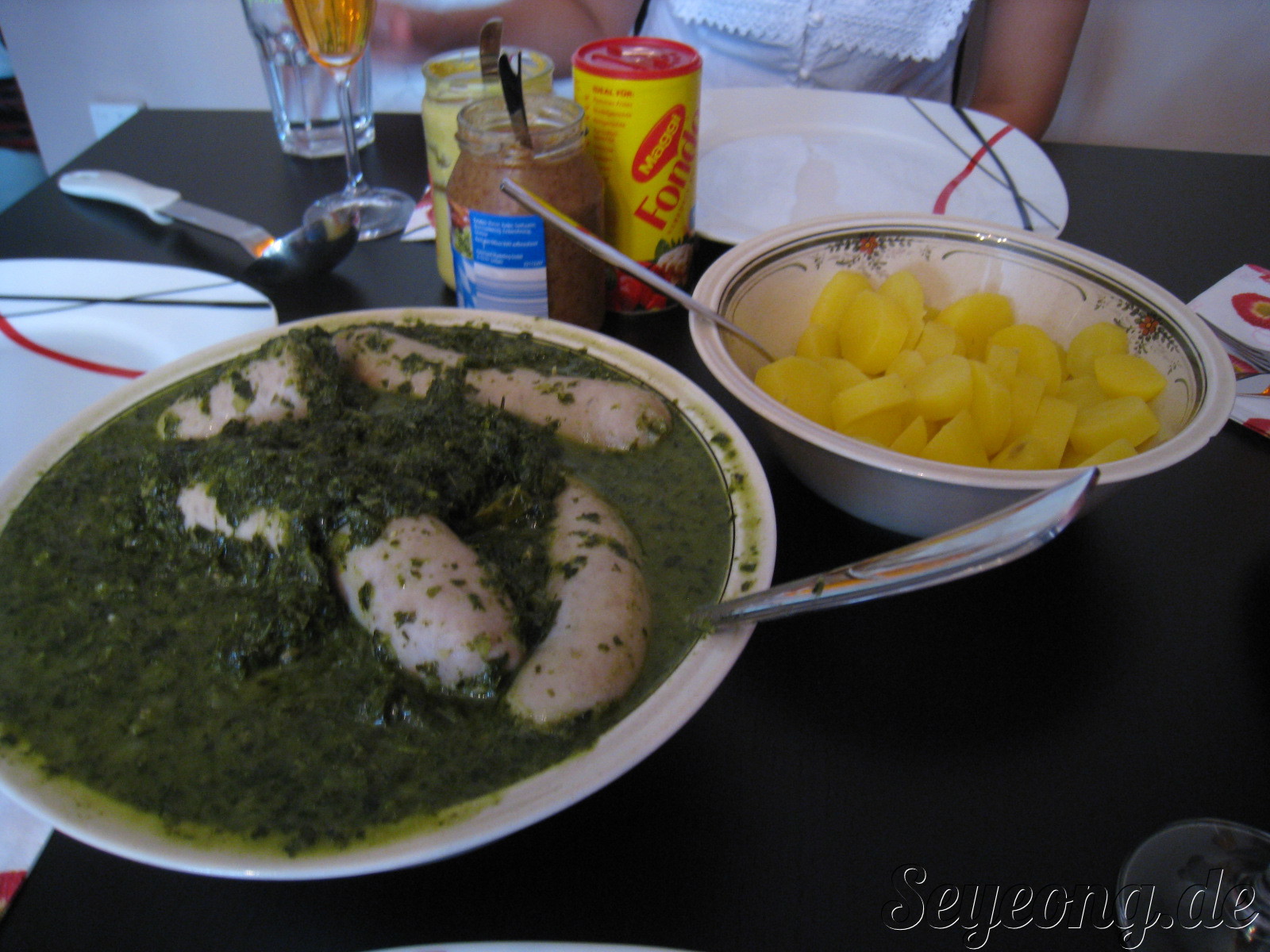 첫째날 플로리안이 준비한 저녁, 독일 북쪽의 그륀콜(Gruenkohl)이라고 불리는 야채와 함께 푹익힌 소세지를 같이 먹는 요리.