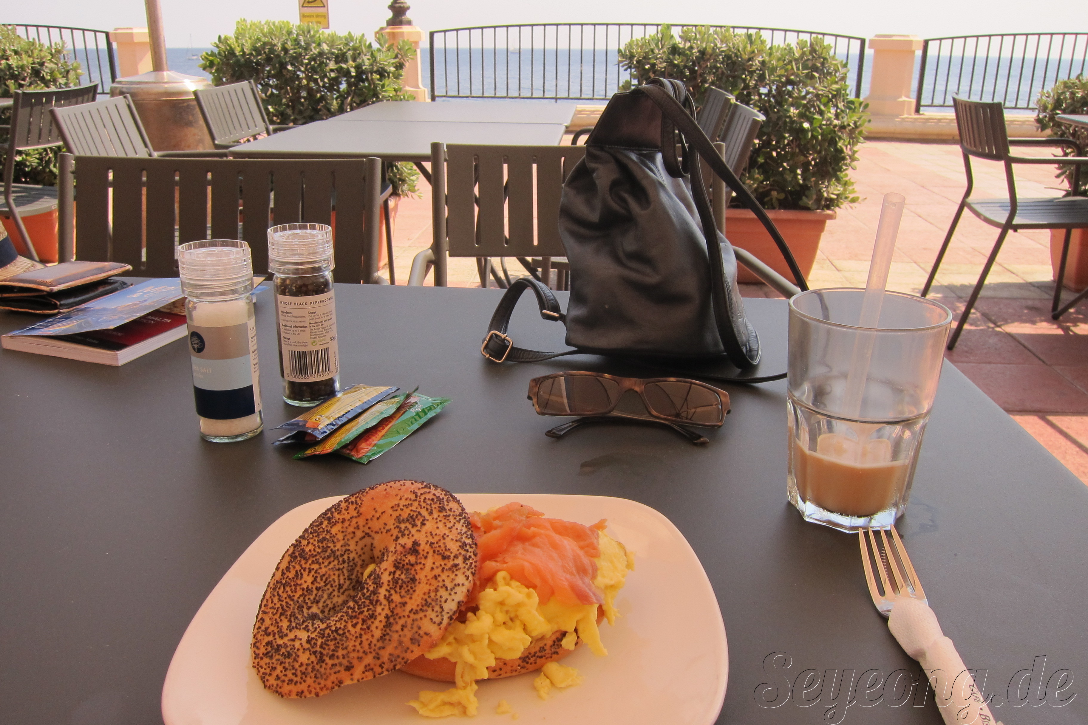 시원한 과일 주스와 까페모카. 훈제 연어와 스크램블 에그와 함께한 베이글.