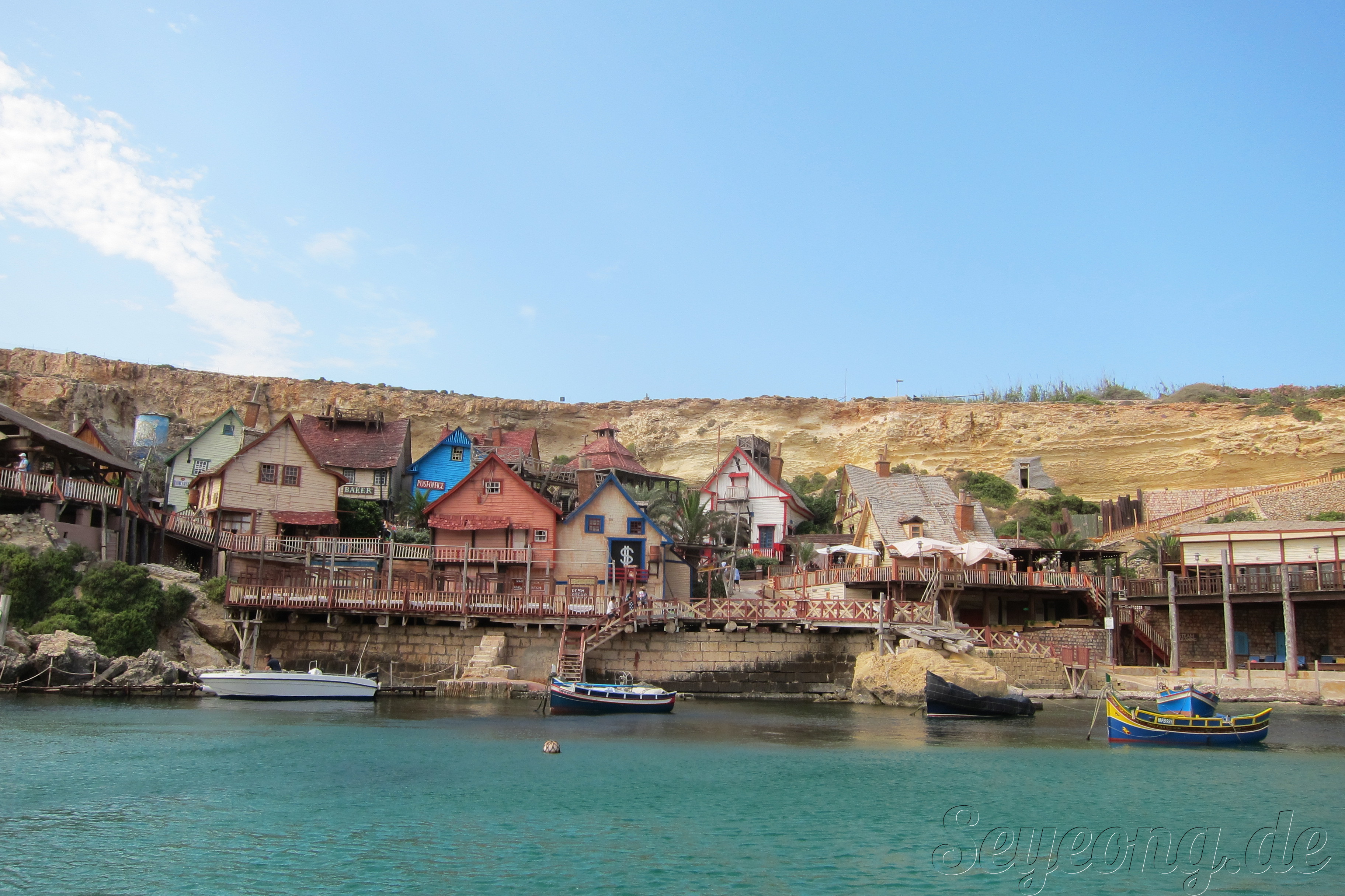 떠 있는 보트는 몰타 전통배. 물에서는 작은 어치들을 볼 수 있다.