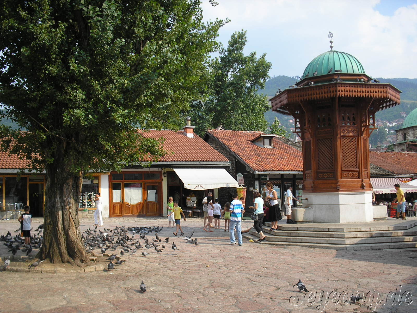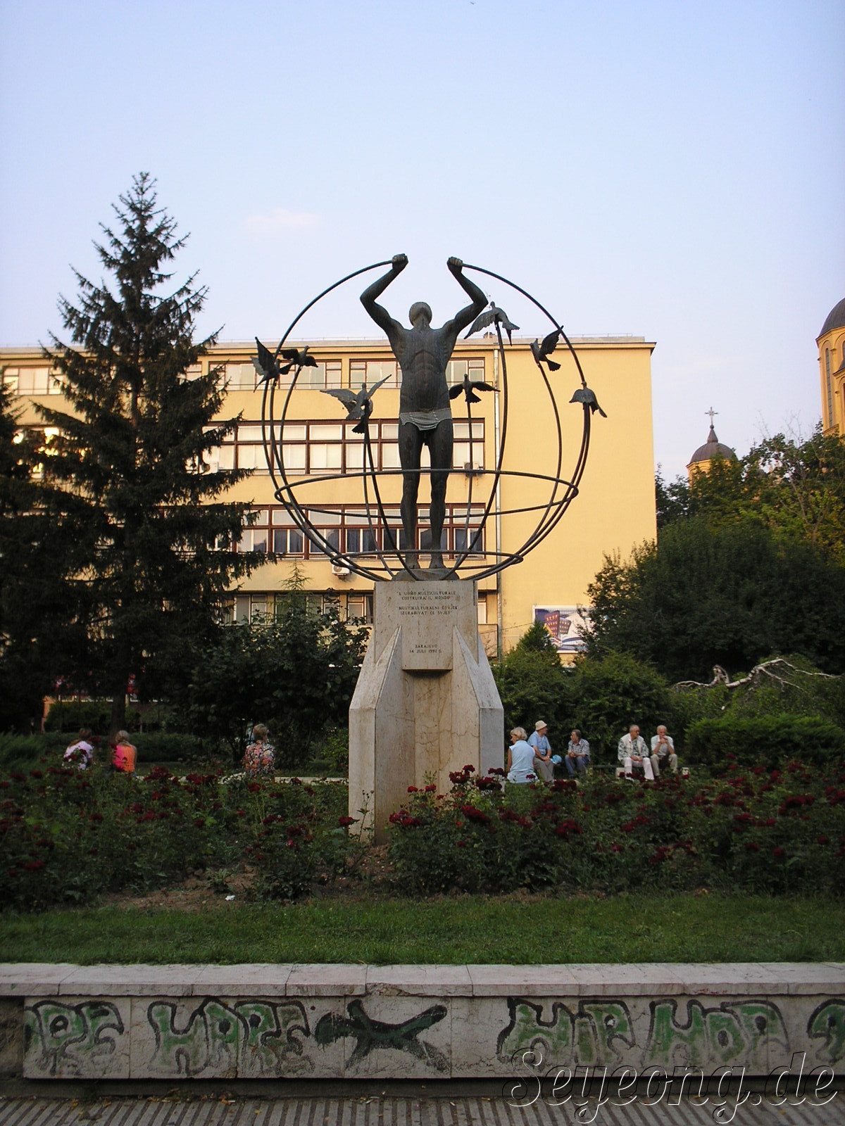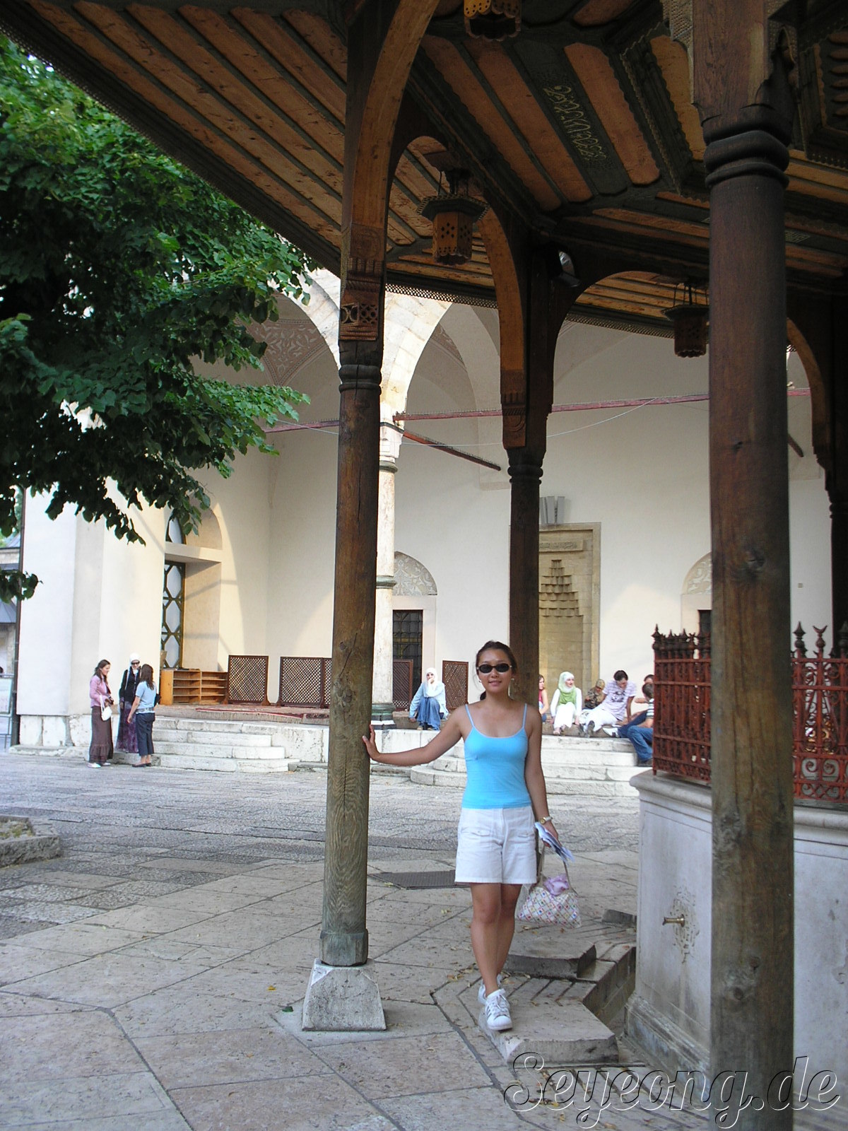 난 지금 보스니아-헤르체코비나의 수도 사라예보 중심가의 orthox Central 교회 앞의 벤치이다.