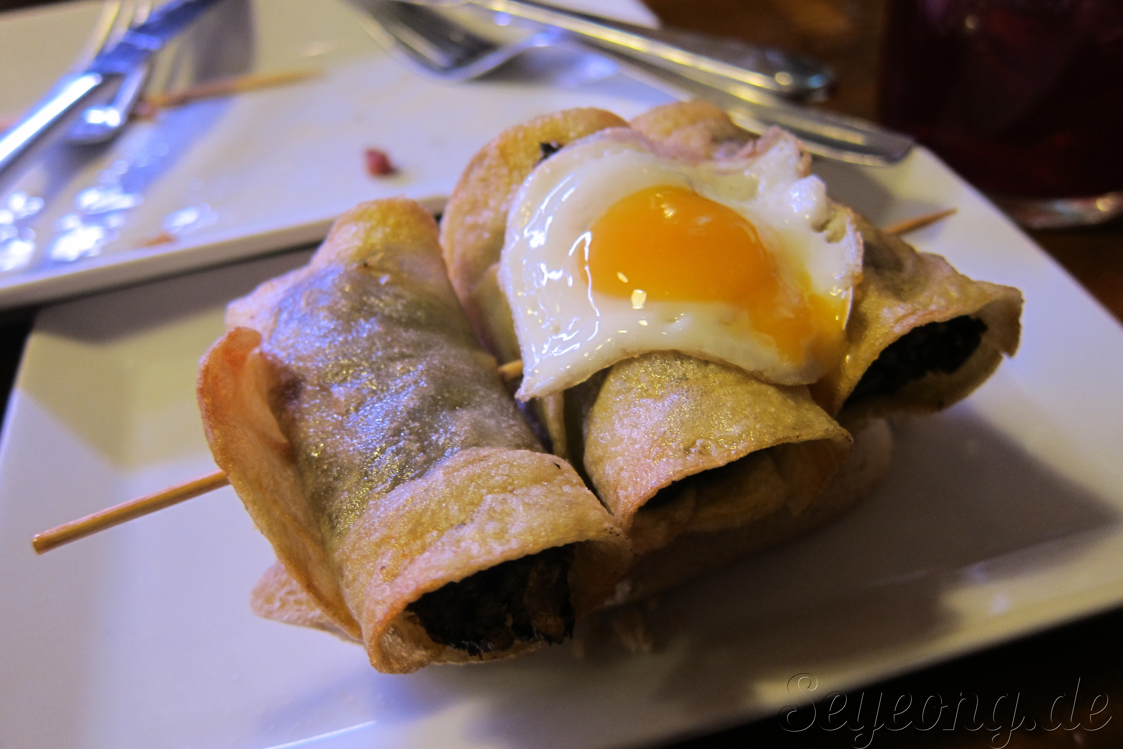 우리나라의 순대맛과 비슷한 흑소세지를 튀긴 것과 그 위의 메추리알.