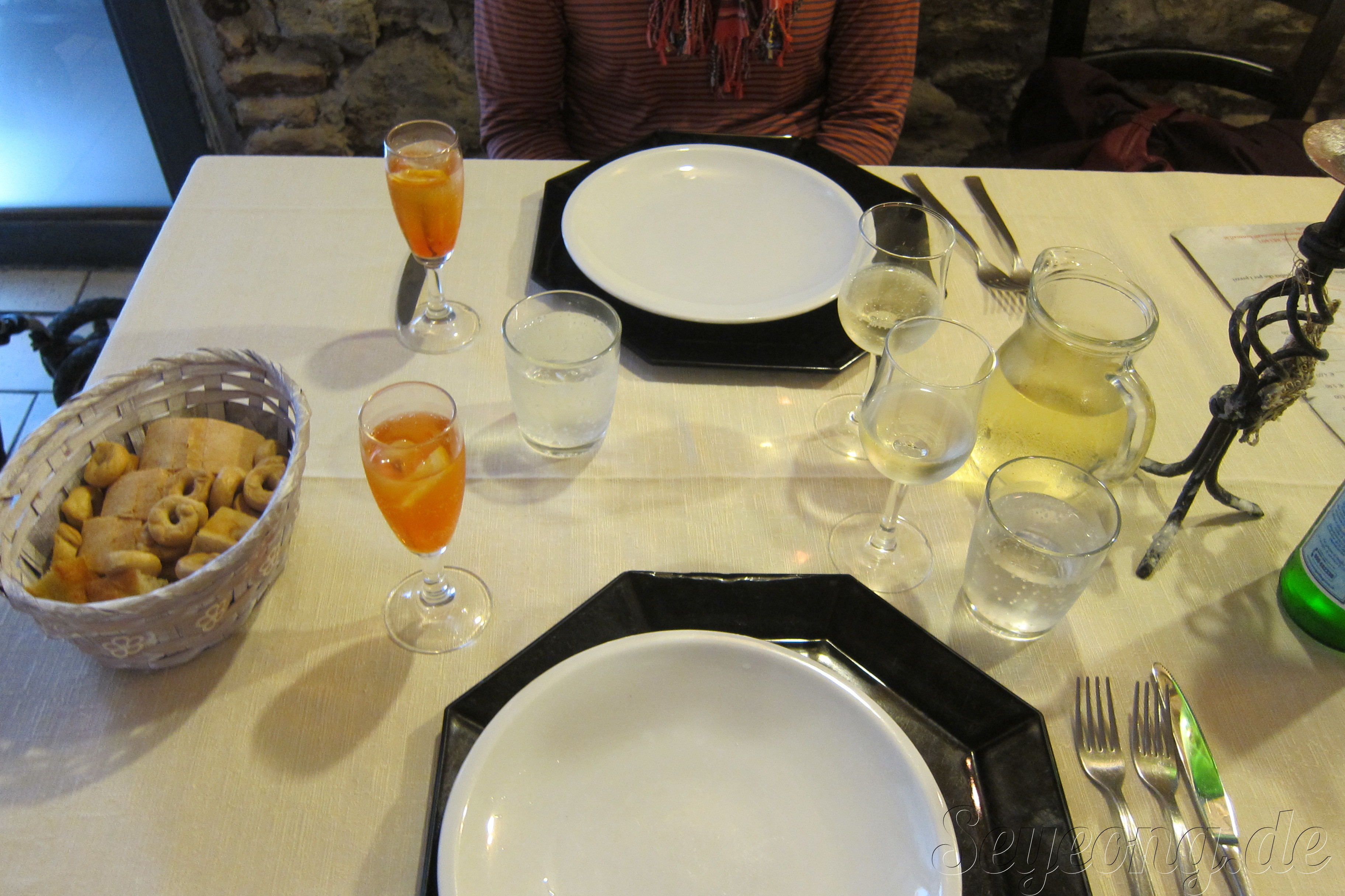 아페롤과 화이트 와인. 이태리 음식은 테이블 세팅이 사람 명수대로 다르고, 차려진 빵을 먹을 수 있다. 그리고 전채 음식과 함께 1차 음식, 2차 음식으로 주음식이 나뉘어진고, 후식이 있다. 그래서 주음식을 한개 주문하면 조금 양이 작다는 느낌을 받을 수 있다.