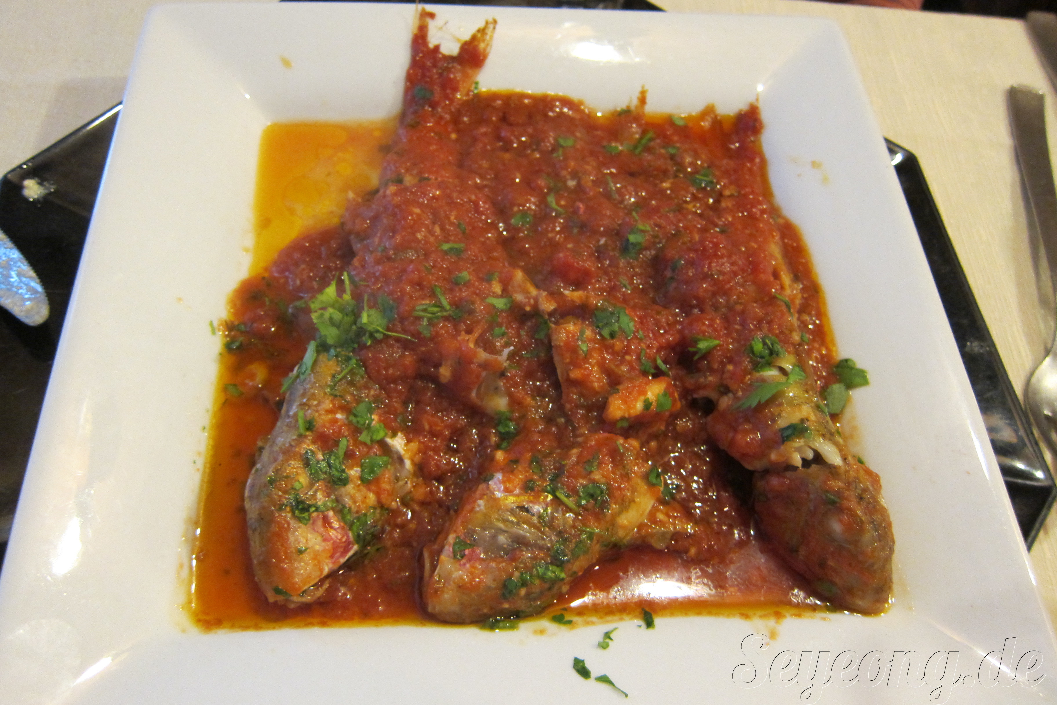 빨갛다고 매운 것이 아니다. 구운 생선을 토마토에 요리한 멋진 생선요리. 잊을 수 없는 맛.