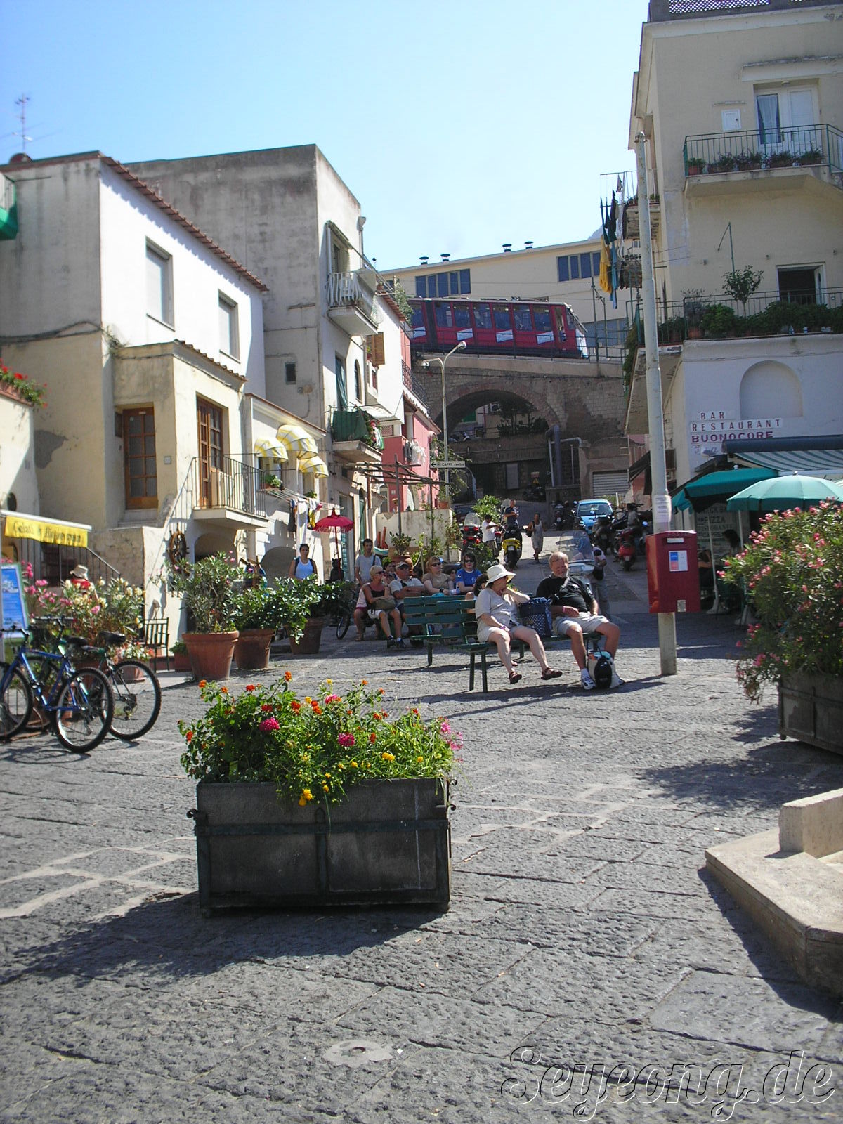 카프리섬의 맨 꼭대기위를 잇는 레일을 따라 움직이는 조그만 전차도 보인다.