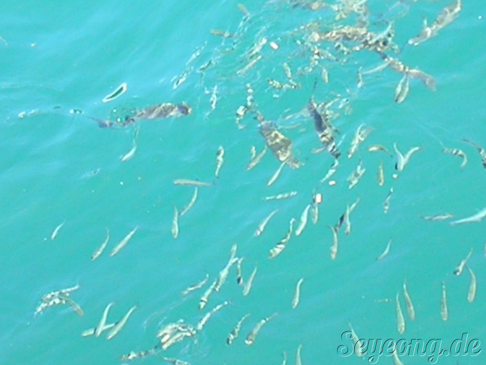 어떤 사람이 과자를 바닷가에 뿌렸는데, 이런 물고기 떼가 모인다.