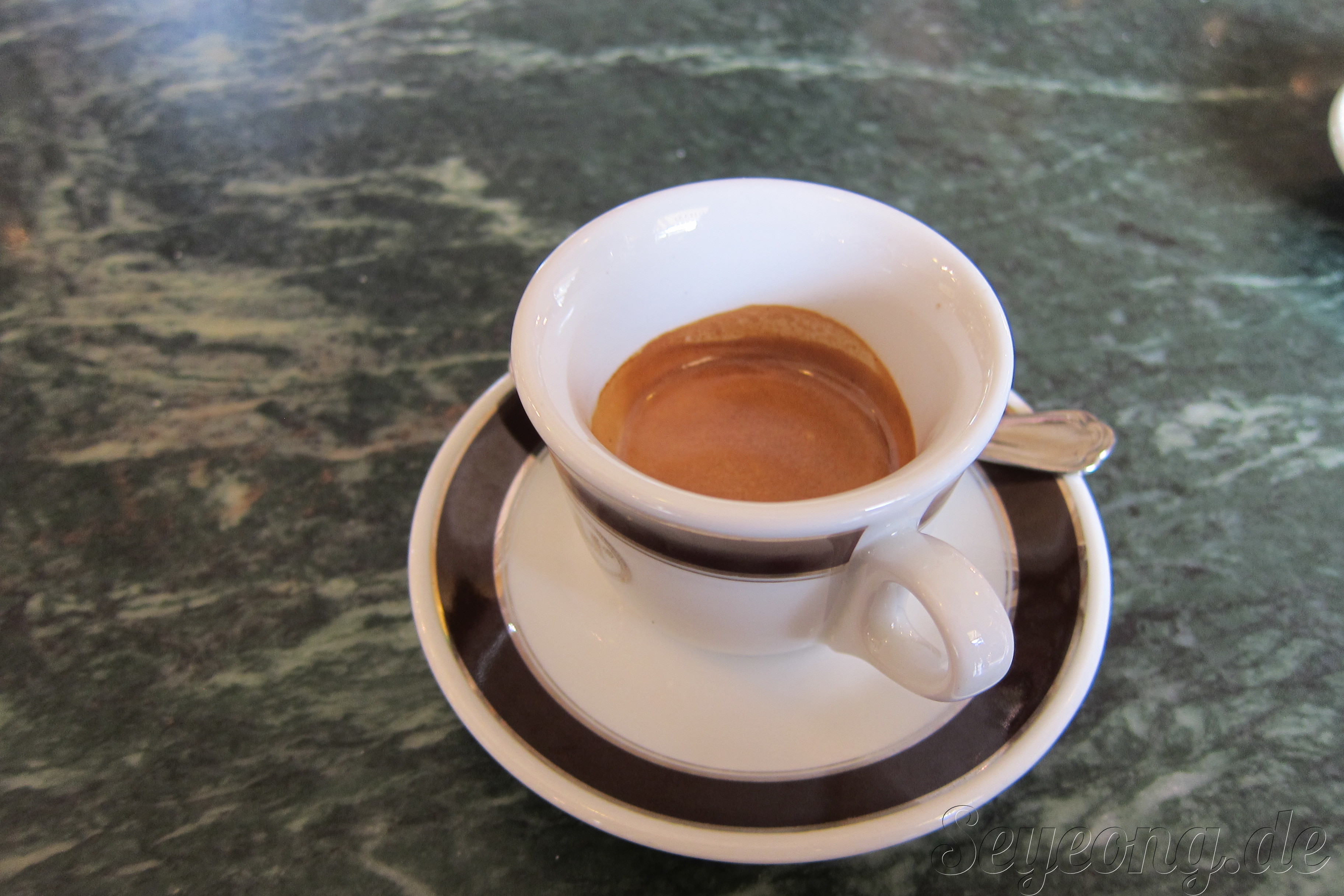 에스프레소 한잔. 가격도 괜찮다. 하지만 바에서 먹는 것과 앉아서 먹는 것, 그리고 테라스에서 먹으면 커피가격이 5배나 넘어간다고. 론리플래닛은 경고하였고, 경고를 잘 새기어 바에서 맛보았다.