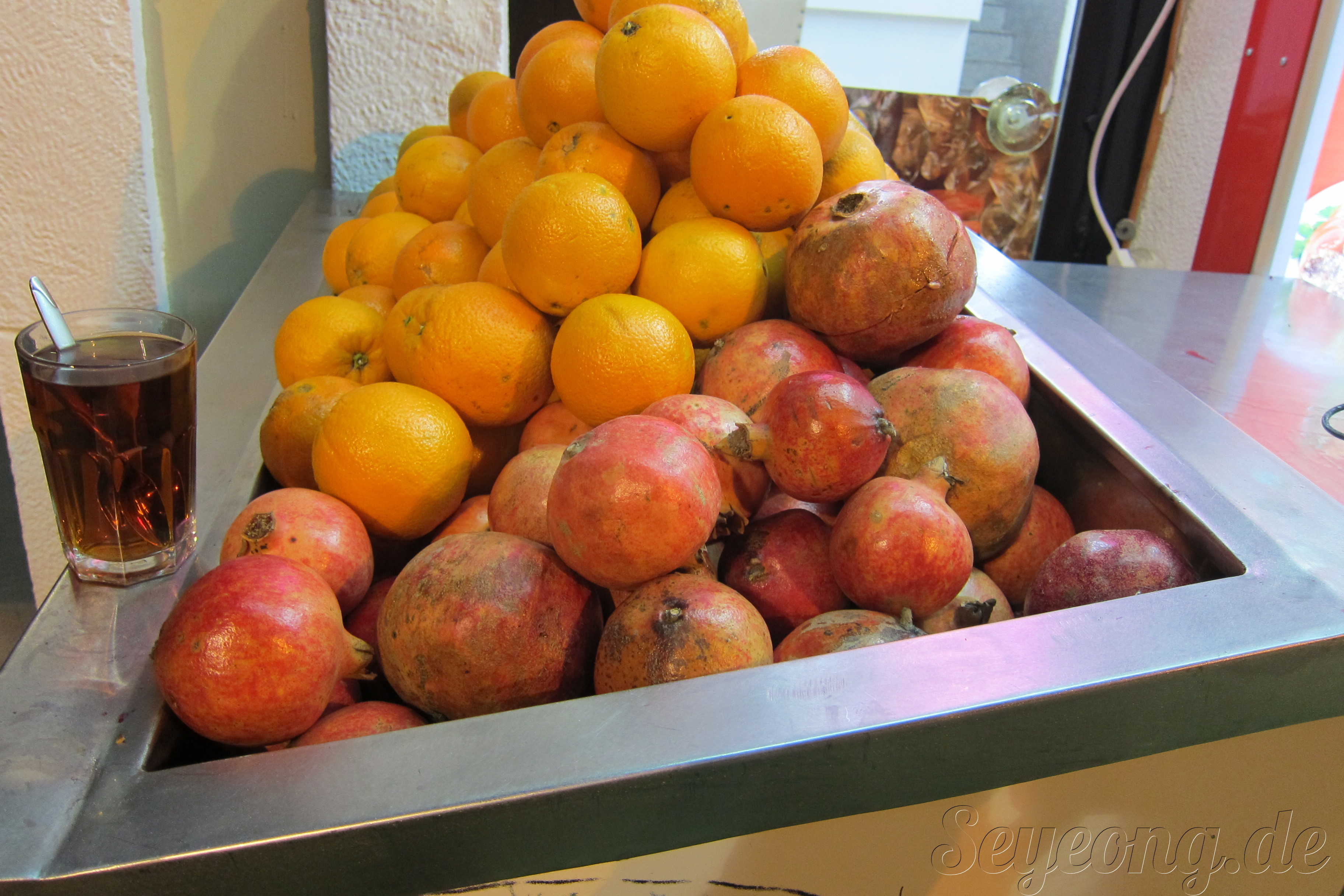 곁에 안탈야에서 유명한 오렌지와 석류를 갈은 과일 주스 주문.