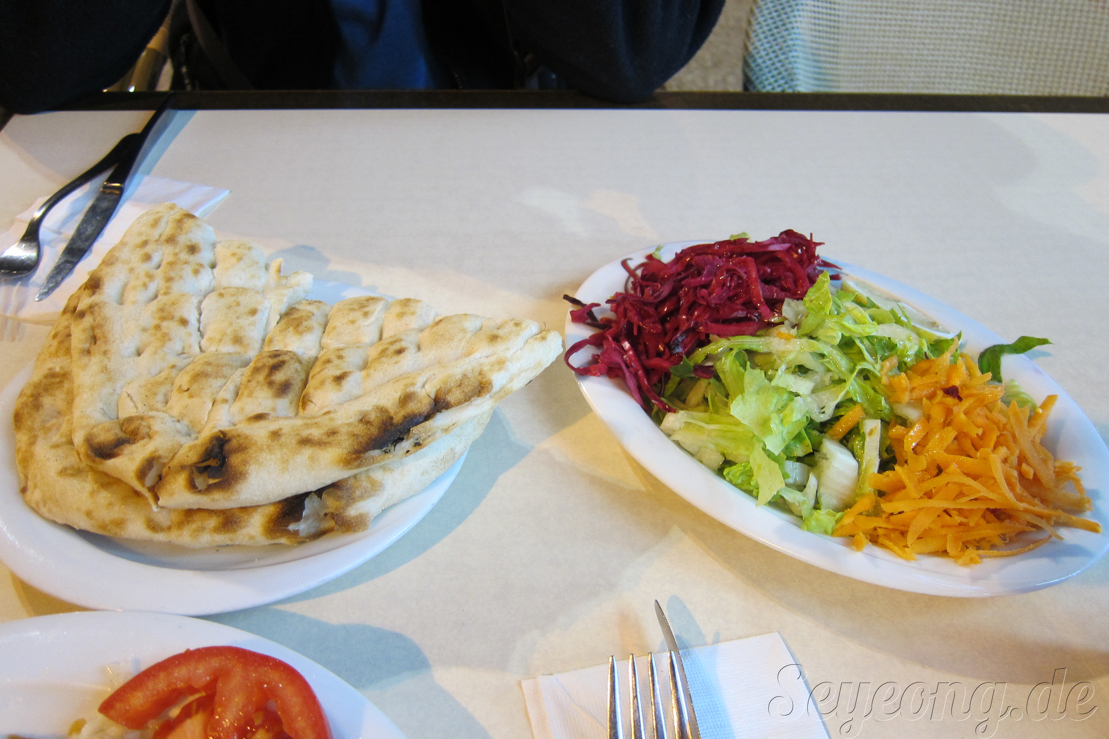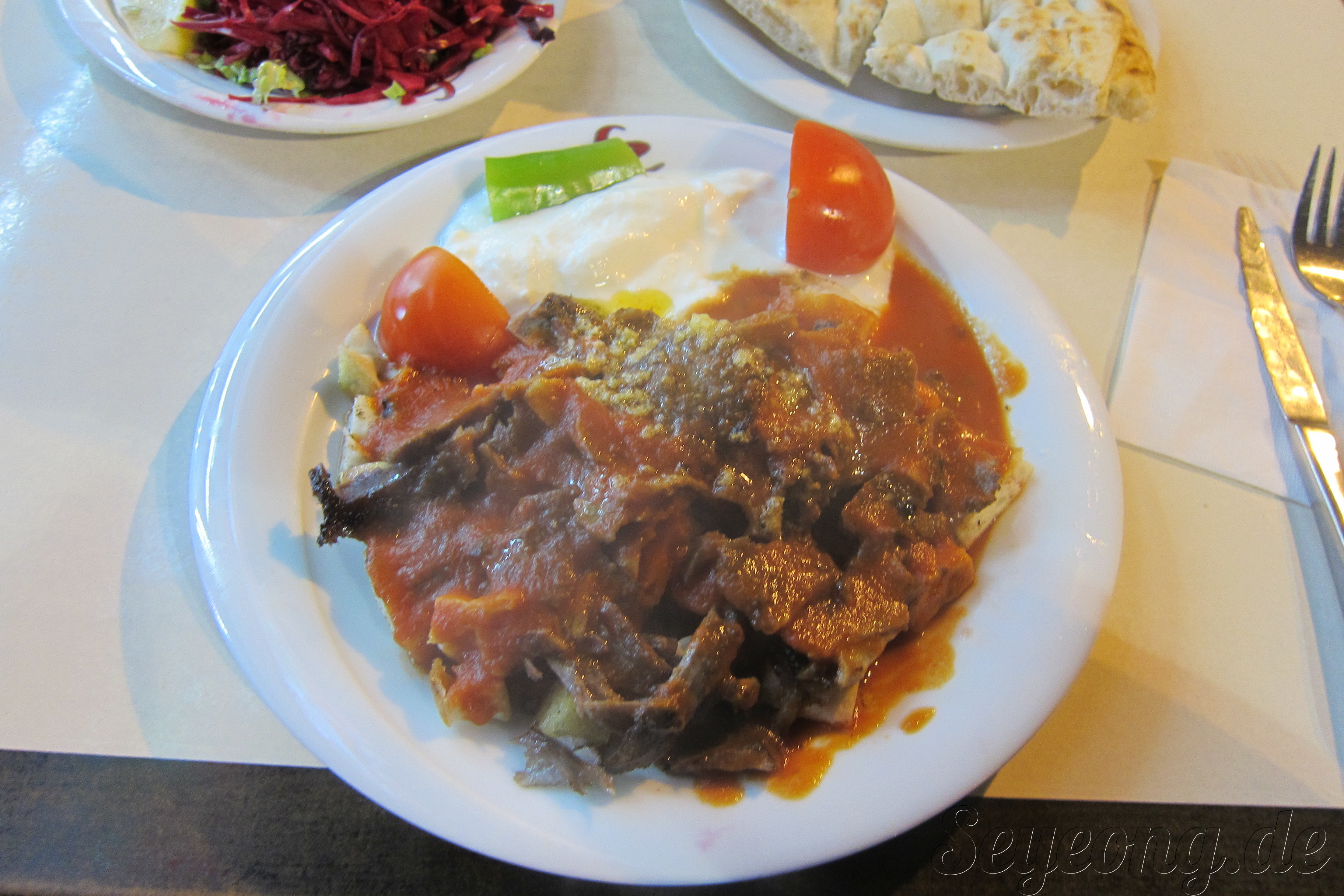 플로리안은 Iskender 되너 텔러를 주문하고, 난 그릴한 새우가 들어간 음식을 시켰다.