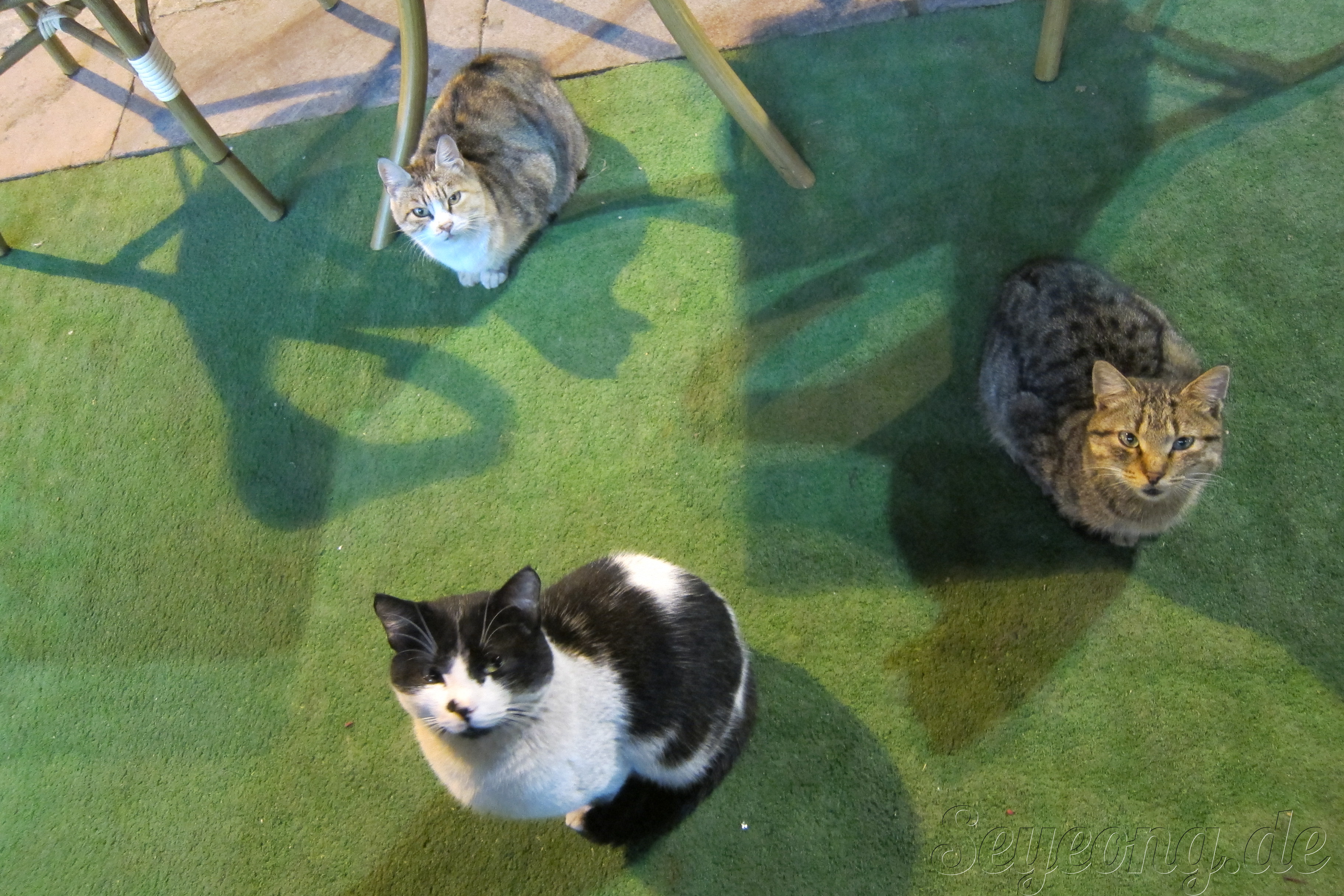 식탁밑에서 하나 둘씩 모여든 동네 고양이들. 먹을 것을 좀 줄까 기다리고 있다. 바다 가까이 사는 지중해에는 고양이가 유독 많다.