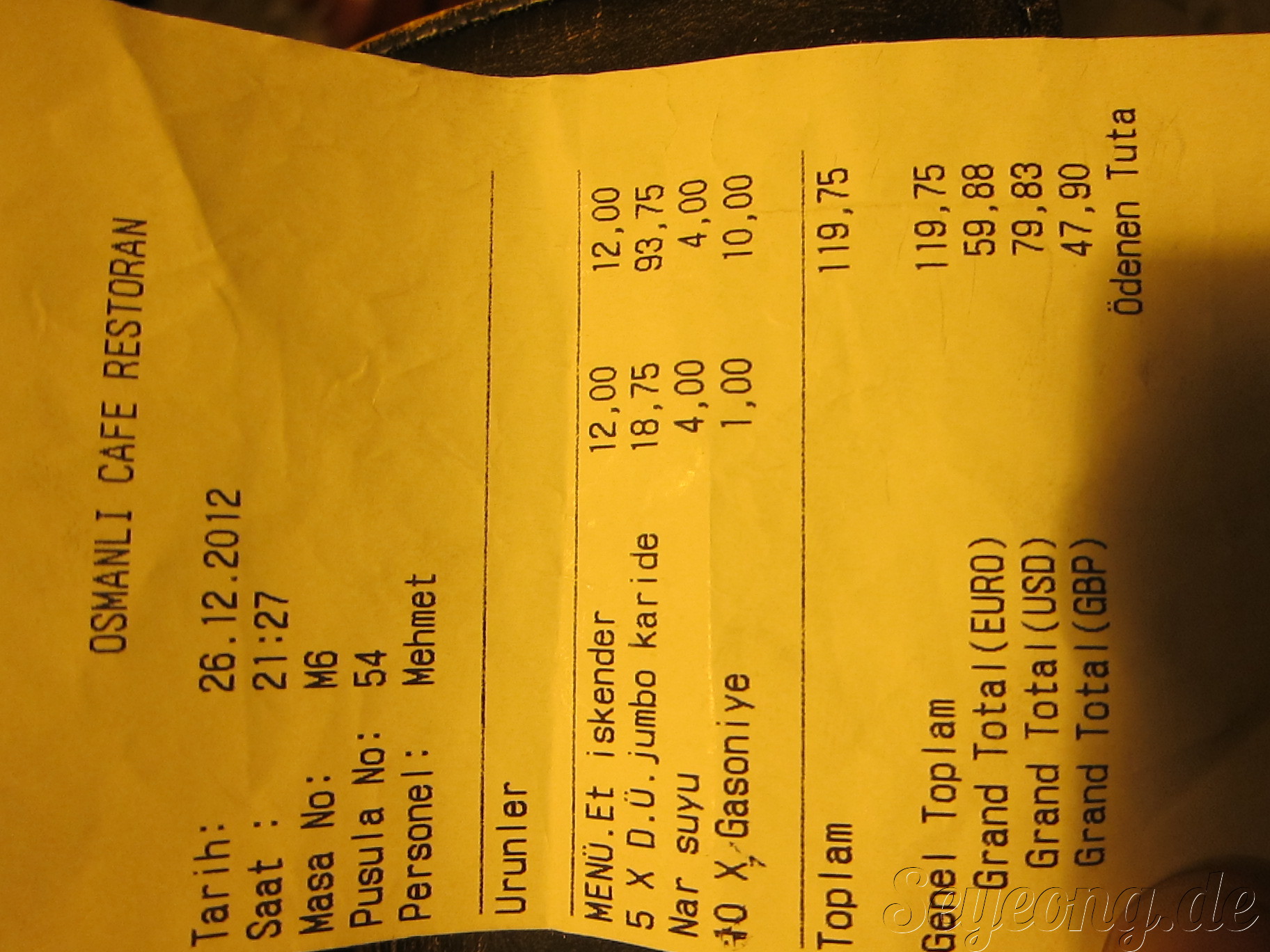 사실 이 레스토랑은 이런 사기로 관광객에게 돈 뜯어먹는 걸로 정통이 나있다. 투어리스트 오피스에 가서 이 상황을 보고 하고, 사진을 프린트하고 편지를 써서 터키 문화 관광부에 썼다. 이 글을 읽는 어느 누구든 거기엔 절대 가지 말라고 충고하고 싶다. 사기꾼 처럼 생긴 종업원과 주인도 짜증난다.