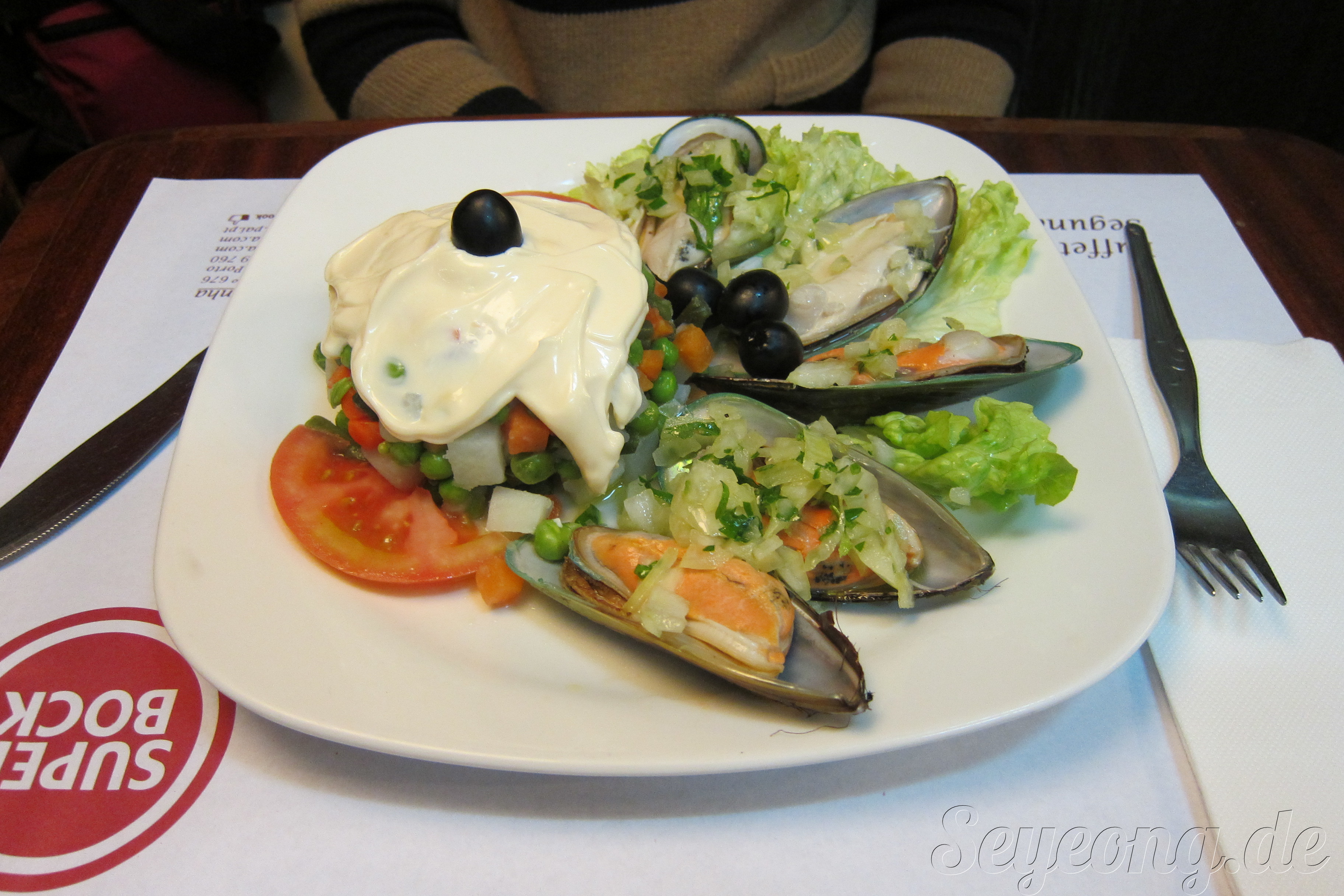나의 홍합 요리. 그린 소스와 마요네즈가 있는 샐러드와 함께 나왔는데, 이렇게 큰 홍합은 본적이 없는 듯 하다.