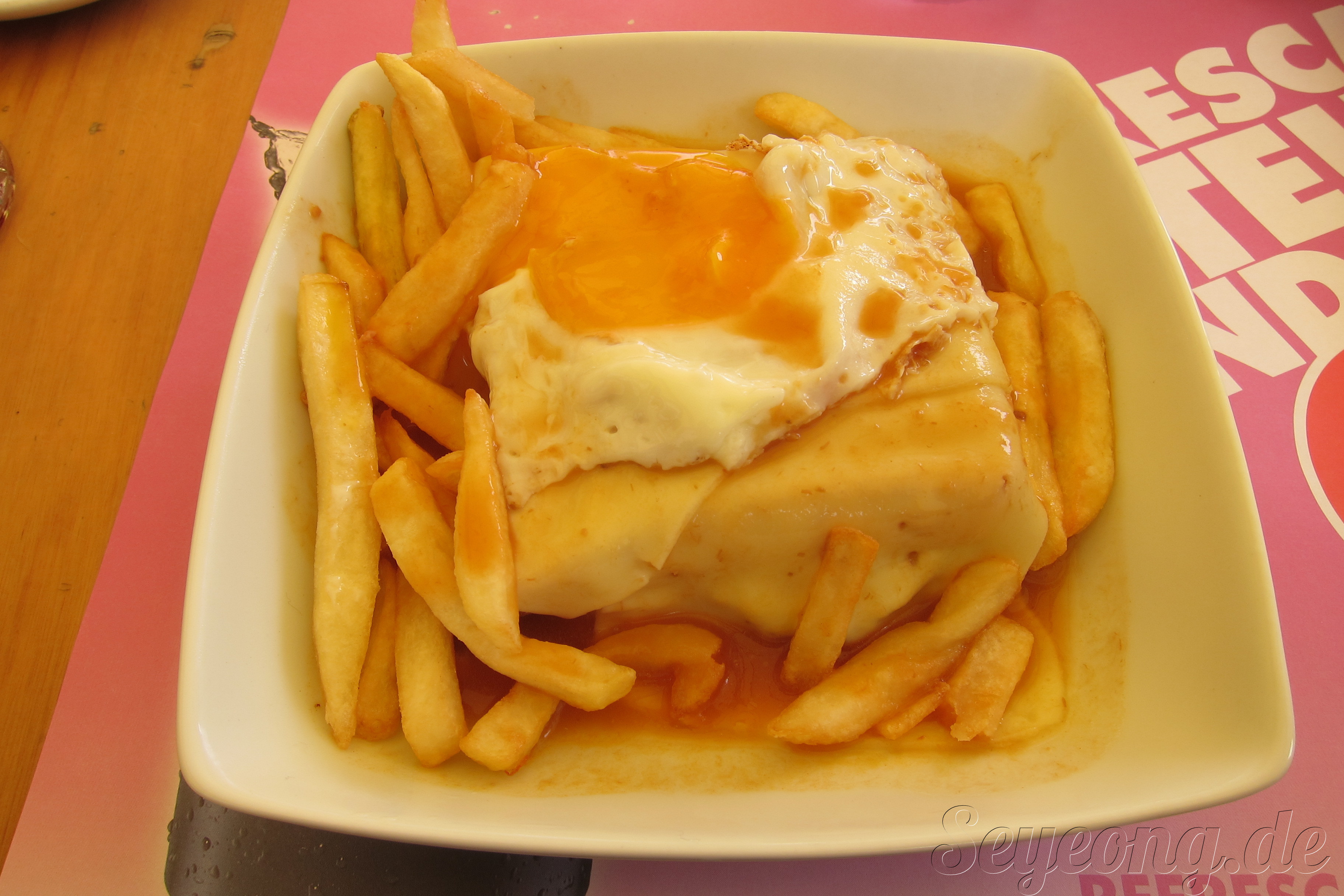 포르또에서 유명한 음식 프란체신아. 스테이크와 베이컨을 넣은 샌드위치에 계란 오믈렛과 계란을 감자 튀김과 함께 특별 소스와 같이 먹는 음식이다. 아니 이 샌드위치가 이렇게 유명한가는 나도 모르겠지만, 포르또에서만 먹어볼 수 있는 대표 명물이기도 하다.